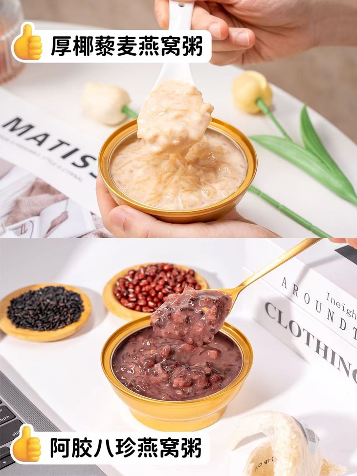✅ 固形物含量饱满,谷物颗粒分明,燕窝、阿胶用料看得见,口感清甜不齁,兼顾美味与营养