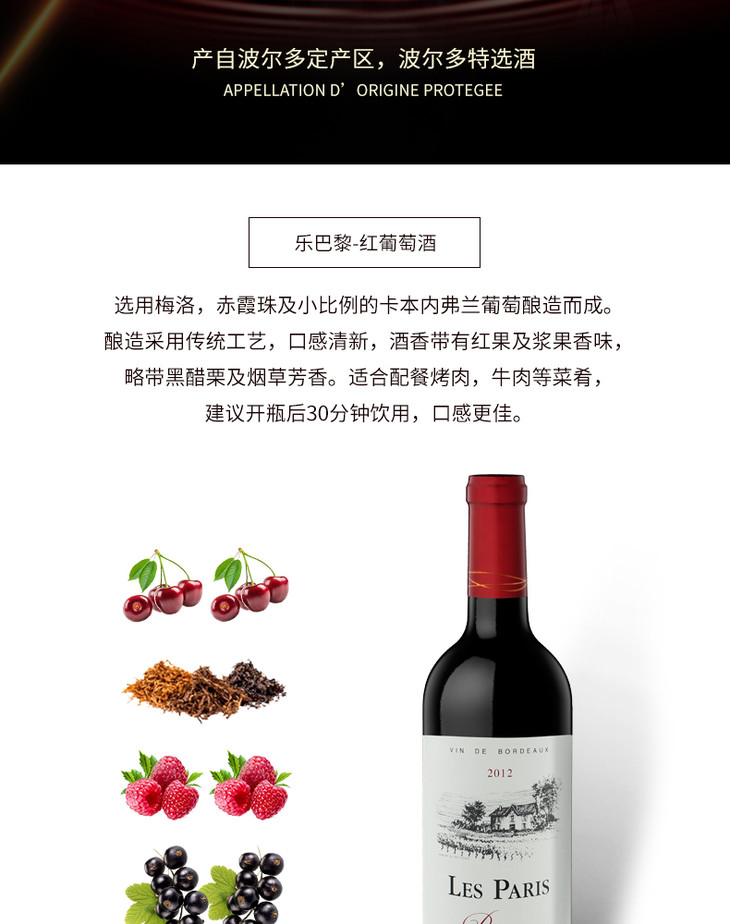 法国原瓶进口波尔多法定产区特选酒 乐巴黎红葡萄酒 Les Paris AOC整箱装750ml