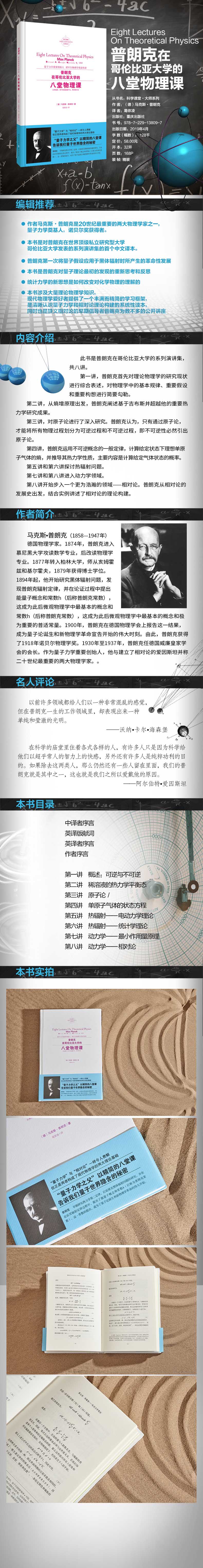 此书是普朗克在哥伦比亚大学的系列演讲集,共八讲。讲,普朗克首先对理论物理学的研究现状进行综合表述,对物理学中的基本规律、重要假设和重要构想进行简要勾勒。进而由能量守恒定律和热力学第二定律延伸至可逆性与不可逆性概念。普朗克认为,自然界中发生的所有反应,都可以划分为可逆过程与不可逆过程,并对其进行了详尽的阐释,很终引出“熵”的概念,然后结合克劳修斯的理论、热力学第二定律及其衍生理论,得出熵增原理。第二讲,从熵增原理出发,普朗克阐述基于吉布斯并超越他的重要热力学研究成果。这些成果涉及稀释定律,普朗克就此给出了明确的关系式。第三讲,对原子论进行了深入研究。普朗克认为,只有通过原子论,才能将所有物理过程划分为可逆过程和不可逆过程,即不可逆性必然引出原子论。普朗克以此为出发点,将原子论引入物理体系,通过类比概率阐释原子论。普朗克随后将其引入热辐射理论,为确保客观性,以宏观和微观两大视角解读热力学第二定......