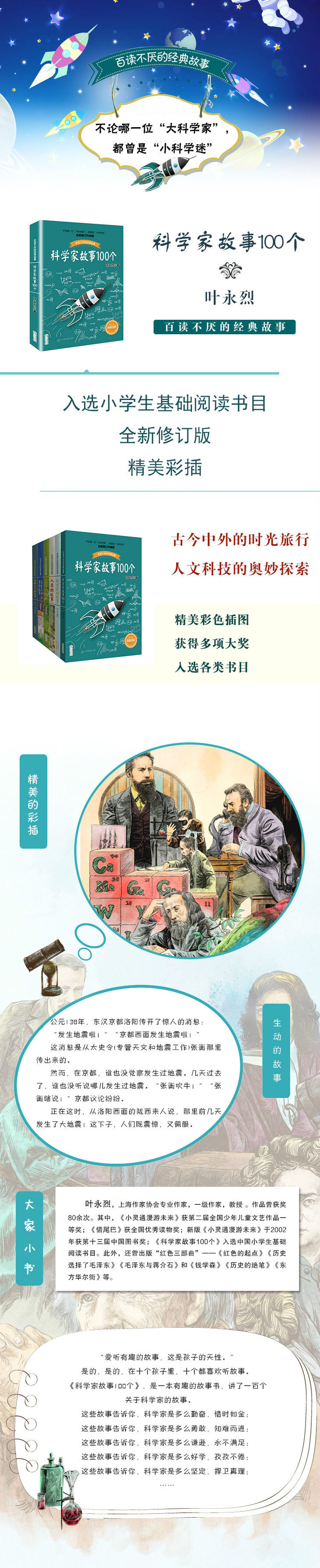 《科学家故事100个》是一本有趣的故事书,讲述了一百多个关于科学家的故事。科学家的一生是漫长的。《科学家故事100个》只选取了科学家一生中有趣的一个故事,仿佛用照相机拍下科学家一生中精彩的镜头。《科学家故事100个》已被列入由新闻出版广电总局、新阅读研究所推荐的中国小学生基础阅读书目三十种之一。