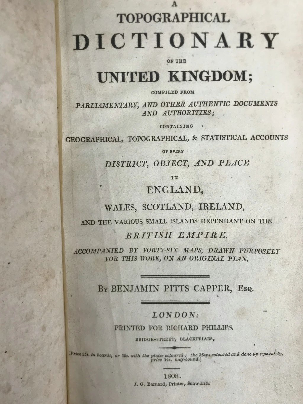 1808年 本杰明·皮茨·卡珀《联合王国地名辞典》 真皮精装32开