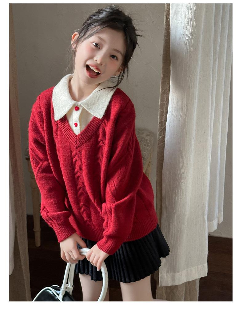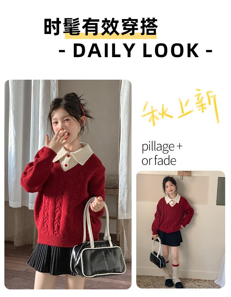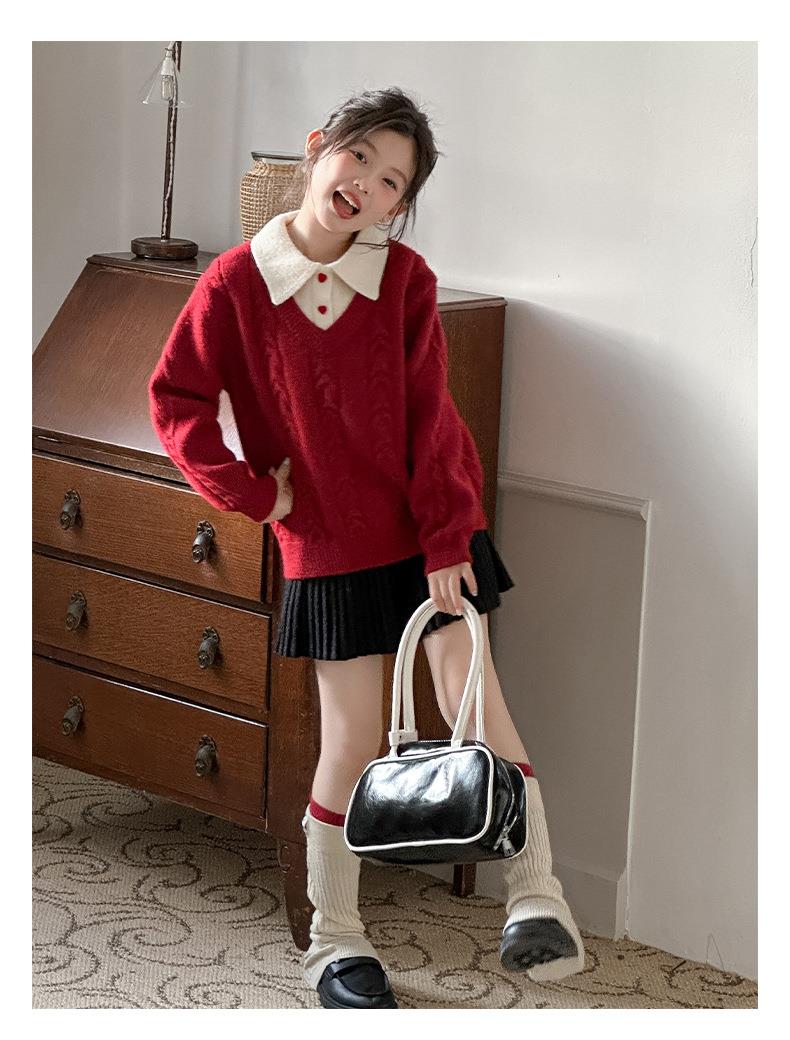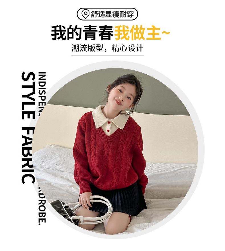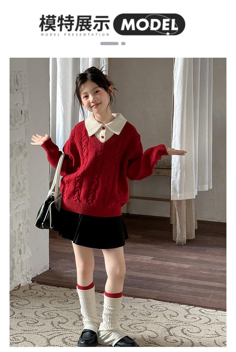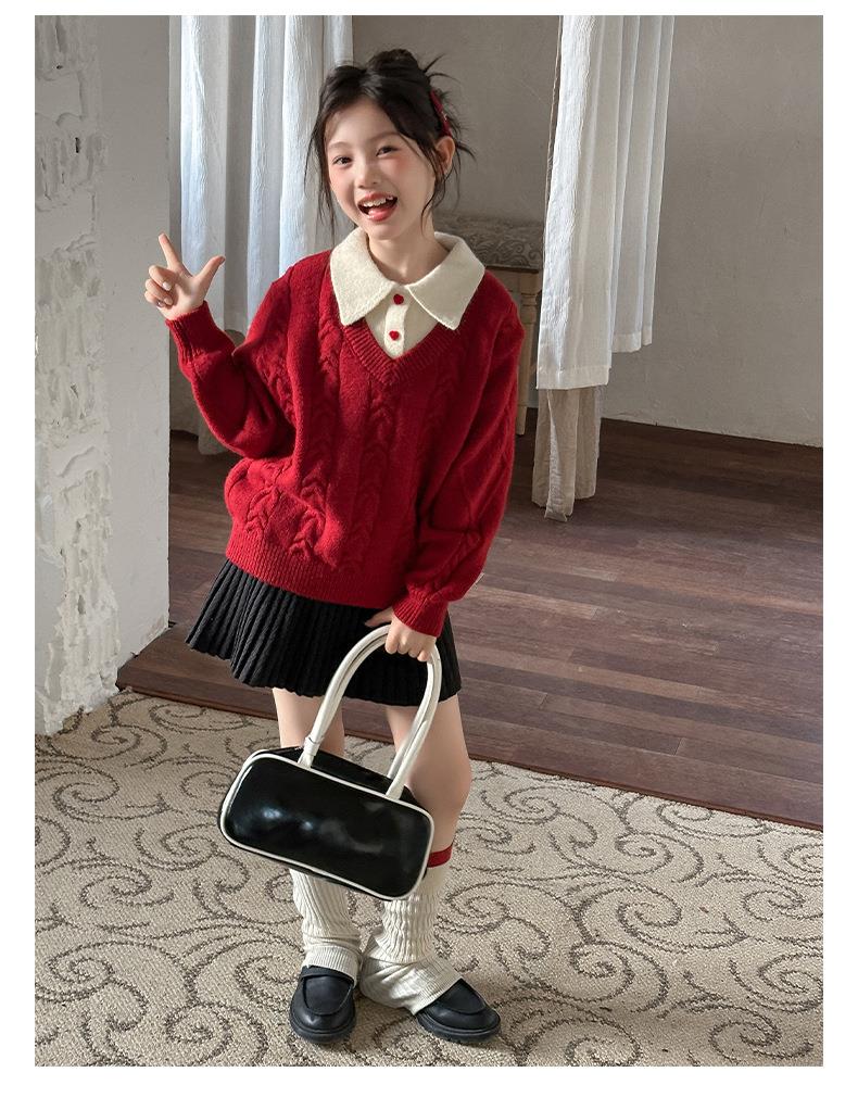女童学院风毛衣秋冬新款儿童装洋气红色新年服女孩针织衫