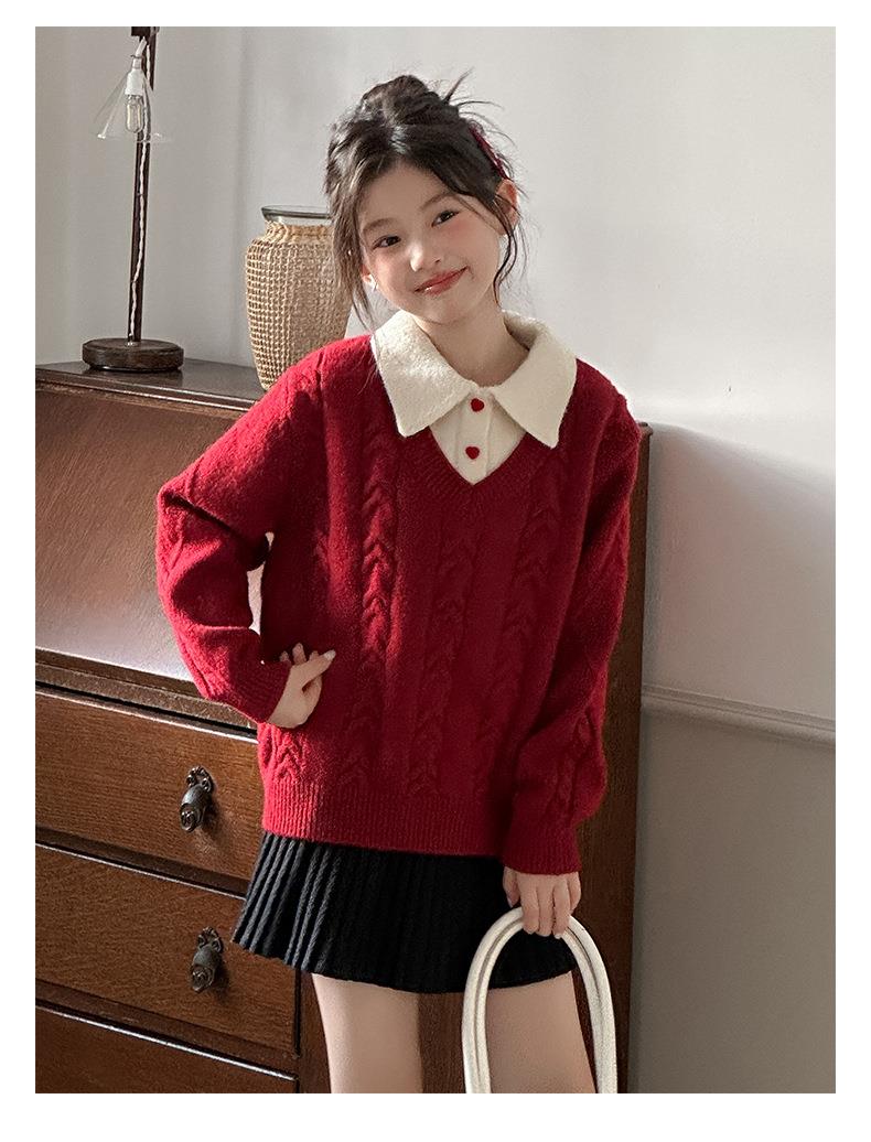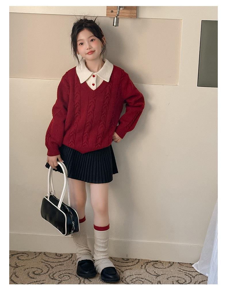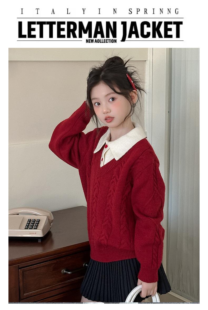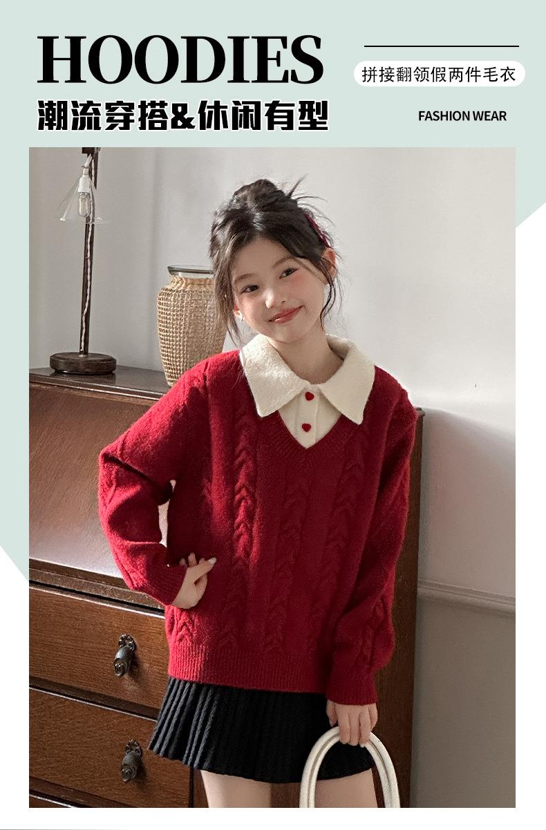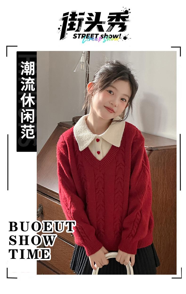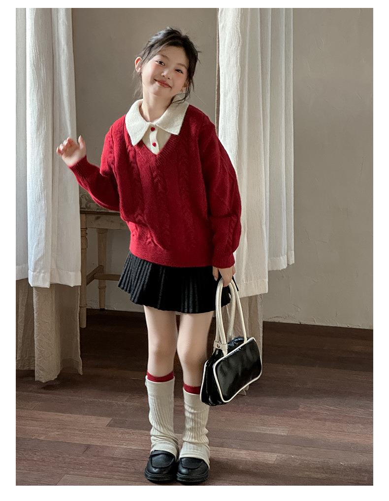 女童学院风毛衣秋冬新款儿童装洋气红色新年服女孩针织衫