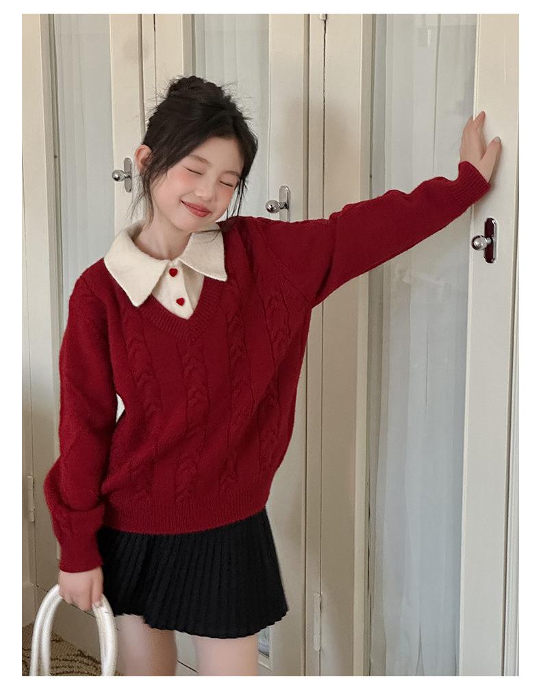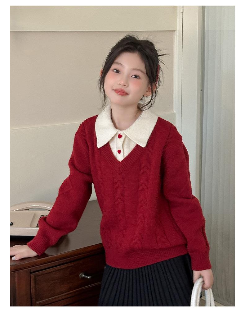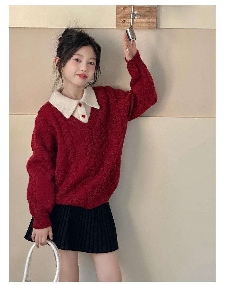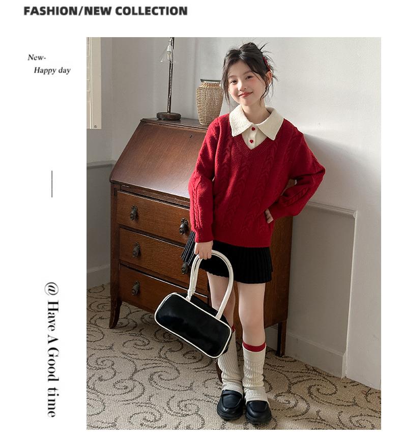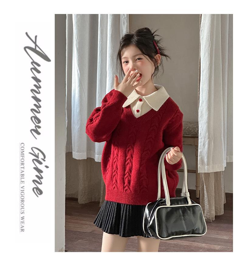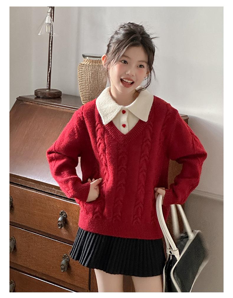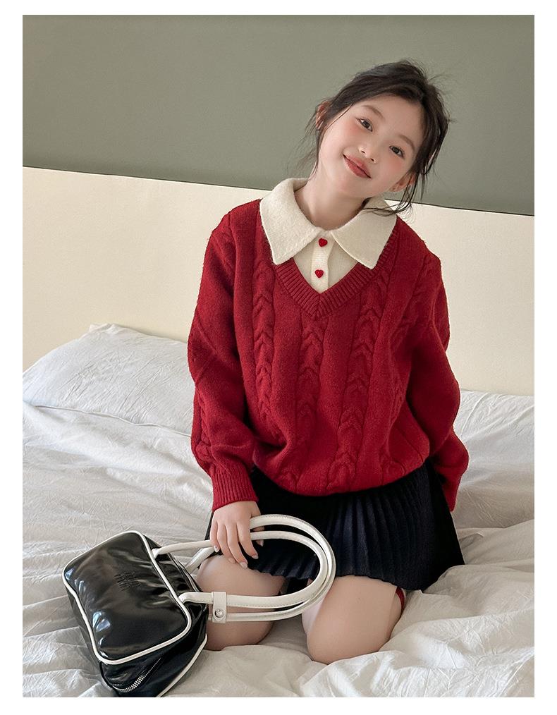 女童学院风毛衣秋冬新款儿童装洋气红色新年服女孩针织衫
