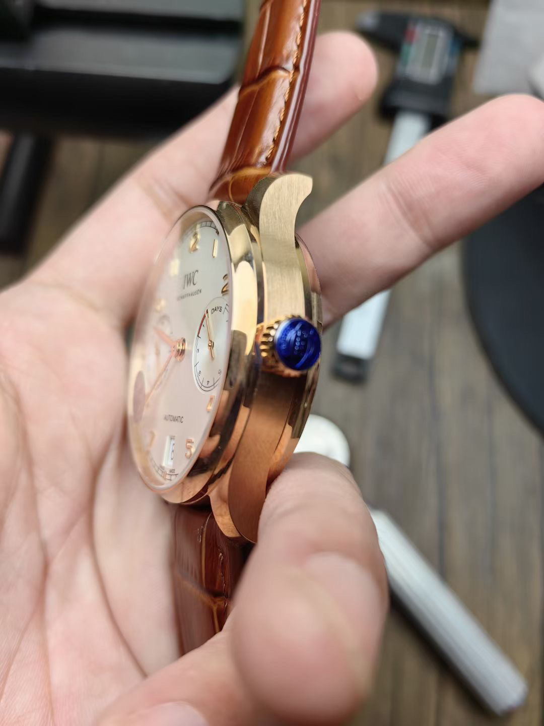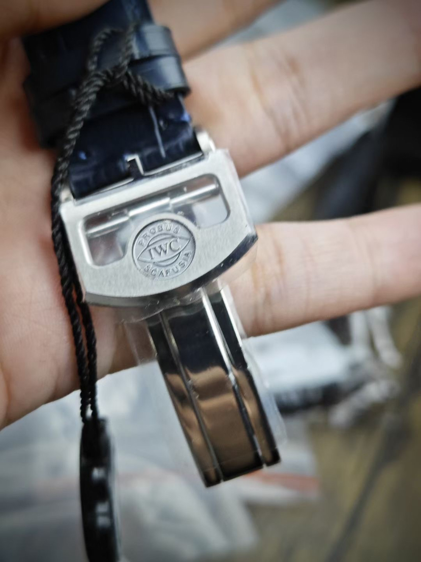 表冠上刻有经典的大IWC标志,可识度很高。嵌入式立体数字刻度,让整个表盘看起来动感十定。
