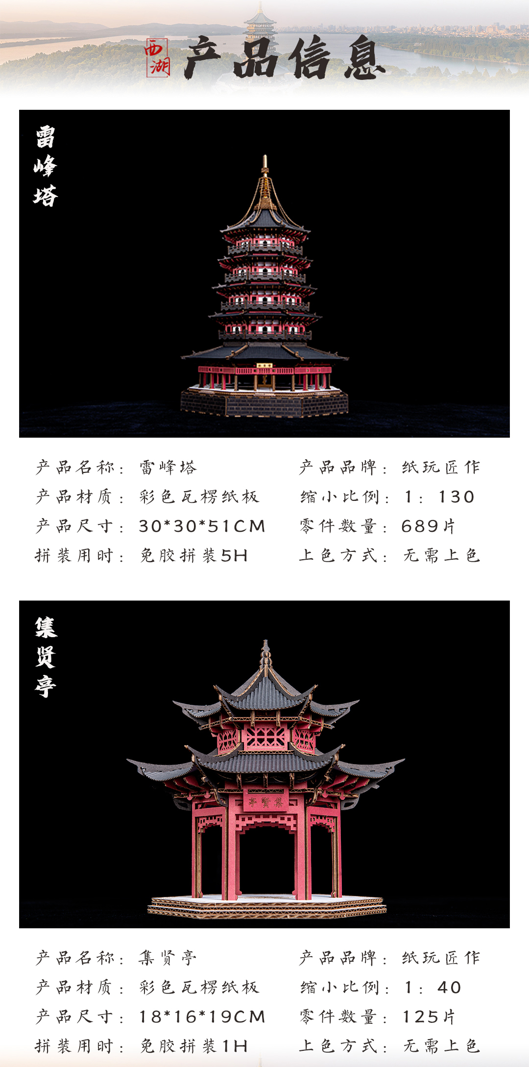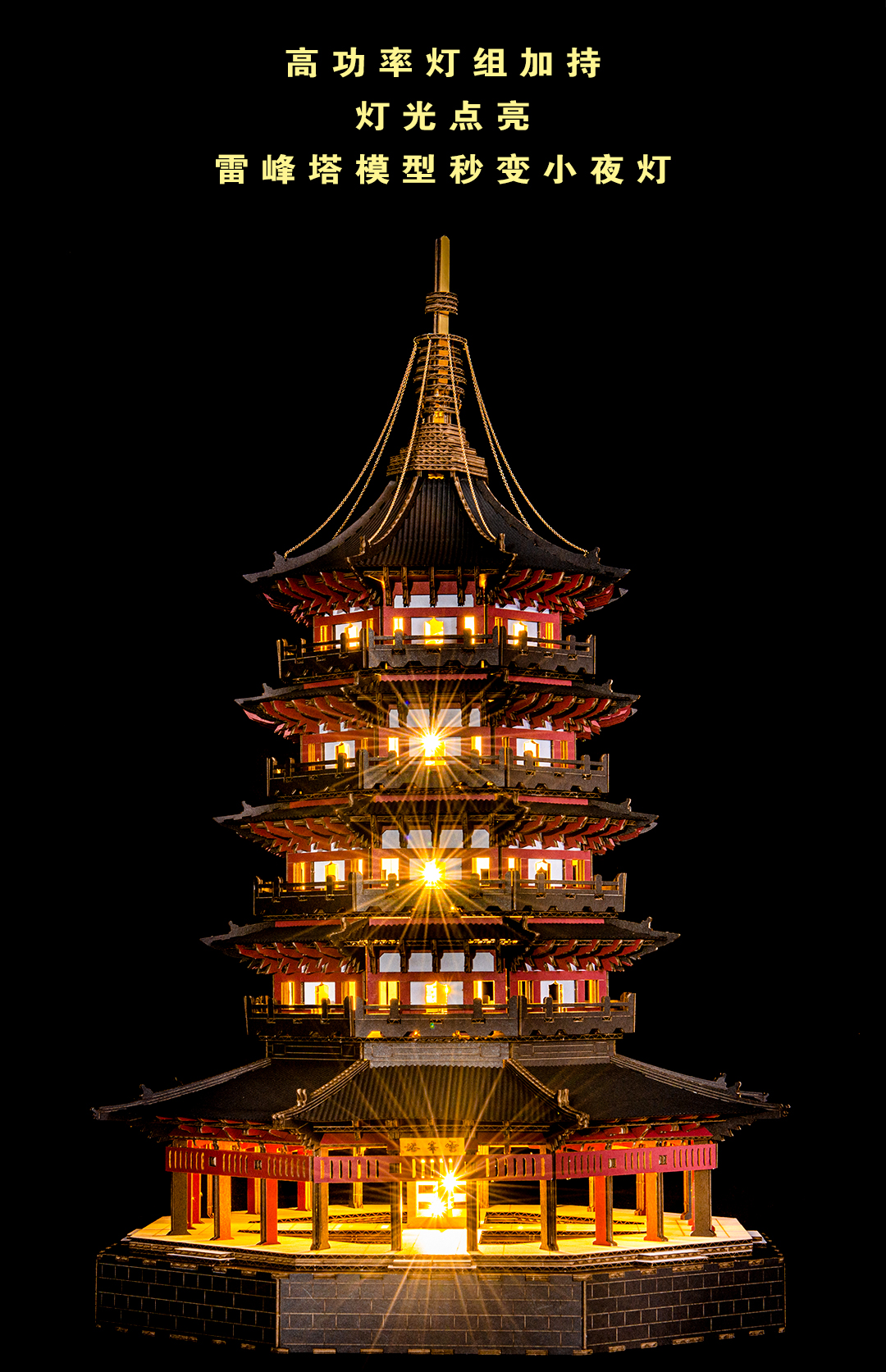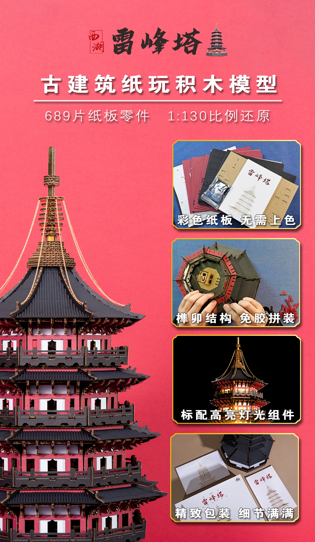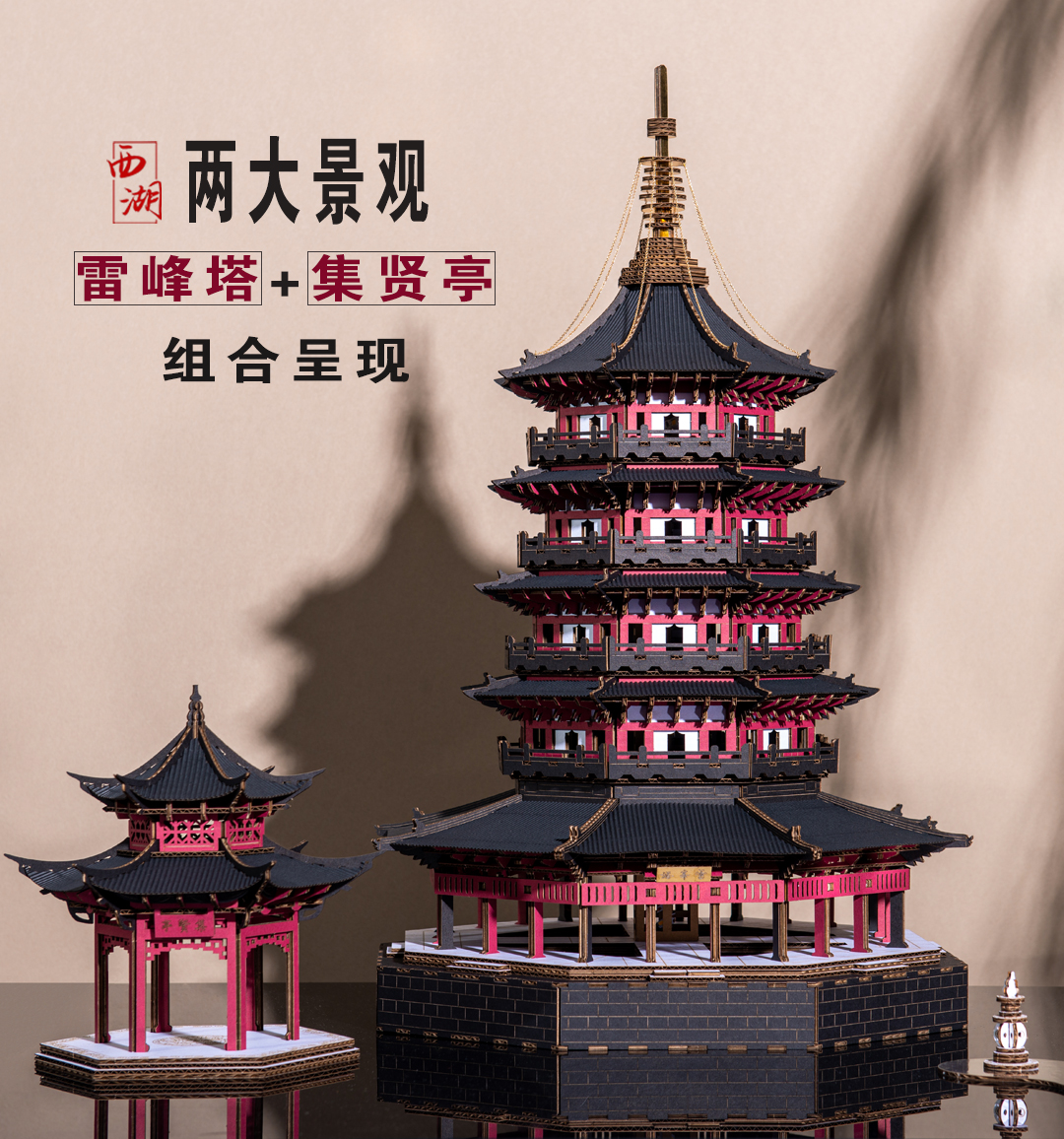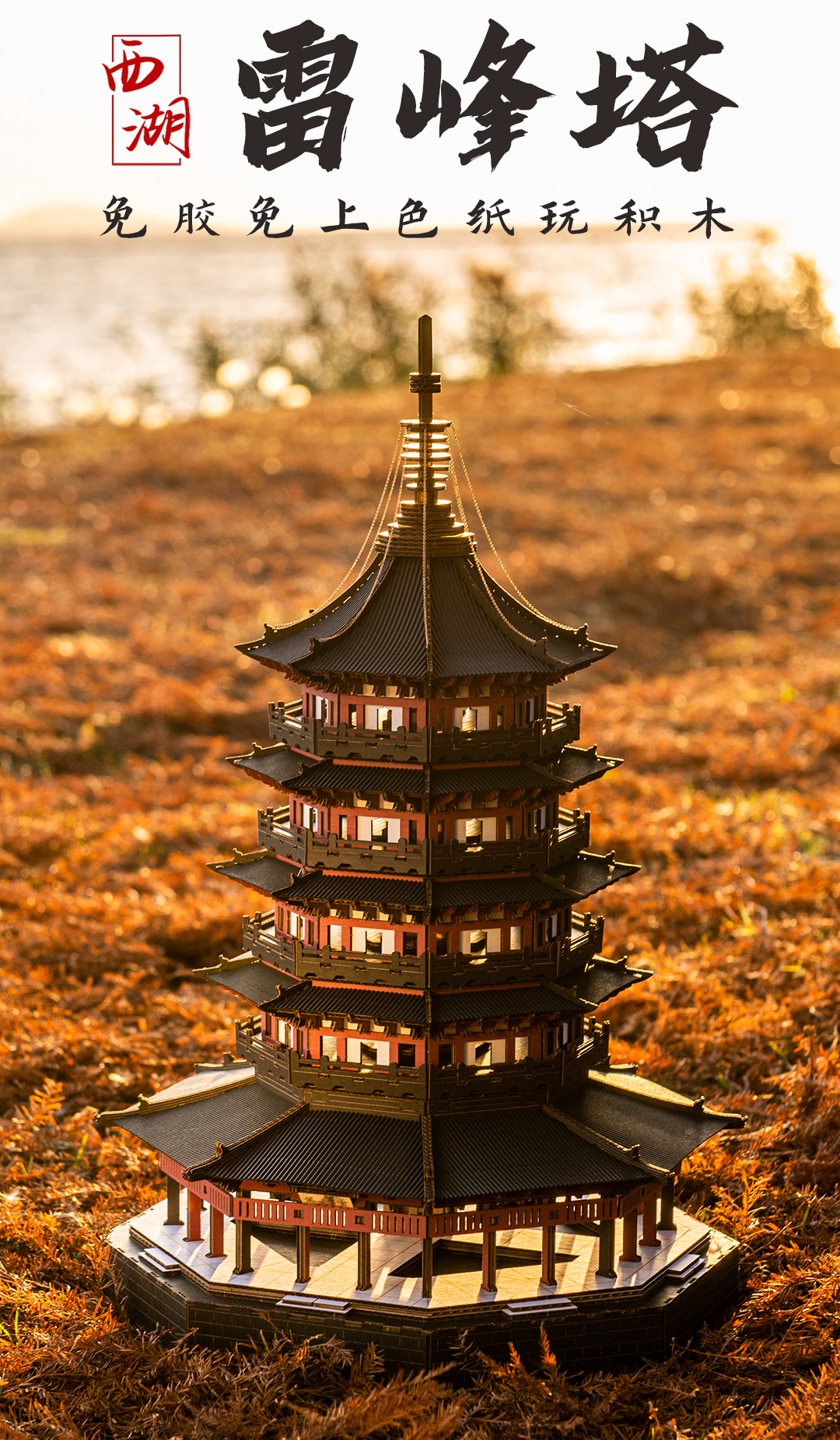 杭州西湖雷峰塔中国古建筑榫卯积木玩具古风拼装国潮纸玩模型礼物