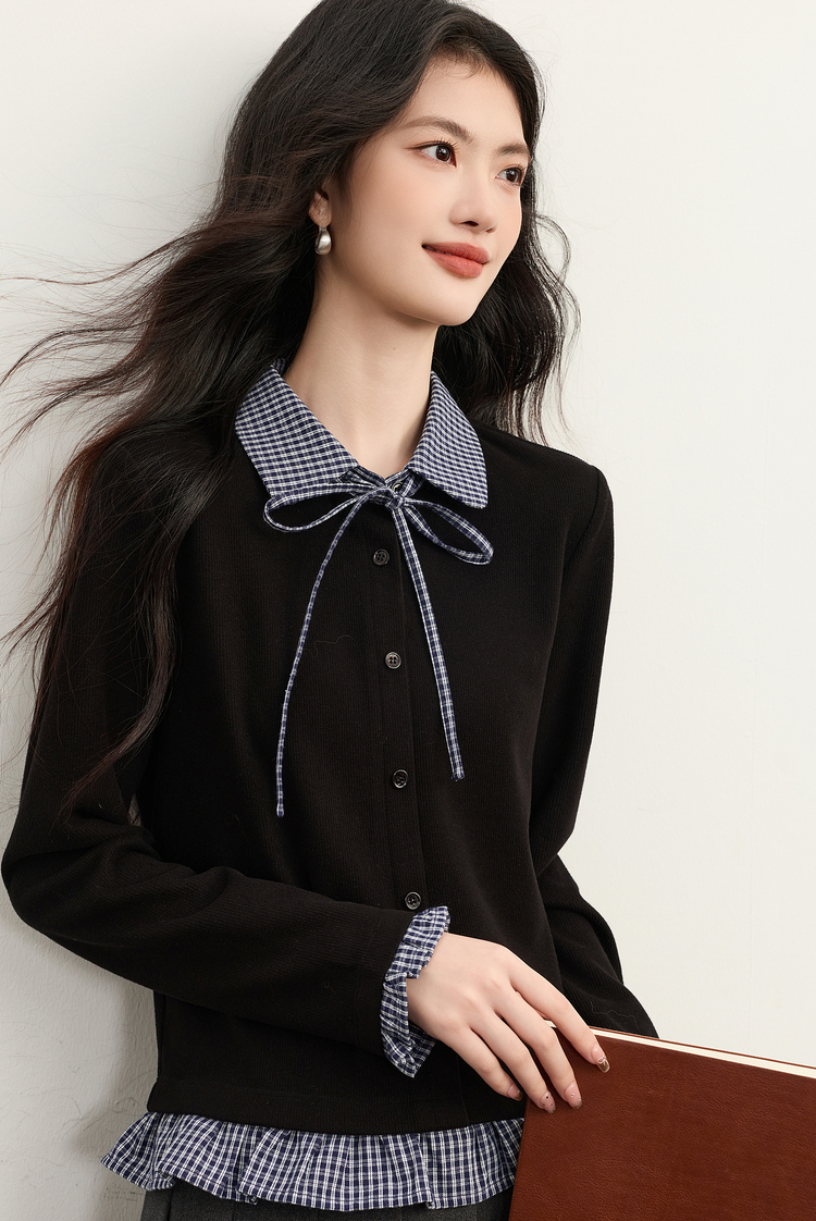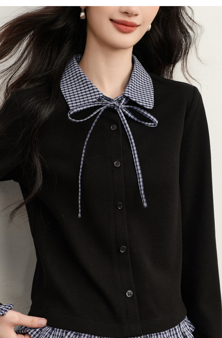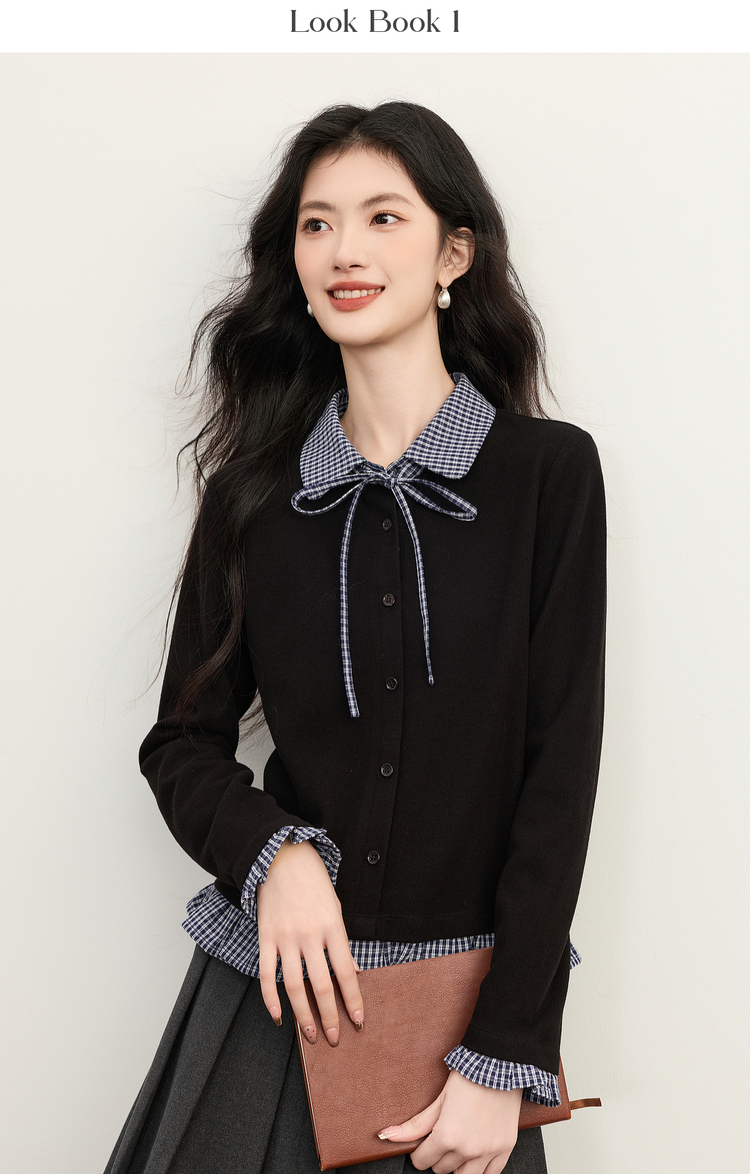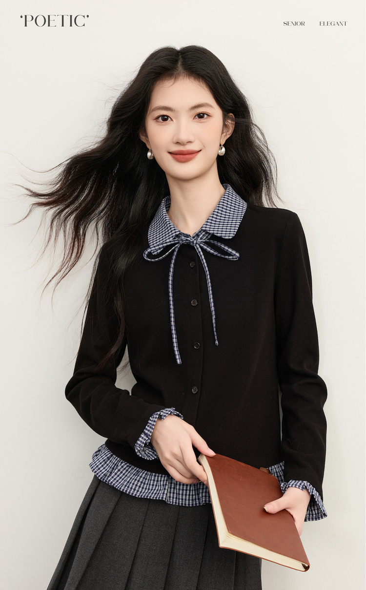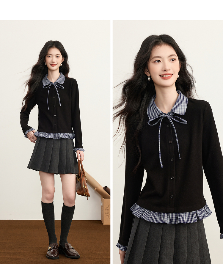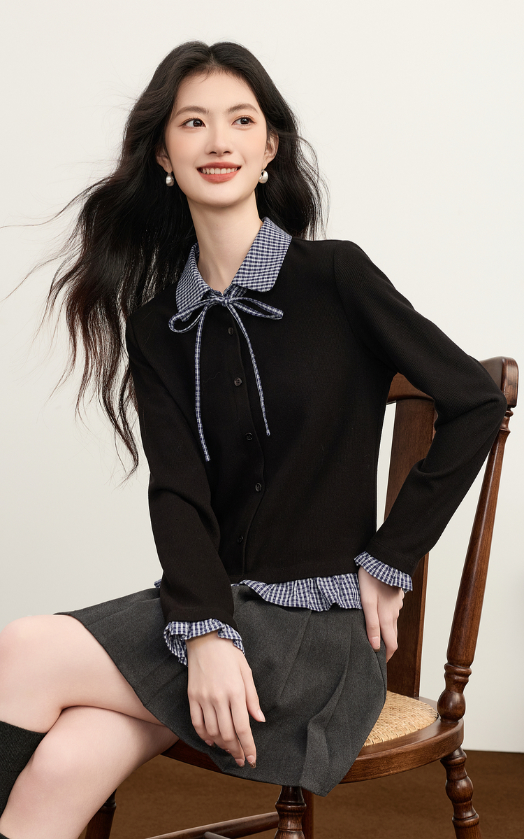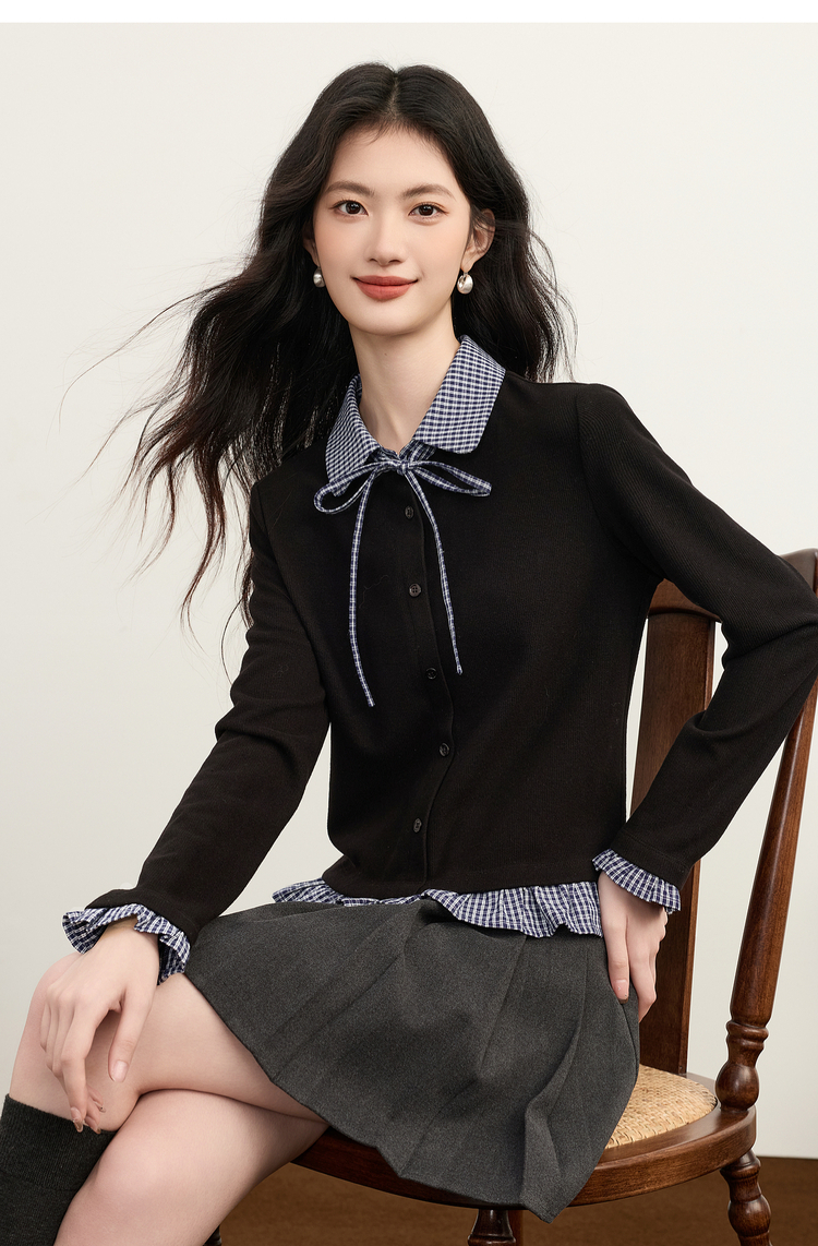 【周末秒杀】熙世界英伦学院风假两件针织开衫女2025年新款秋冬格纹Polo领上衣
