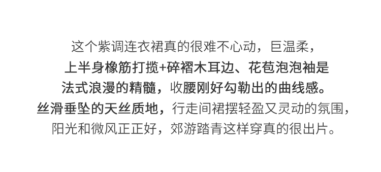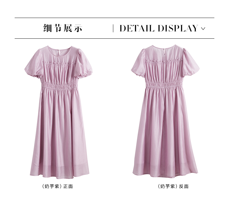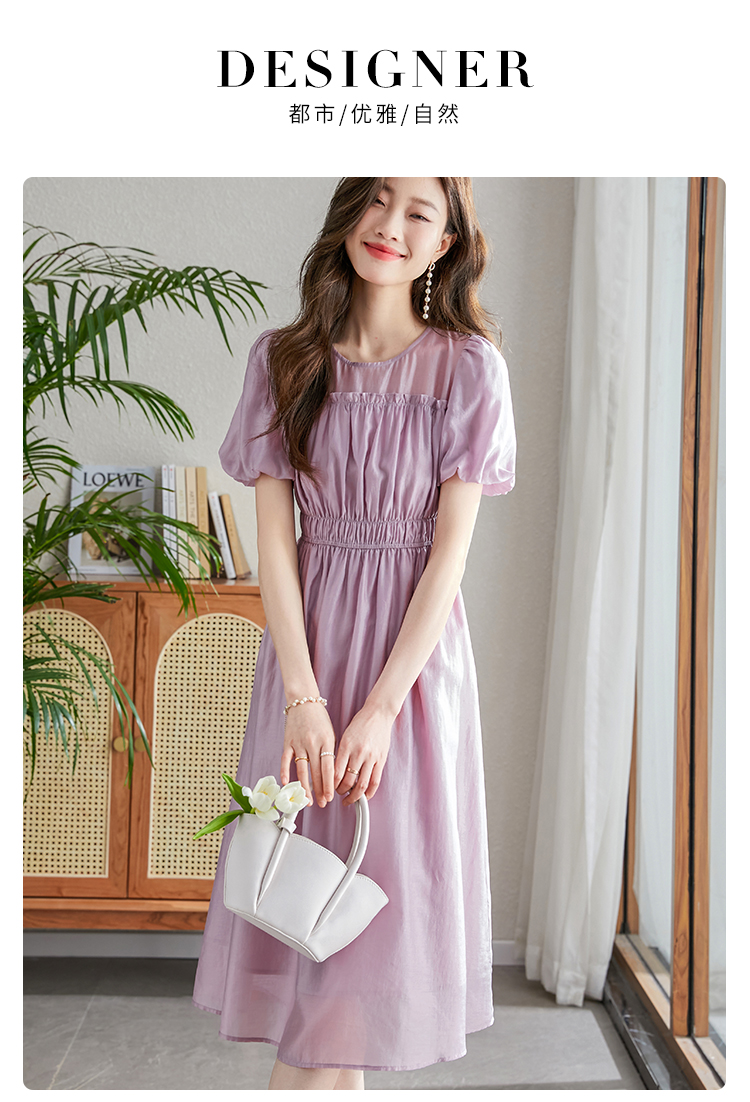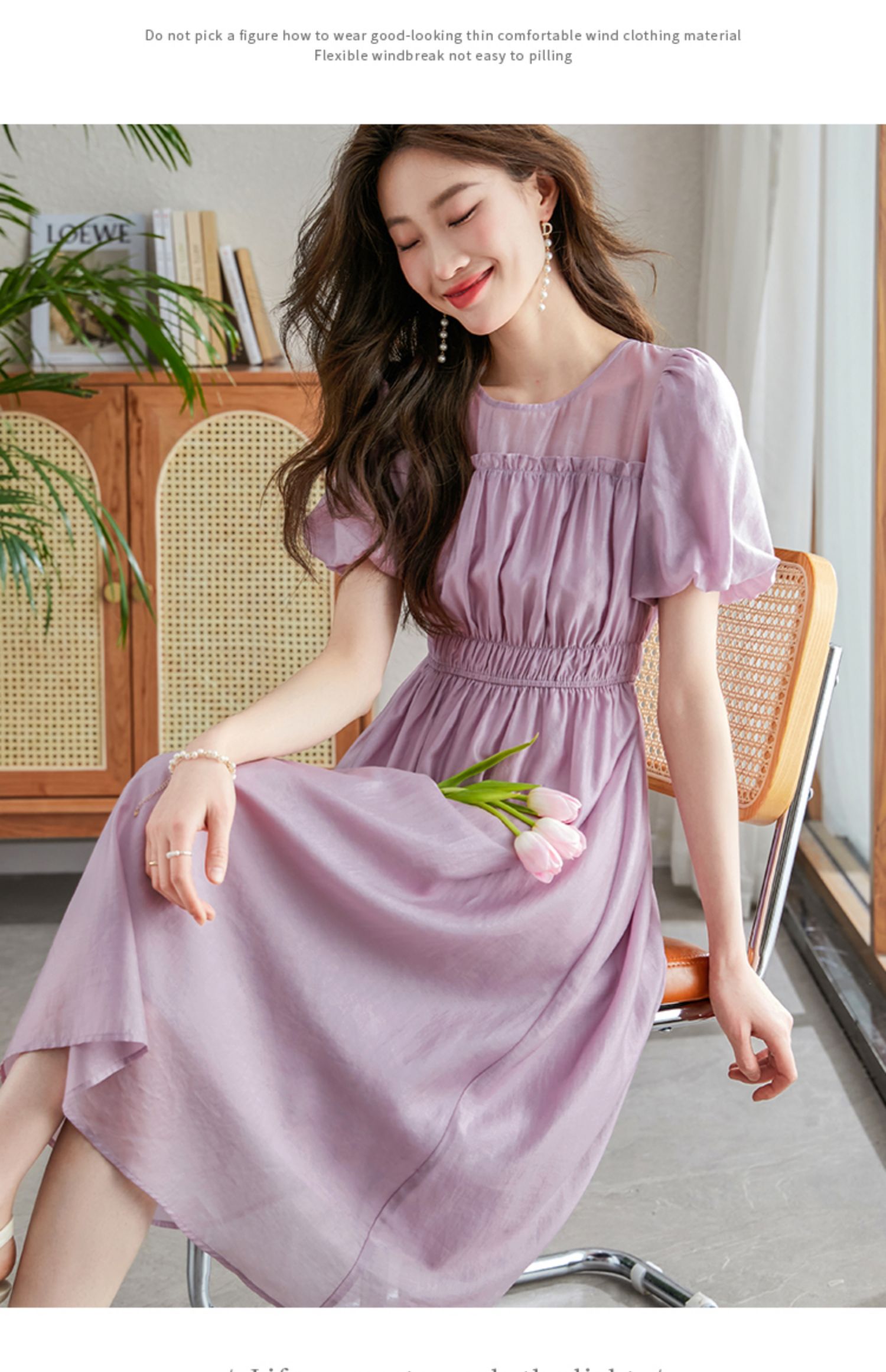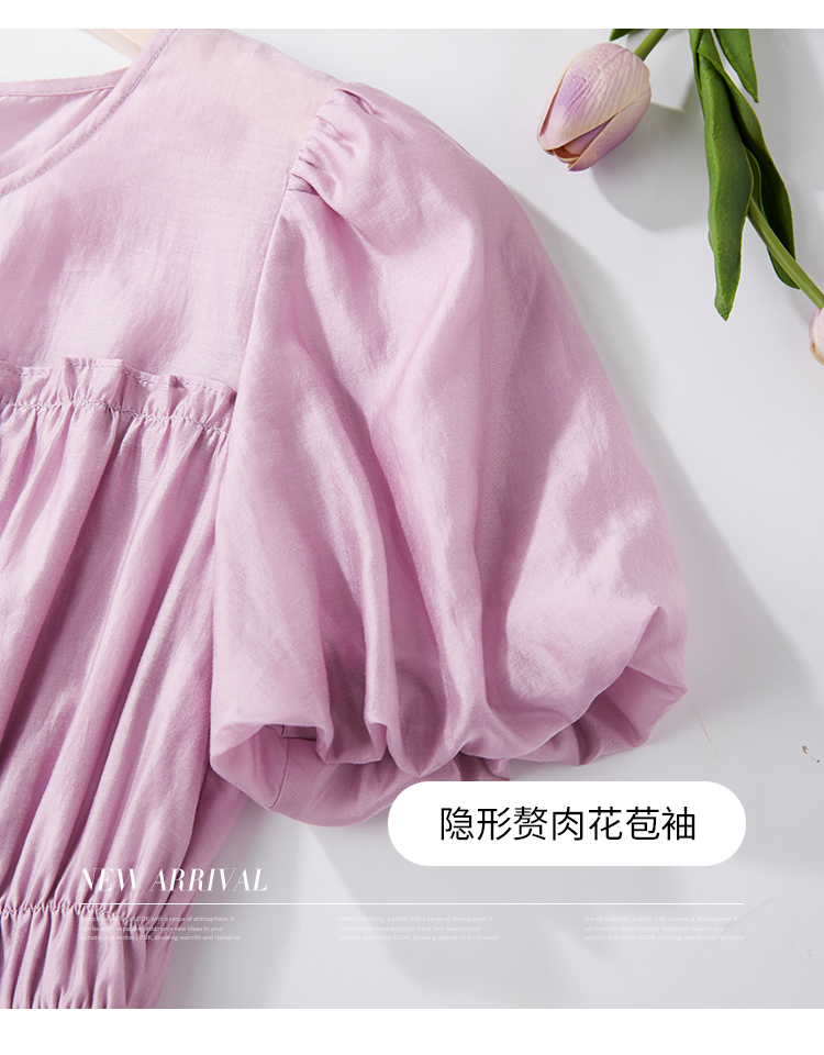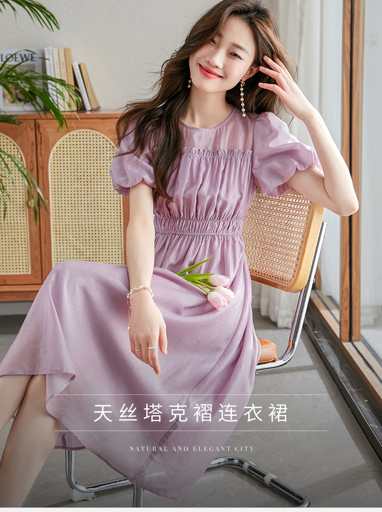 【专属特价】熙世界天丝褶皱紫色连衣裙女夏2025年新款法式花苞泡泡袖收腰裙子
