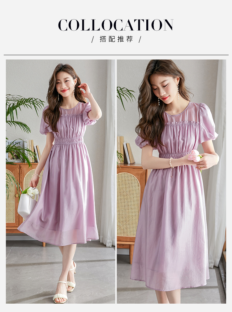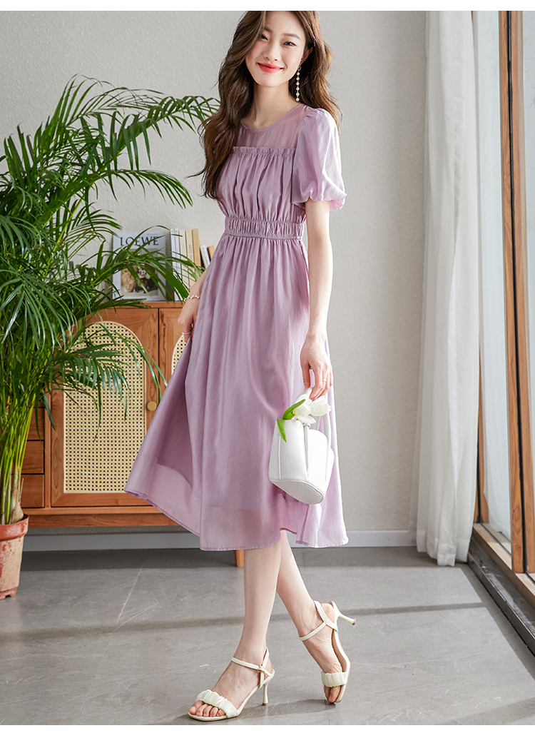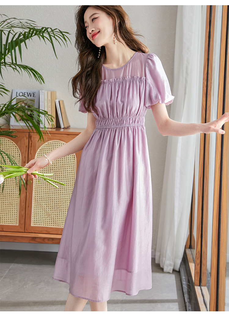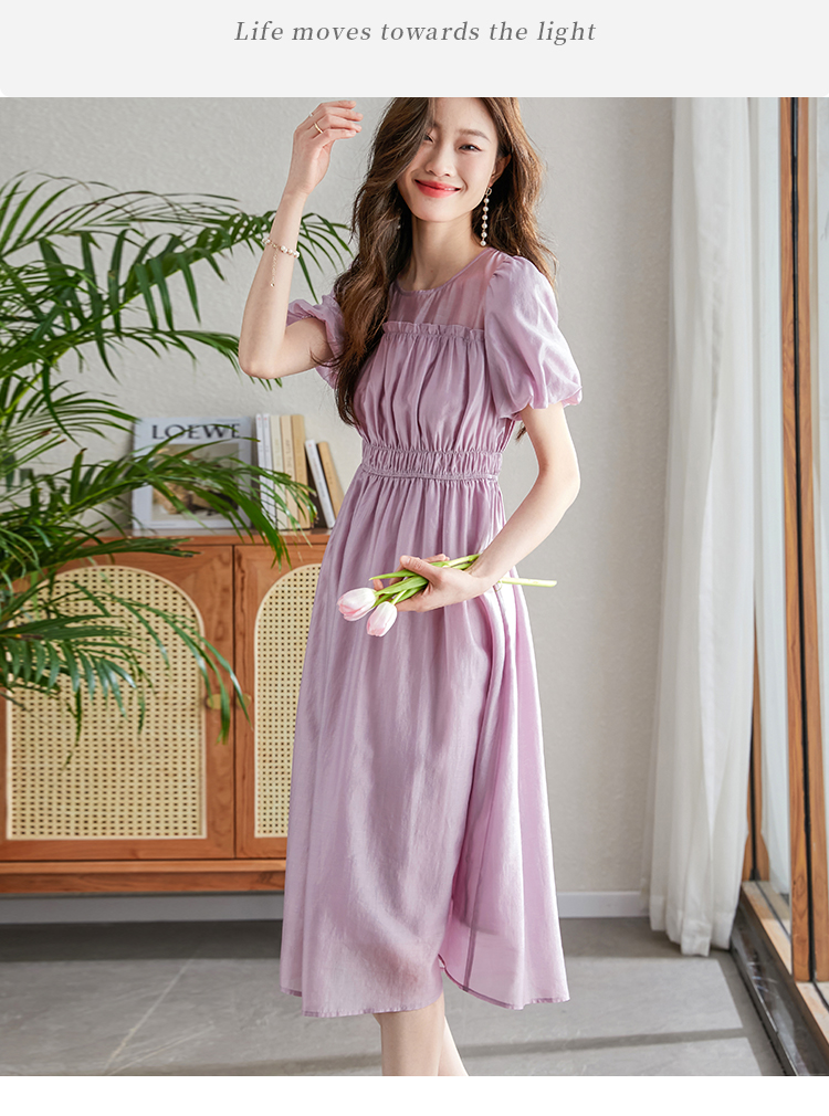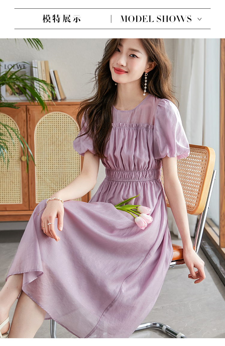 【专属特价】熙世界天丝褶皱紫色连衣裙女夏2025年新款法式花苞泡泡袖收腰裙子