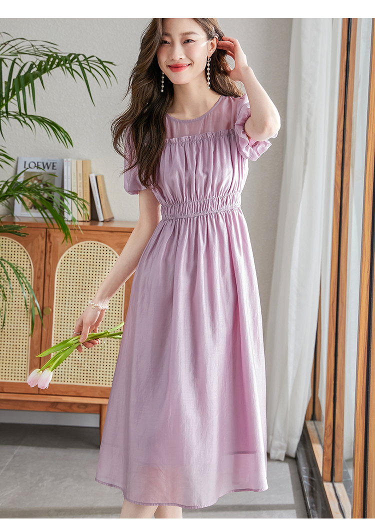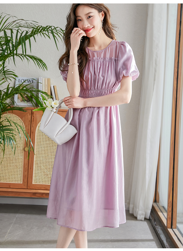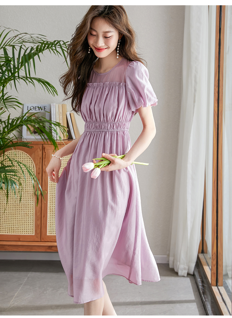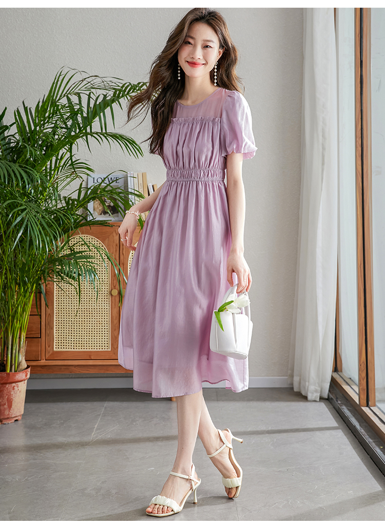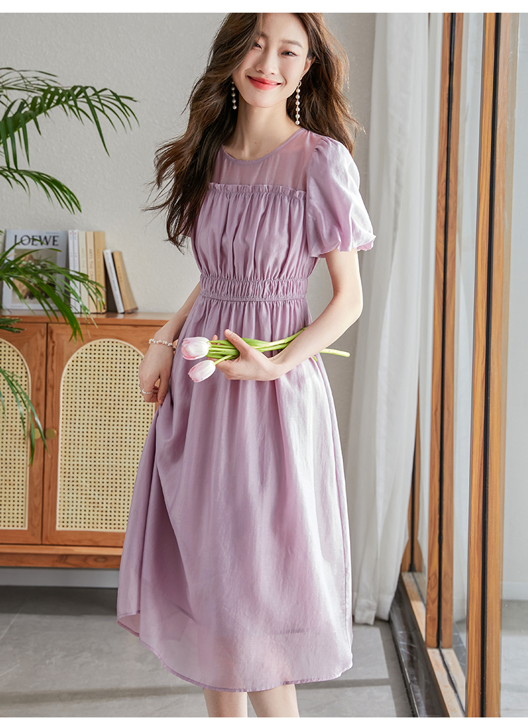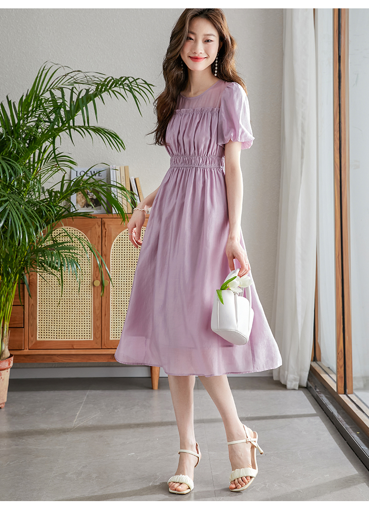 【专属特价】熙世界天丝褶皱紫色连衣裙女夏2025年新款法式花苞泡泡袖收腰裙子