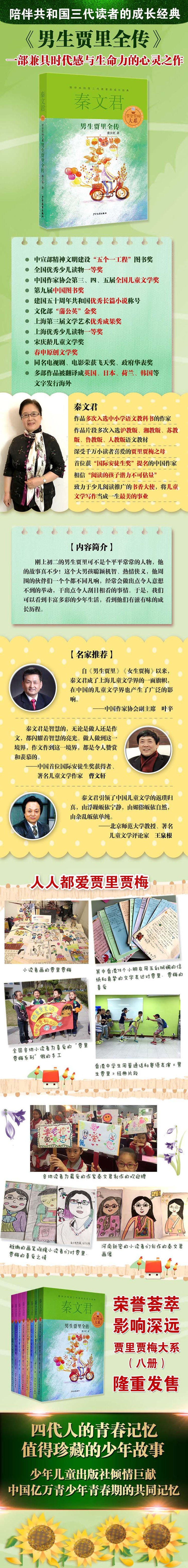 秦文君,深受千万小读者喜爱的儿童文学作家,现为中国作家协会全国委员会委员,上海市作家协会副主席,上海中日儿童文学美术交流协会会长,上海少儿读物促进会理事长。1982年发表处女作,著有长篇小说《男生贾里全传》《女生贾梅全传》《一个女孩的心灵史》《天棠街3号》《小香咕全传》《16岁少女》等五百余万字。1996年获意大利蒙德罗国际文学奖特别奖,2002年获国际青少年读物联盟(IBBY)的“国际安徒生奖提名奖”。《宝贝当家》《男生贾里全传》《云裳》先后获中宣部精神文明“五个一工程”奖,《男生贾里全传》获“共和国五十年优秀长篇小说”称号,《秦文君文集》《天棠街3号》等获全国优秀少儿读物一等奖,《少女罗薇》《男生贾里》《小鬼鲁智胜》获中国作协全国儿童文学奖。其他作品分别获宋庆龄儿童文学优秀小说奖、冰心儿童图书奖、中国图书奖、国家图书奖提名奖、中华儿童文学奖、儿童文学园丁奖、上海文学艺术优秀成果奖、上海青年文学奖、台湾杨唤儿童文学奖、台湾九歌文学奖等近50种奖项。作品10余次被改为电视电影播映,并获飞天奖和华表奖。不少作品被译为英、日、荷兰、韩等文字发行海外。