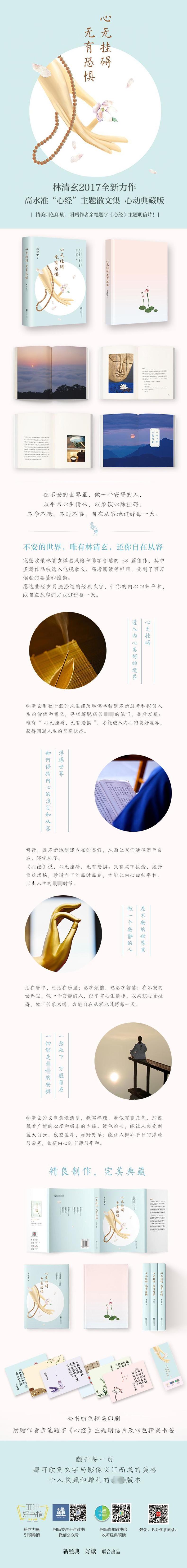 《心无挂碍无有恐惧》是林清玄2017全新力作,也是其禅意散文的高水准体现,完整收录林清玄禅意风格和佛学智慧的58篇佳作,横跨林清玄四十六载创作生涯。《心无挂碍无有恐惧》共分为六辑,包括自在安然、一心一境、日子如莲、尘世牛马、正心修身、草木有情等六大人生主题,为内心浮躁者提供禅意的安抚和生命的启示。其中多篇作品被选入电视散文、高考阅读等栏目,受到了百万读者的喜爱和推崇。