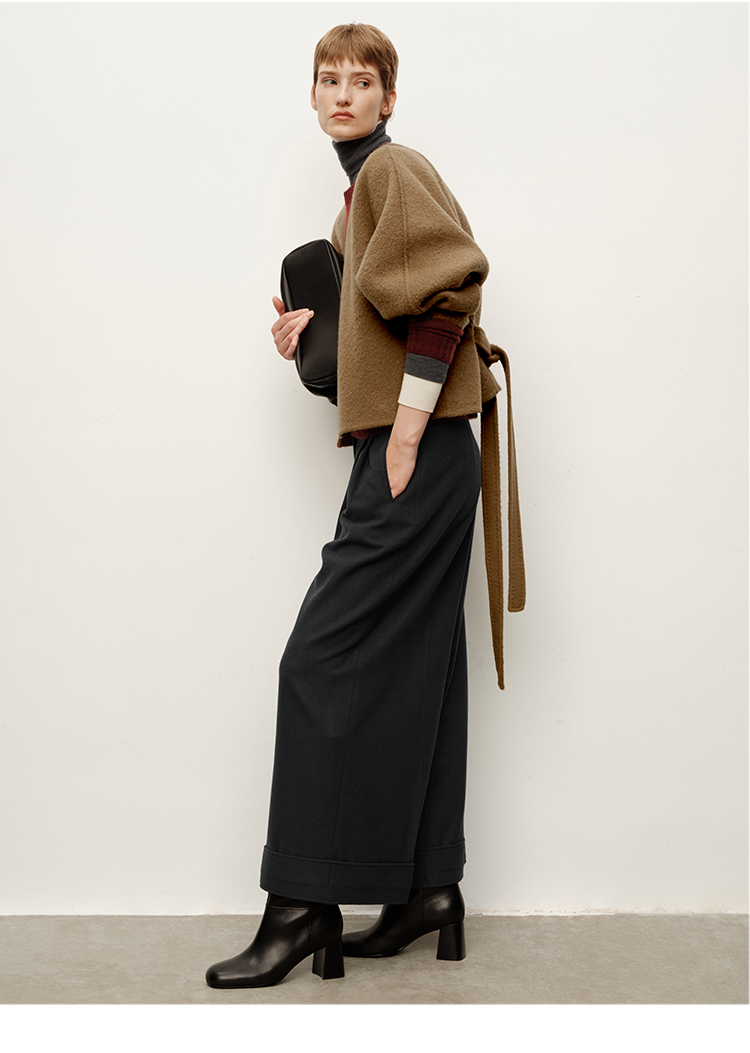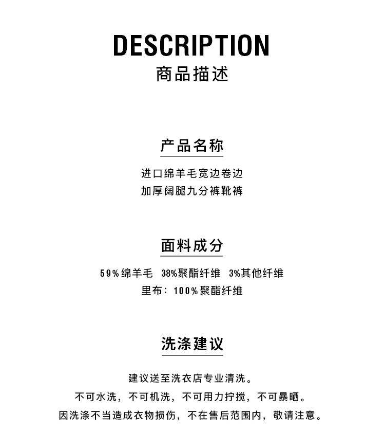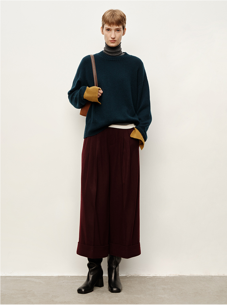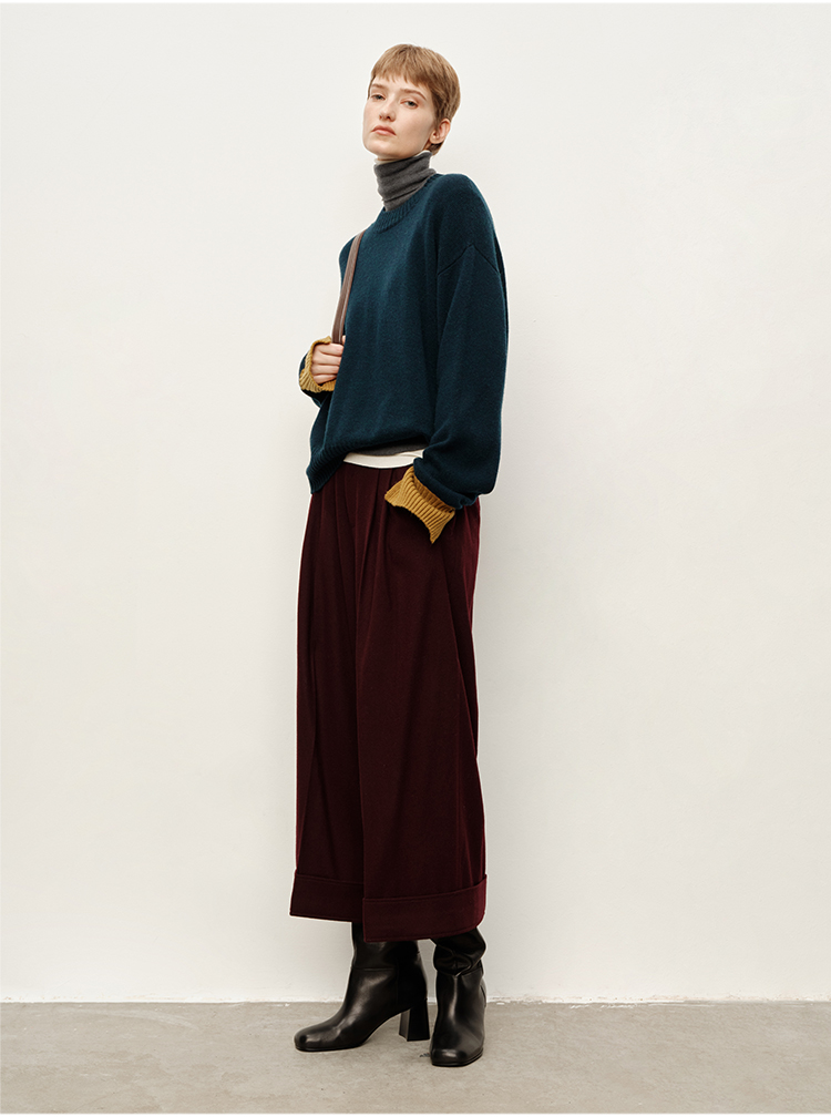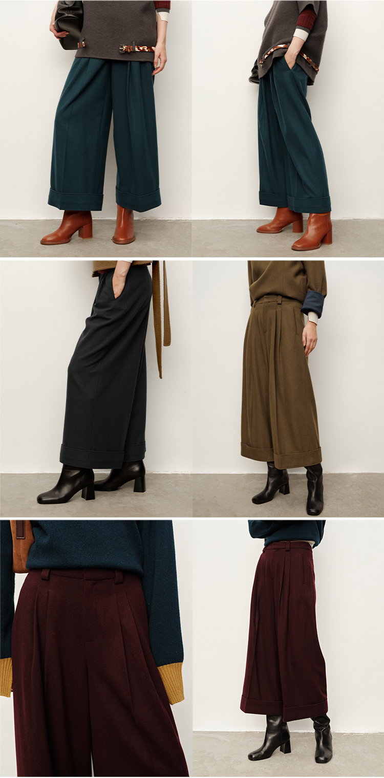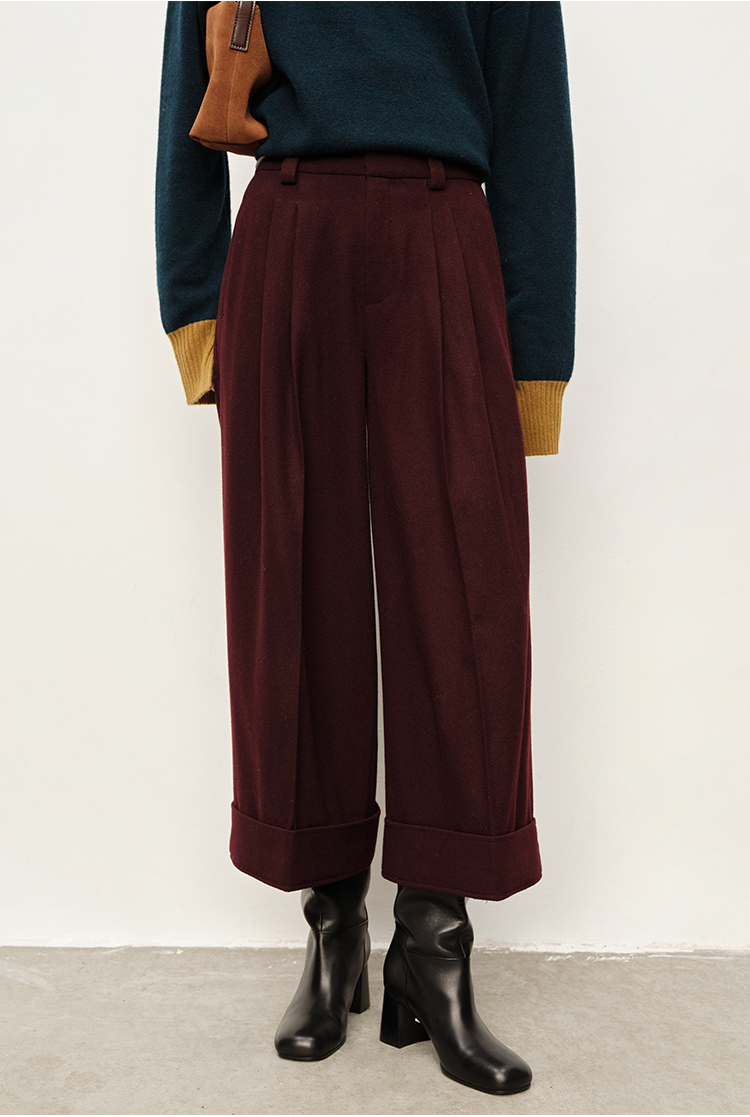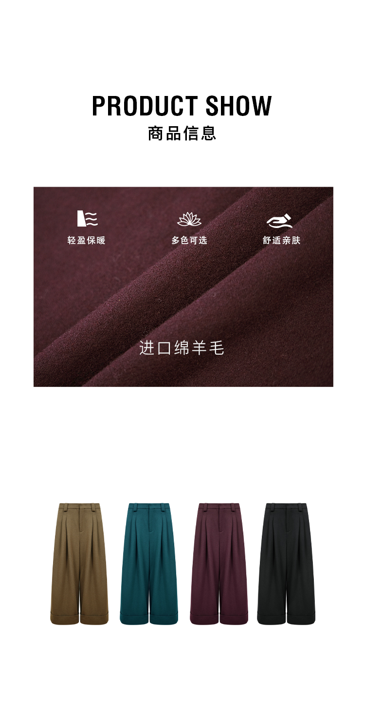 HIDEMI 进口绵羊毛宽边卷边加厚阔腿九分裤靴裤 宝石蓝