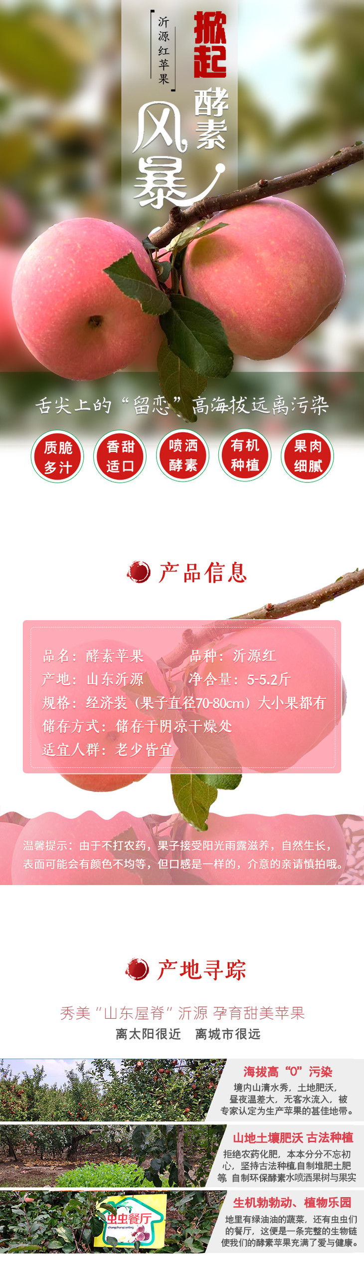 选用酵素种植的沂源红苹果,北纬36℃东经118℃,土壤为壤土、砂壤土,富含钾、钙等矿物质营养元素,肉质细嫩、汁液丰富。