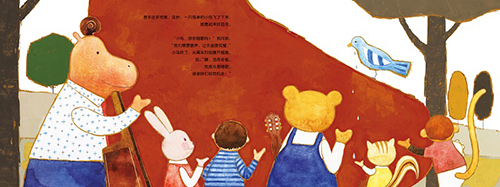 ◆定格动画般的插画,翻页间流动着独特的律动和节奏。正面的视角构图里,所有动物仿佛面向读者演奏,给人身临其境之感。