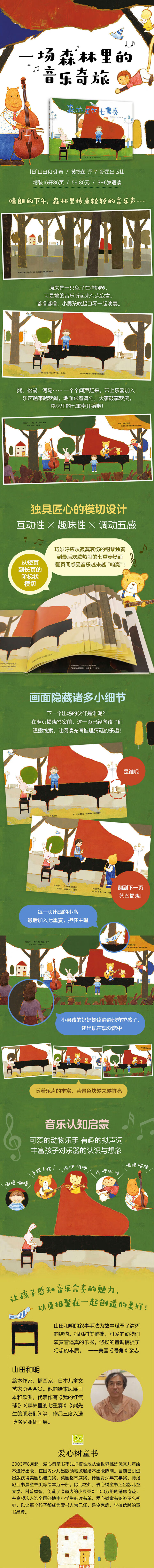 ◆一场森林里的音乐奇旅,松鼠、猴子、河马等小动物伙伴纷纷加入男孩的即兴音乐会。乐声越来越丰富,围观音乐会的神秘听众也越来越多。从安静的独奏推向热闹的派对,让孩子感受音乐合奏的魅力、集体配合的默契,以及相聚在一起创造的美好!