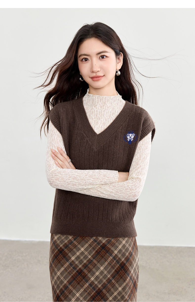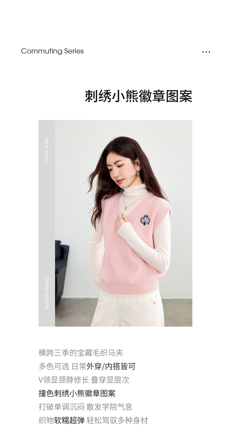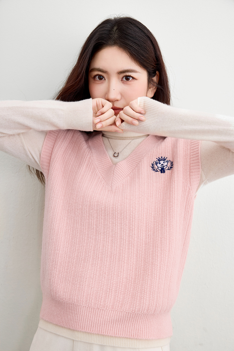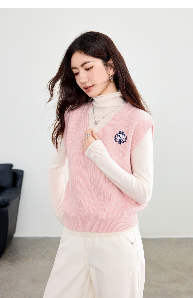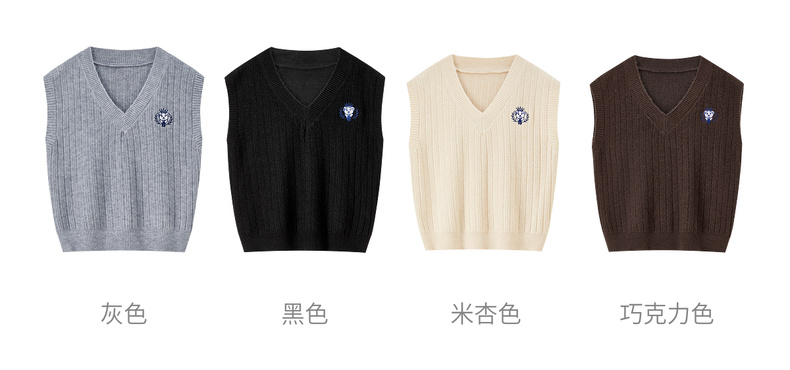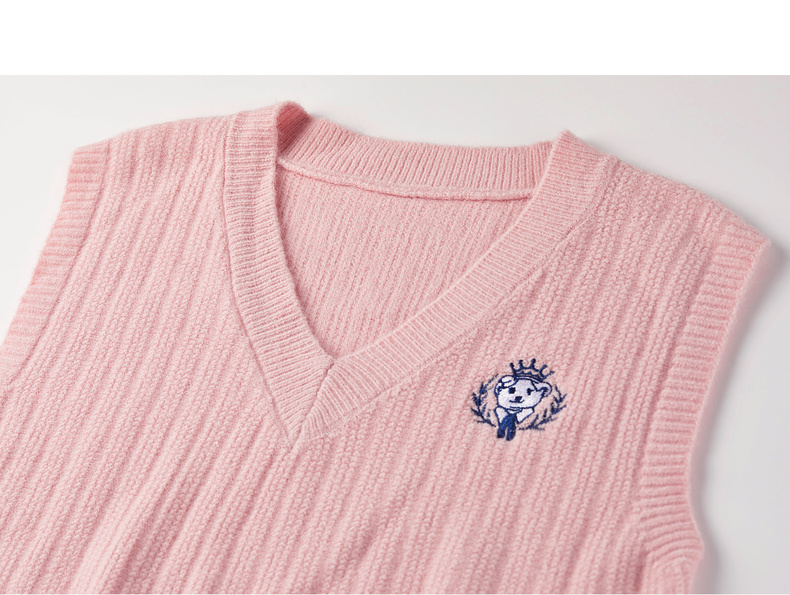 【内购】【多色可选】通勤学院风v领撞色刺绣小熊徽章外穿内搭毛织马夹-W53JB3404