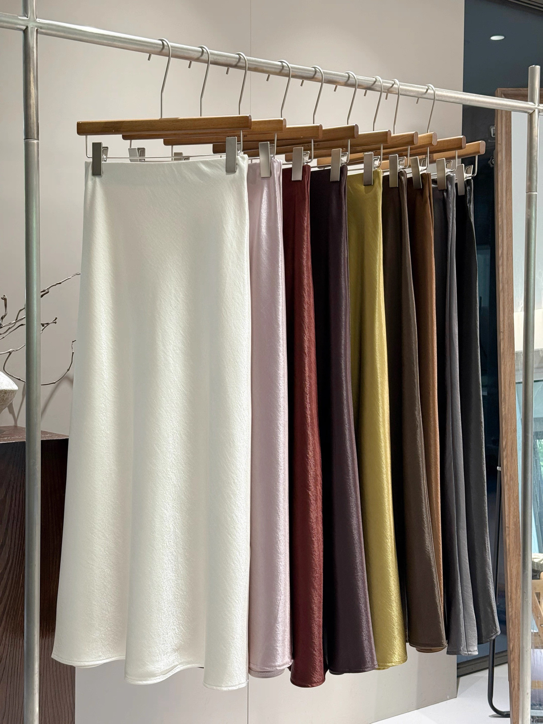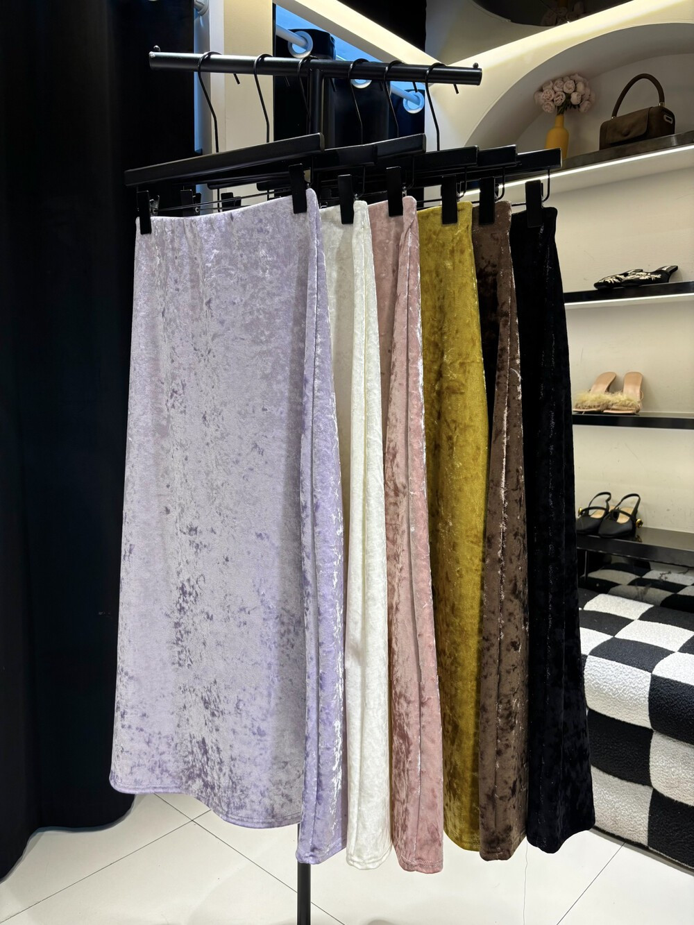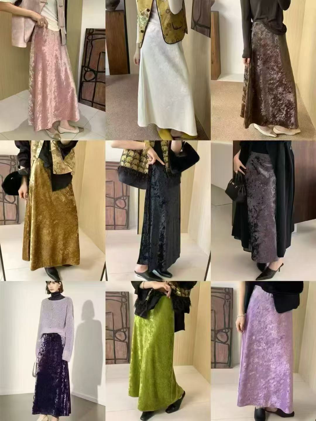 新中式国风钻石绒真丝绒半身裙AUC011505:黑色,杏色,黄色,咖色,藕粉,蓝紫
