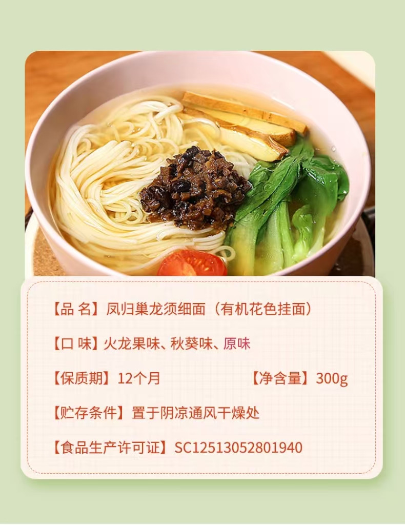 凤归巢有机龙须细面300g/盒(火龙果味、秋葵味、原味3种口味)汤面拌面