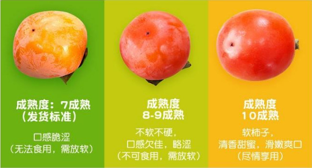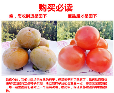 为保品质,我们均采摘硬果发货。大家收到货以后常温放置塑料袋里密封催熟,等待柿子变成深橘红色,摸一摸非常软的时候再吃。这个品种的柿子是越软越好吃,越软越甜,越软越多汁!