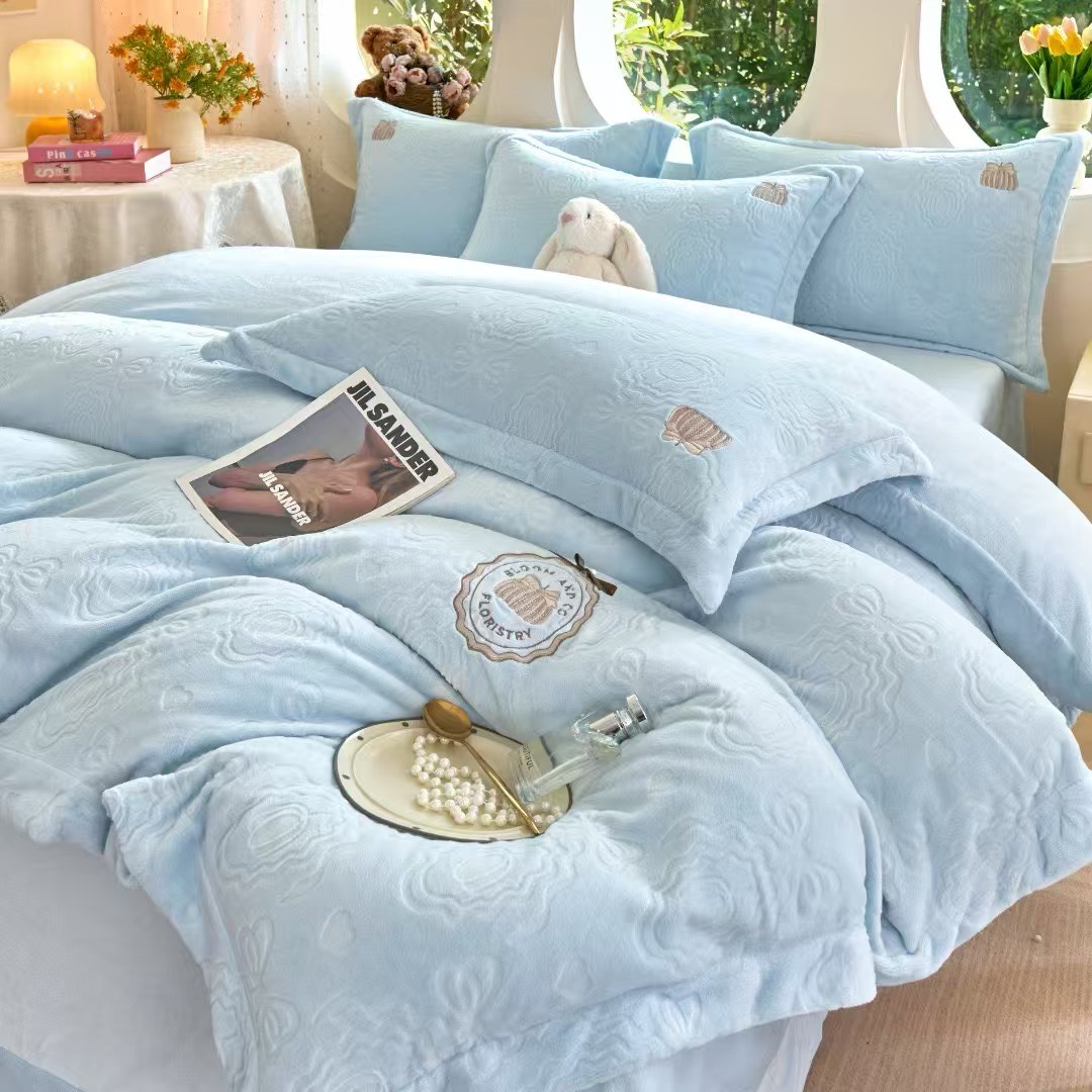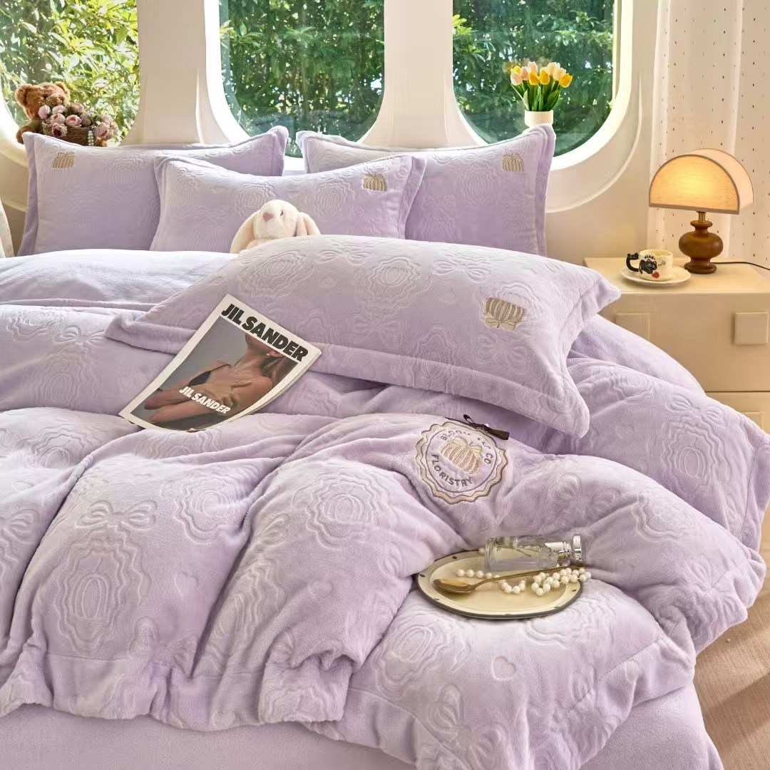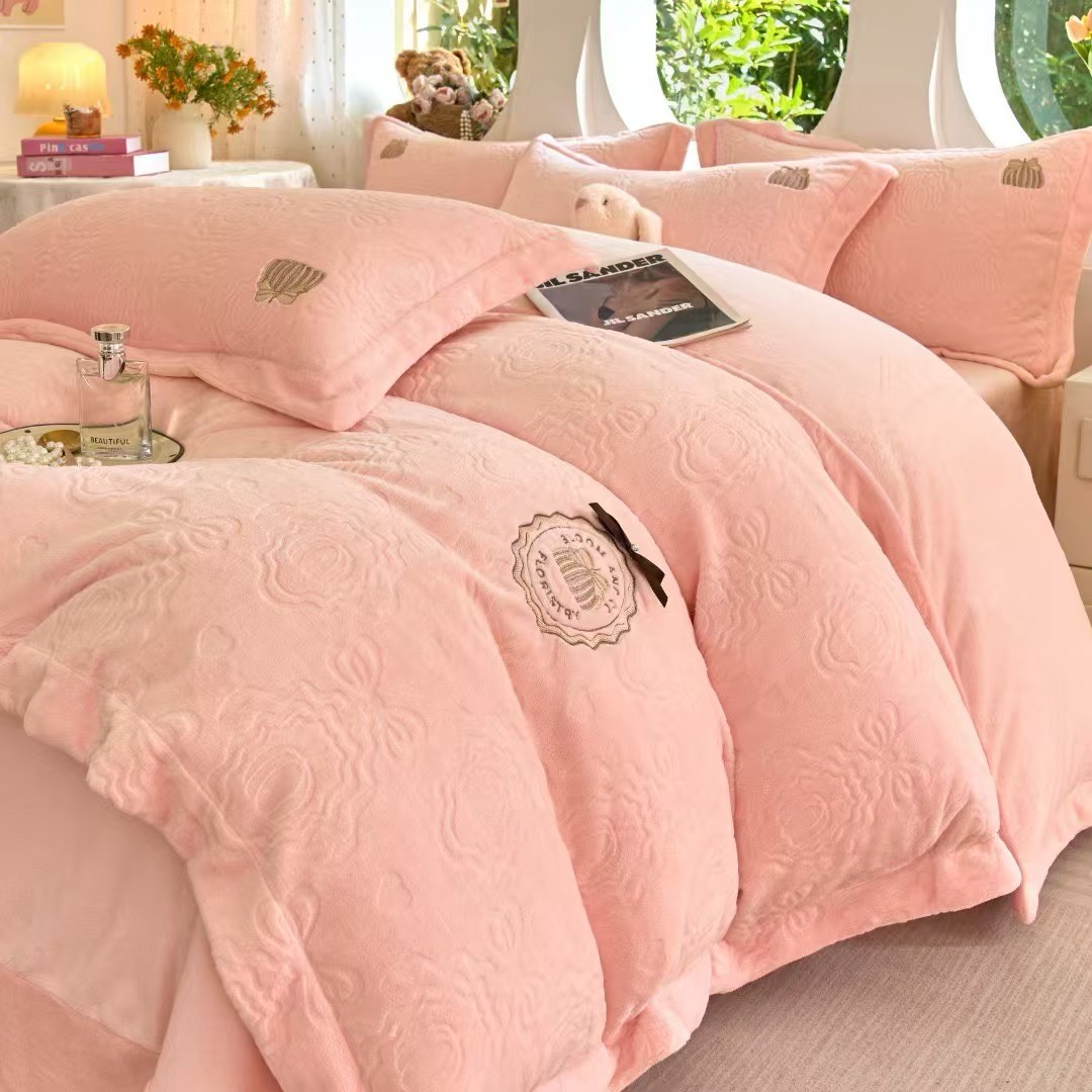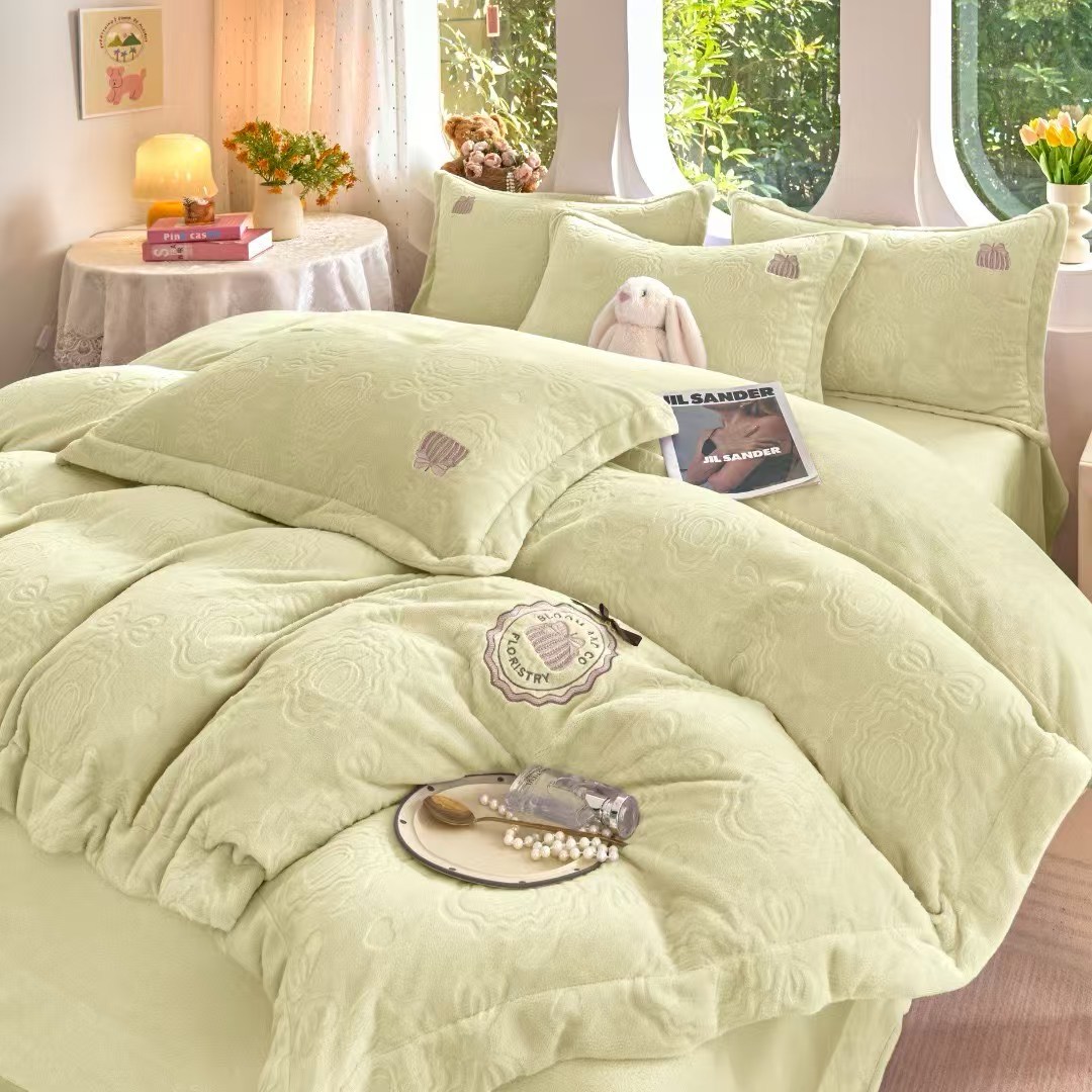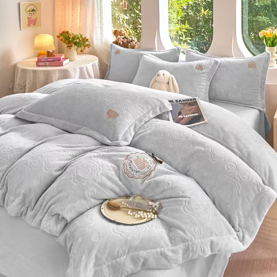【3-7天发货丨雕花绒四件套丨柔梦物语】质地柔软,触感细腻!清新时尚!环保活性印染工艺,不易缩水褪色!有多种颜色可选!