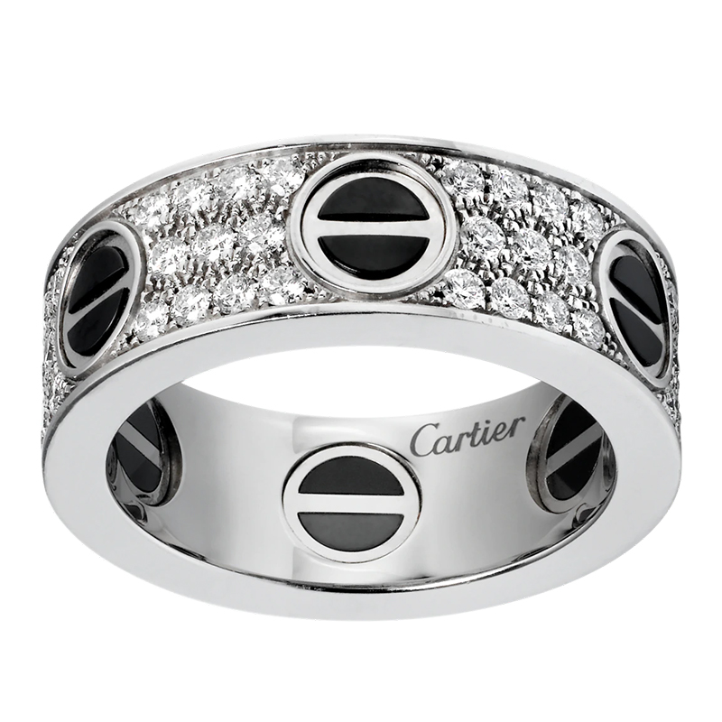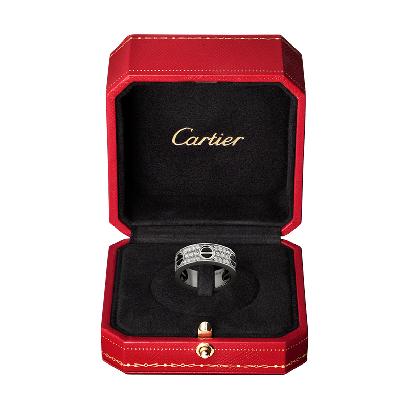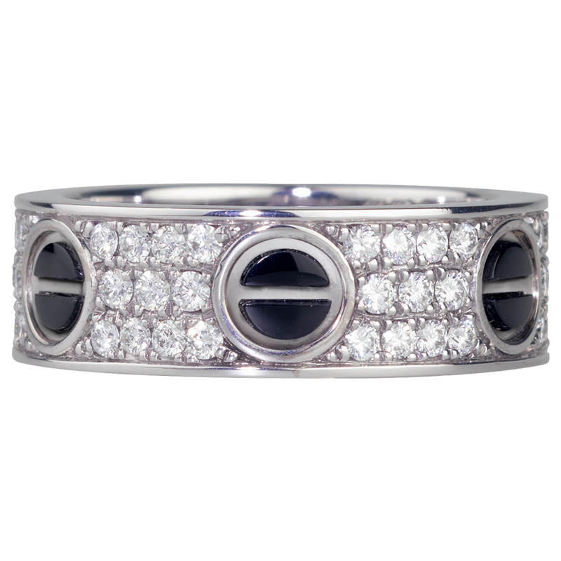 爱情戒指,18K金白金(750/1000),黑色陶瓷,镶嵌66颗明亮式切割钻石,总计0.74克拉。宽度6.5毫米。