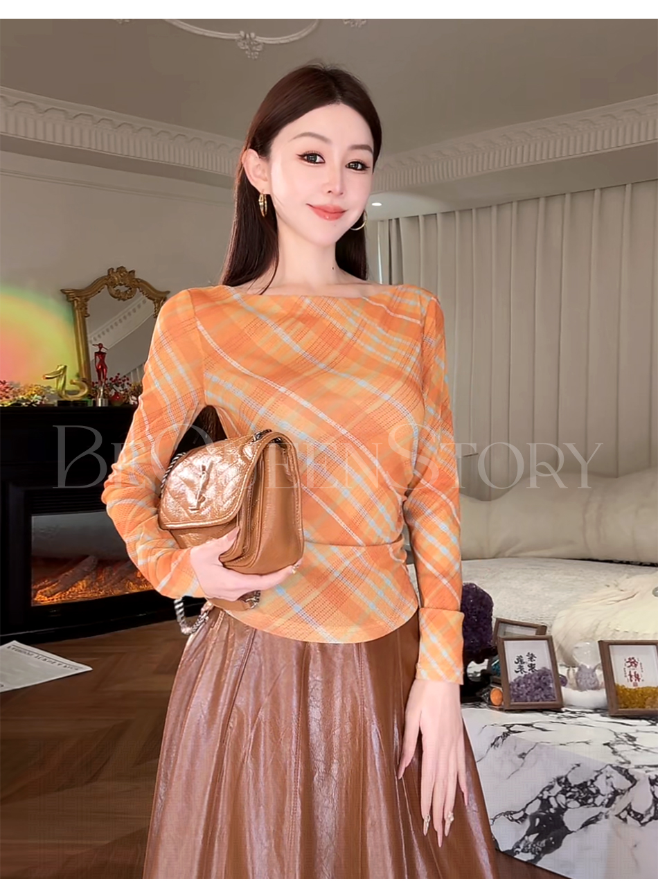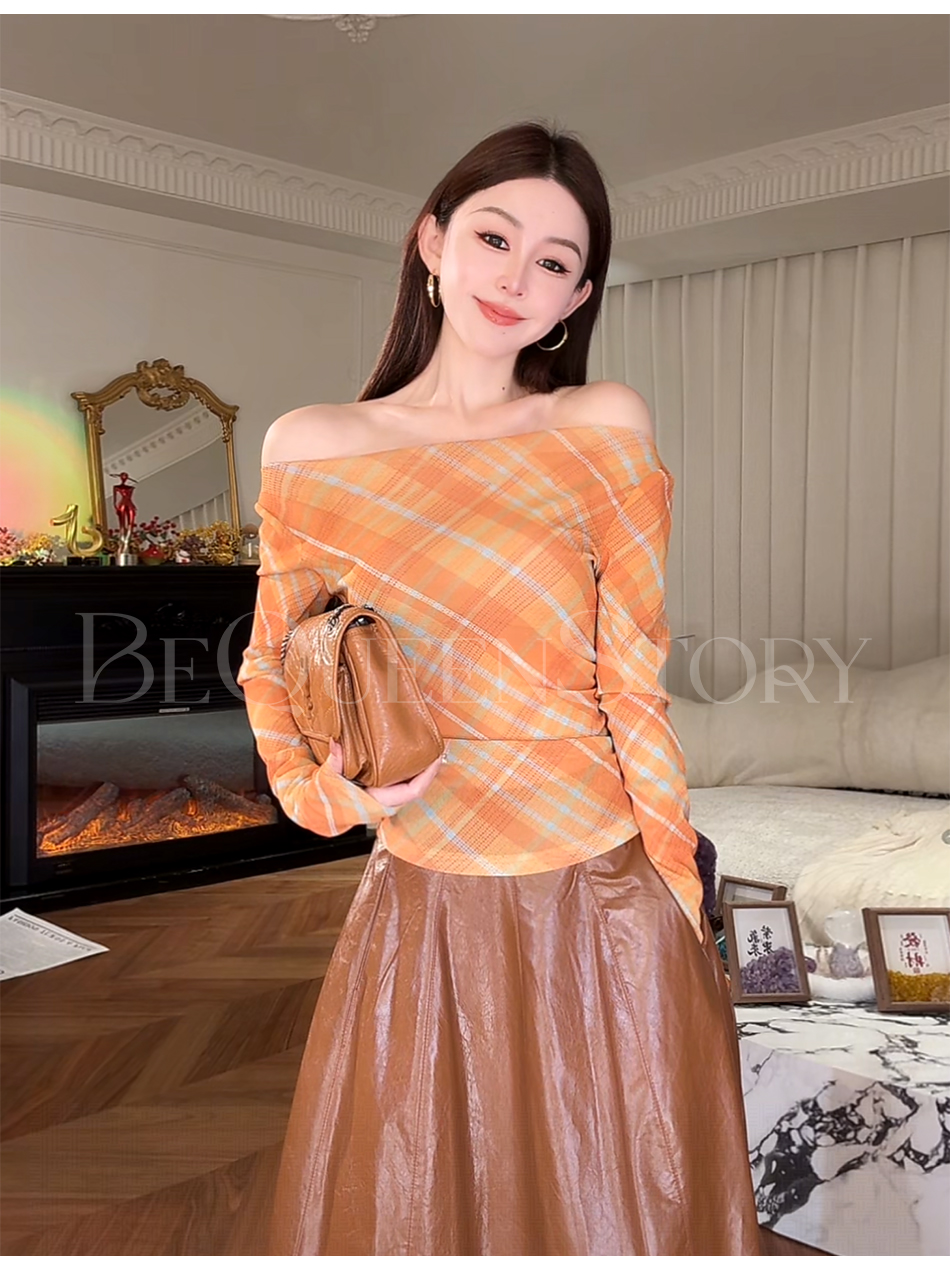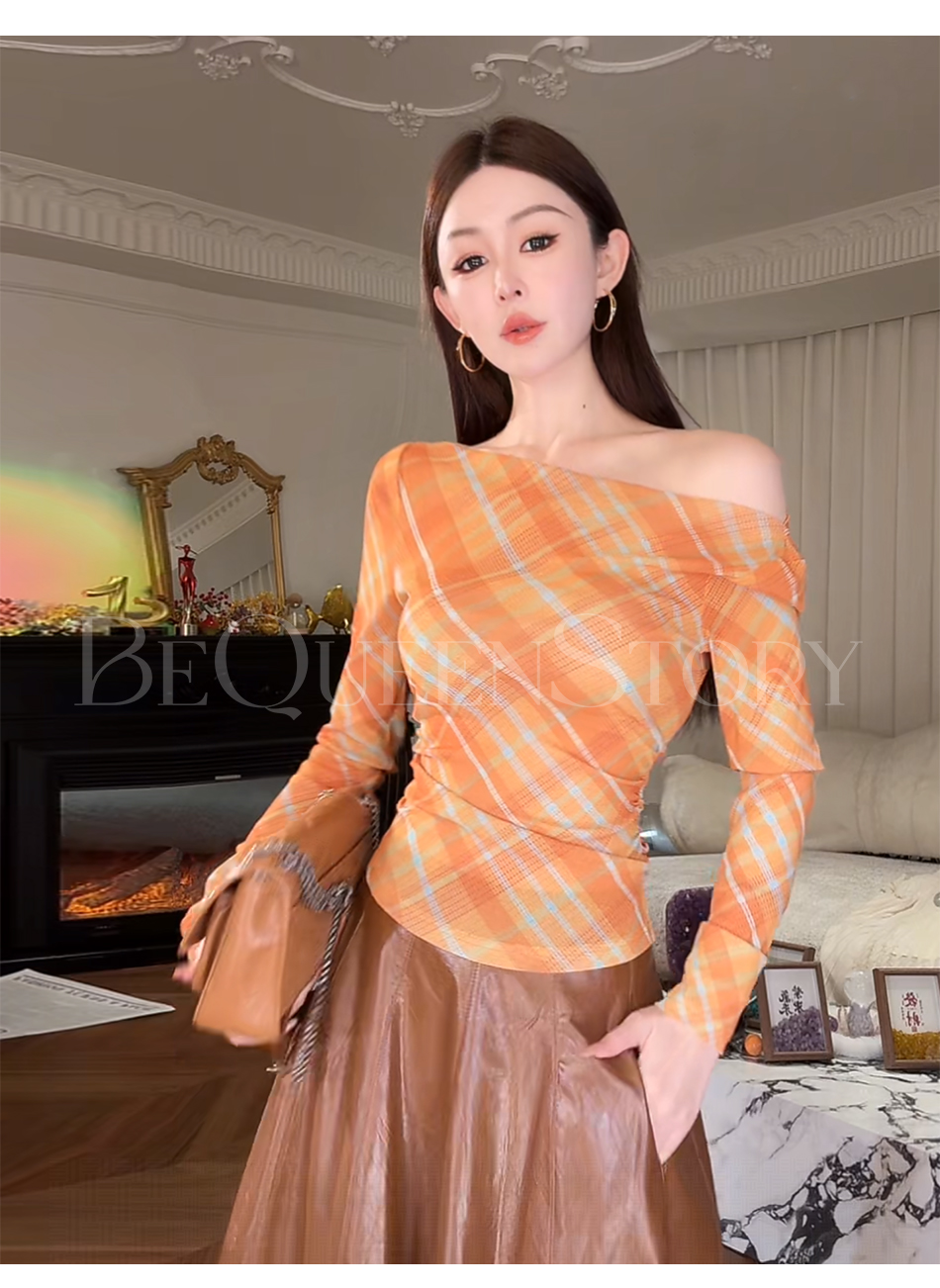 余潇潇【自由画报】时尚复古拼接褶皱遮盖小肚腩一字肩修身上衣