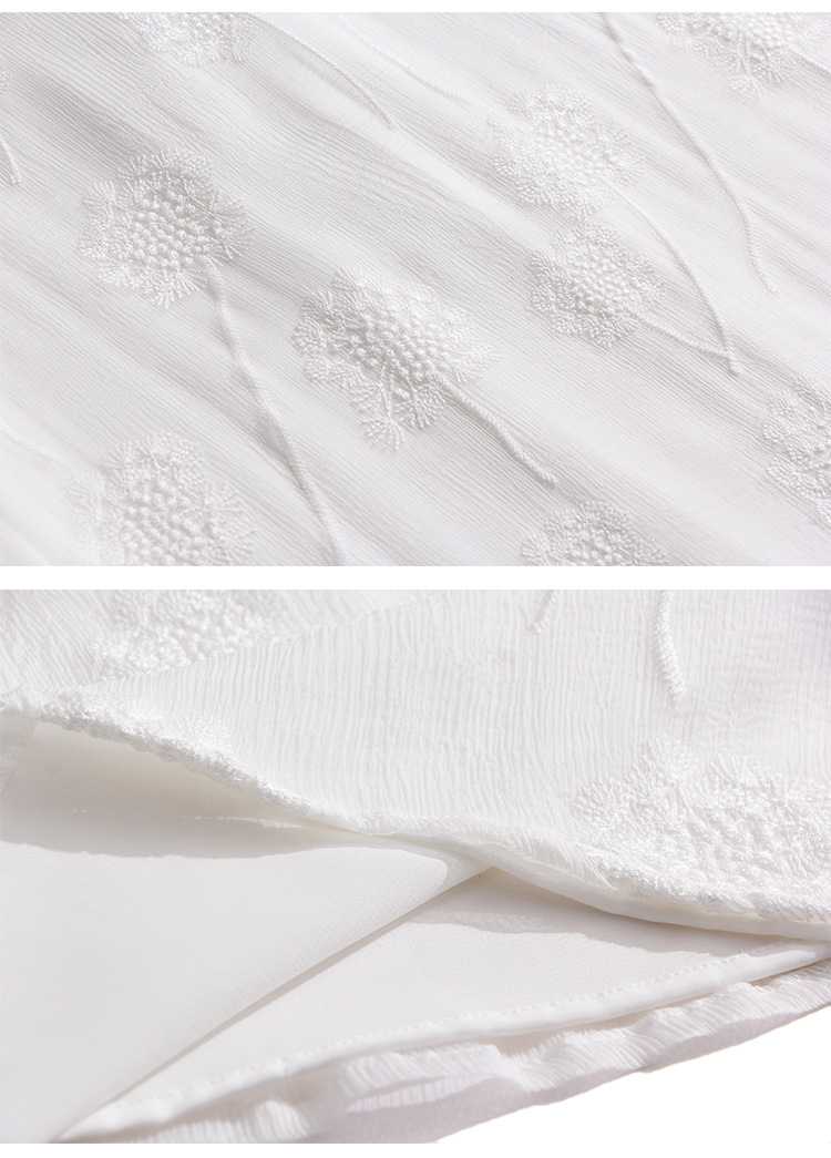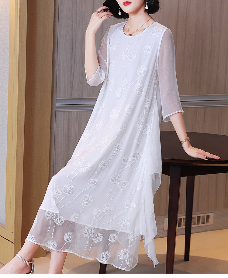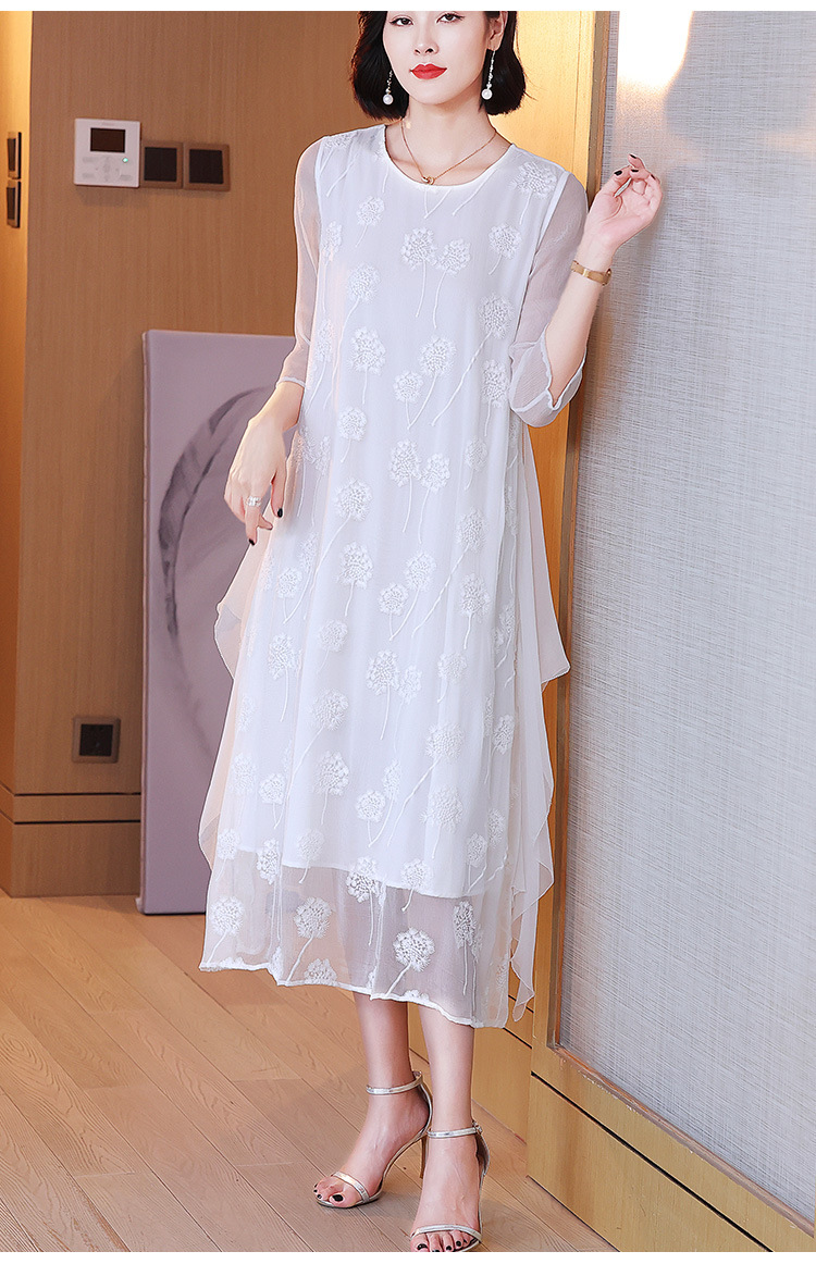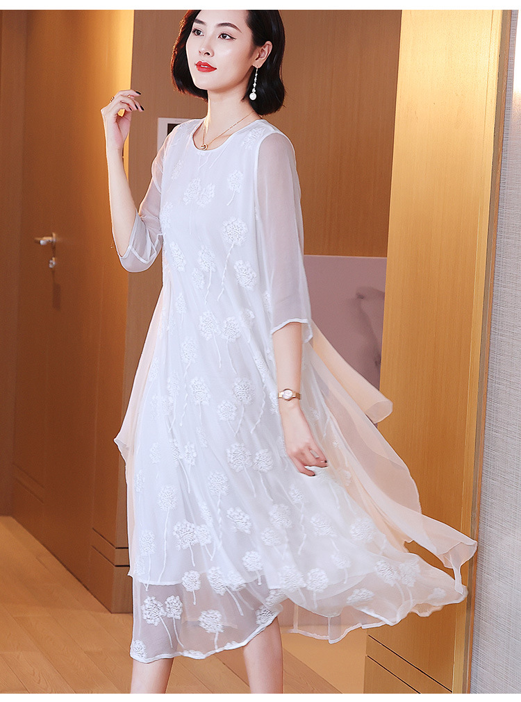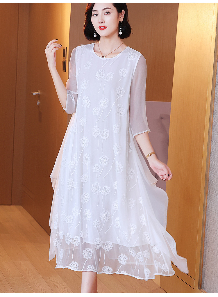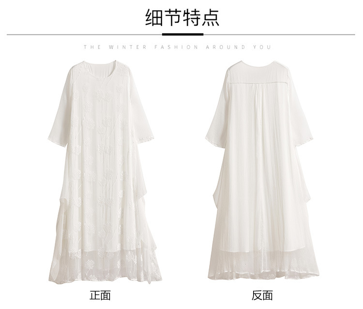 白色真丝连衣裙,顺纡刺绣宽松飘逸很仙桑蚕丝连衣裙KDS-8908