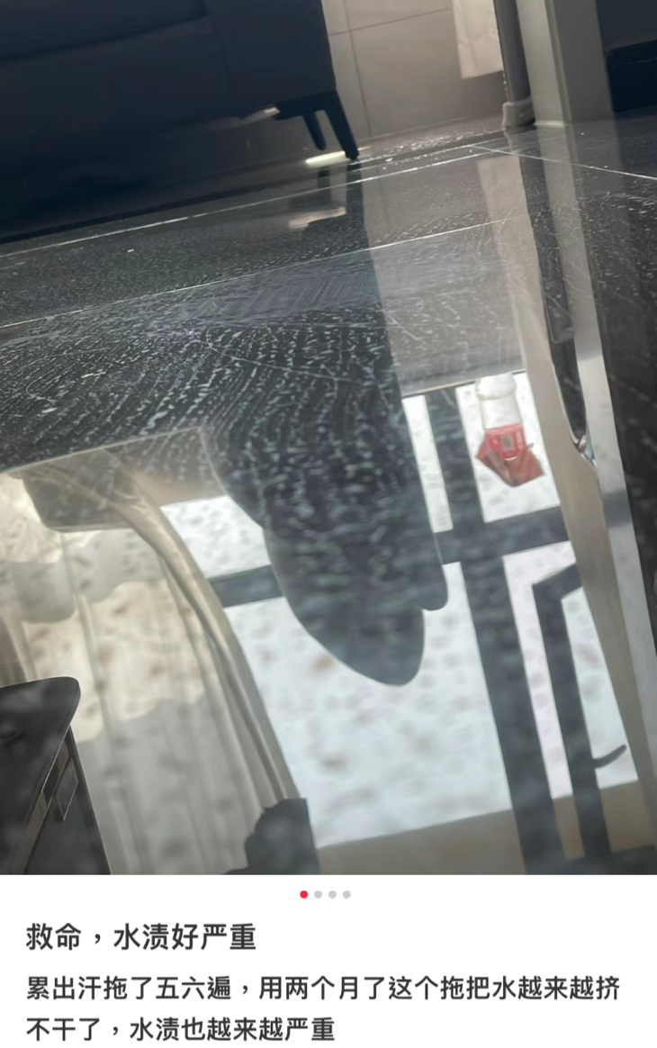 还要区分拖布的材质⭕ 上佳的绒布面拖布,厚实吸水,耐磨洗、除污高效不掉毛 次等的拖布需要经常更换,薄薄一片既不吸水也不耐用 用于对水迹反应明显的地面来说 拖地后的效果可能还比不上没拖