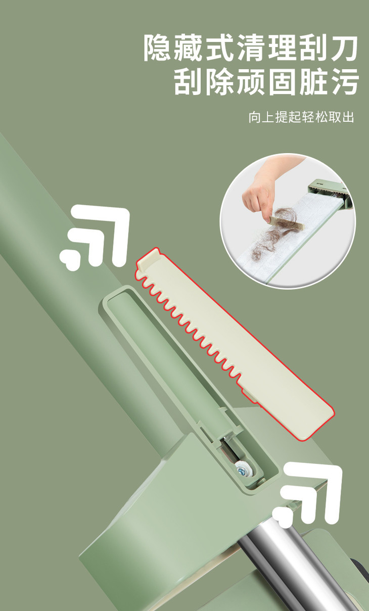 哪怕久用后顽固缠绕的毛发像是在拖把上打了死结 也还可用拖把自带的隐藏式清理刮刀轻松刮去