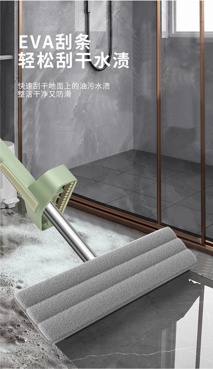 拖把上的EVA刮条可以快速刮干墙面、地面的残留水渍 一把树风平板拖 = 一把拖把+一把刀扫 刮去地面上的洗澡水等残留的水分 避免水混泡泡 打滑摔倒
