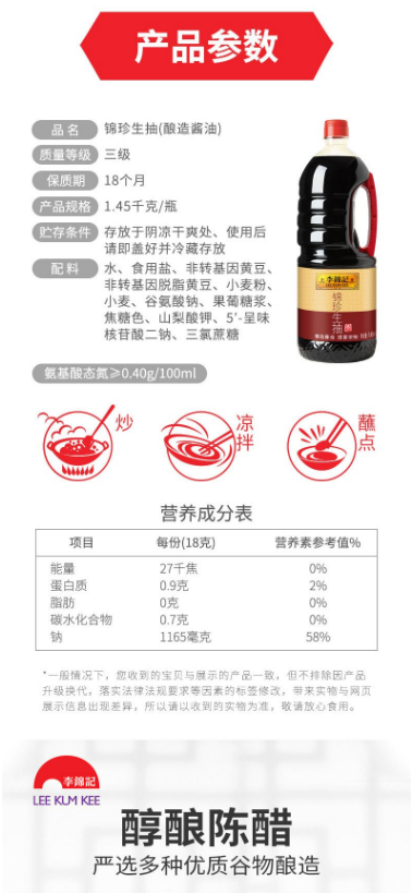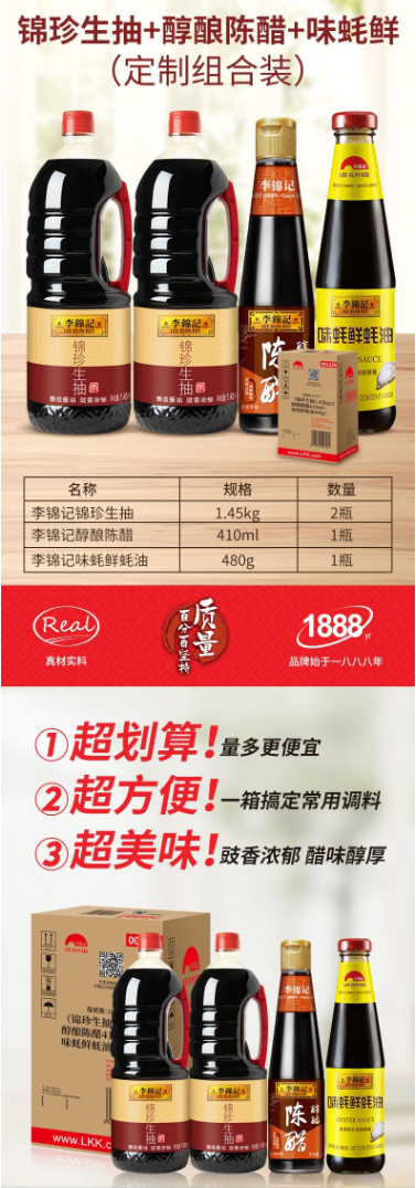 【年货节】李锦记 酱油醋蚝油 锦珍生抽*2+醇酿陈醋+味蚝鲜 家庭常用调料组合装