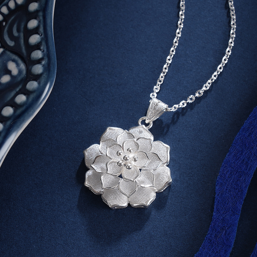 【寓意】:银丝交织若秋水凝霜,吊坠如花瓣般层叠错落。此礼献予女神,既诉相思衷肠,亦证痴心不渝。
