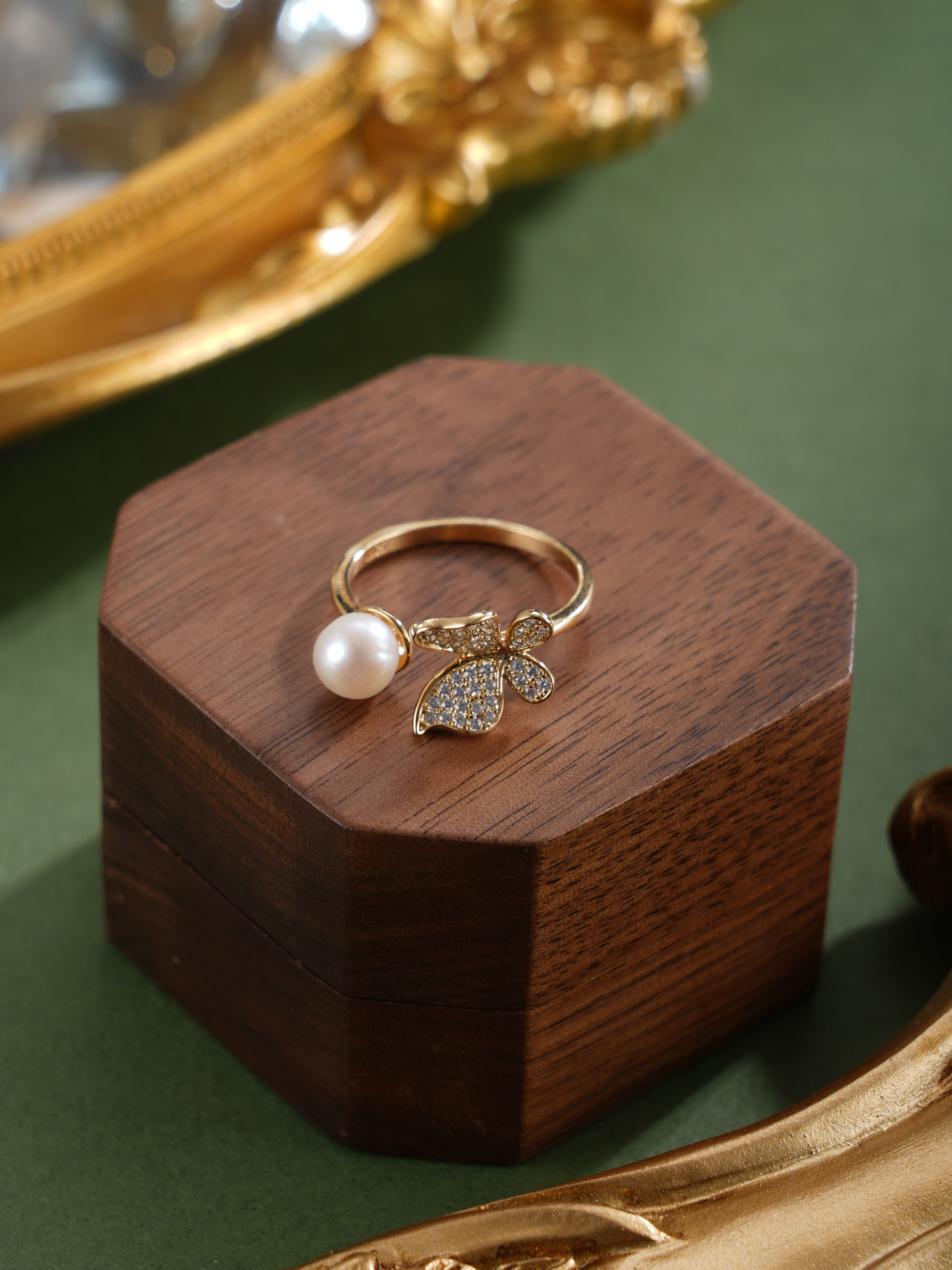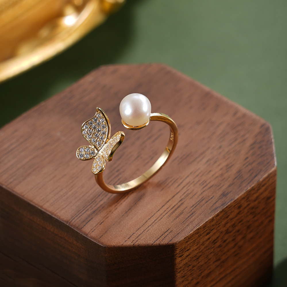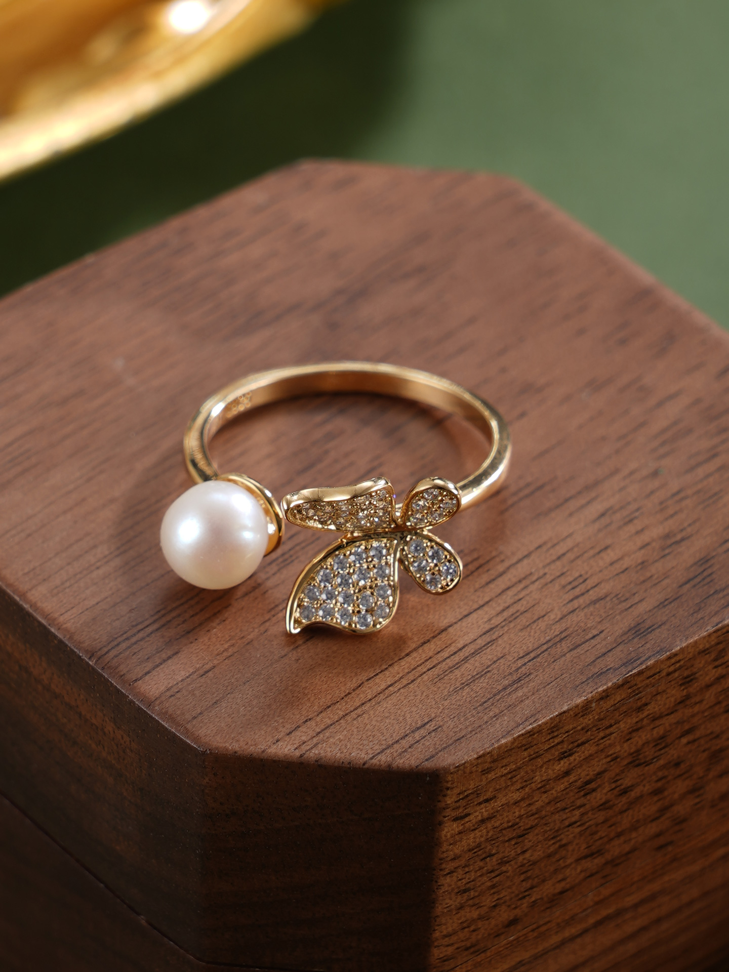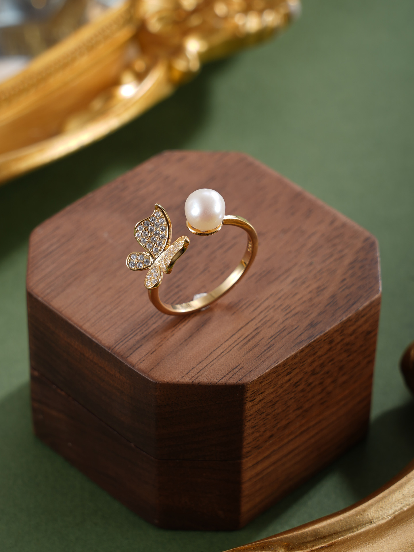 子佩集【蝶光溯影】银S925珍珠惜王妃戒指【R0982】6mm珠镀金蝴蝶2601