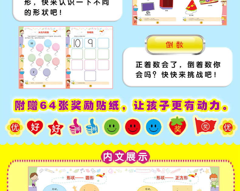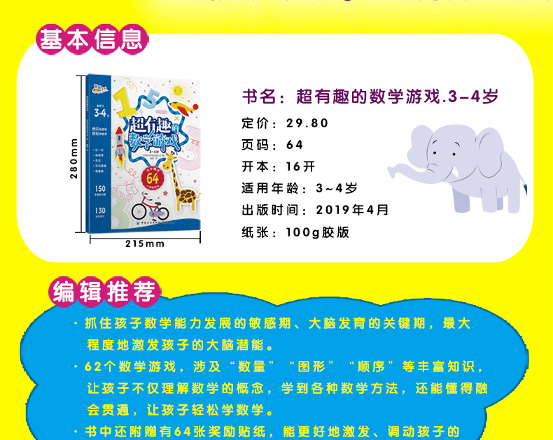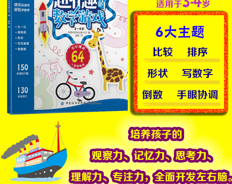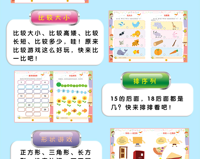 正版 超有趣的逻辑思维游戏:3~4岁儿童启蒙幼小衔接智力开发数学逻辑思维训练 比大小排序形状算数练习题 图形贴纸亲子互动游戏书