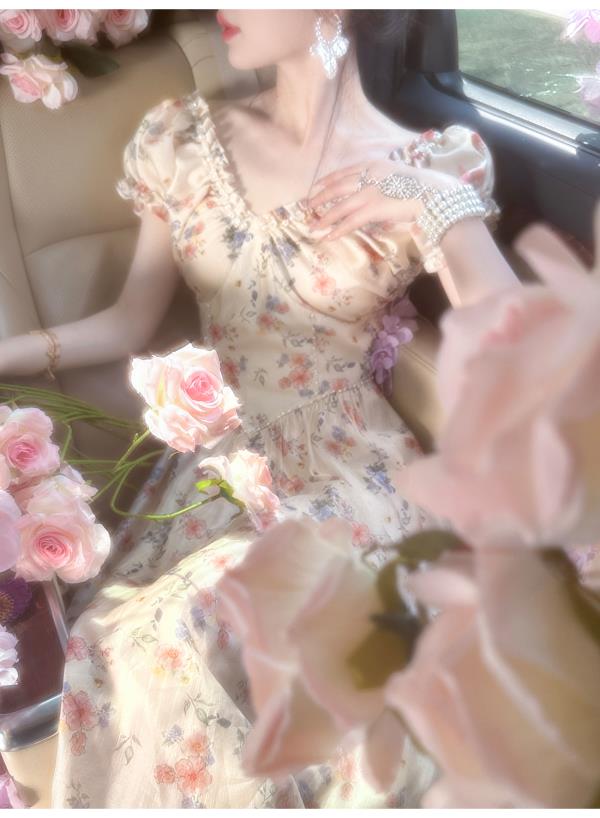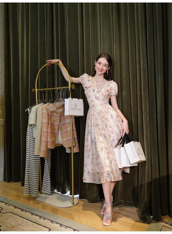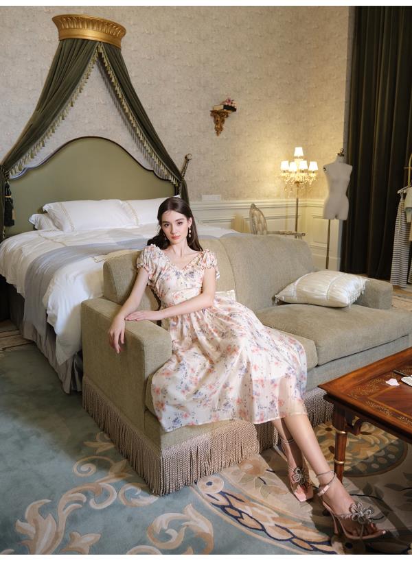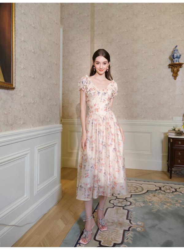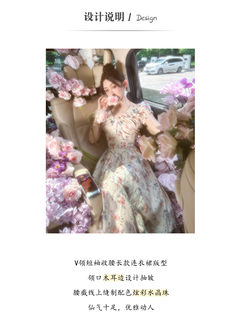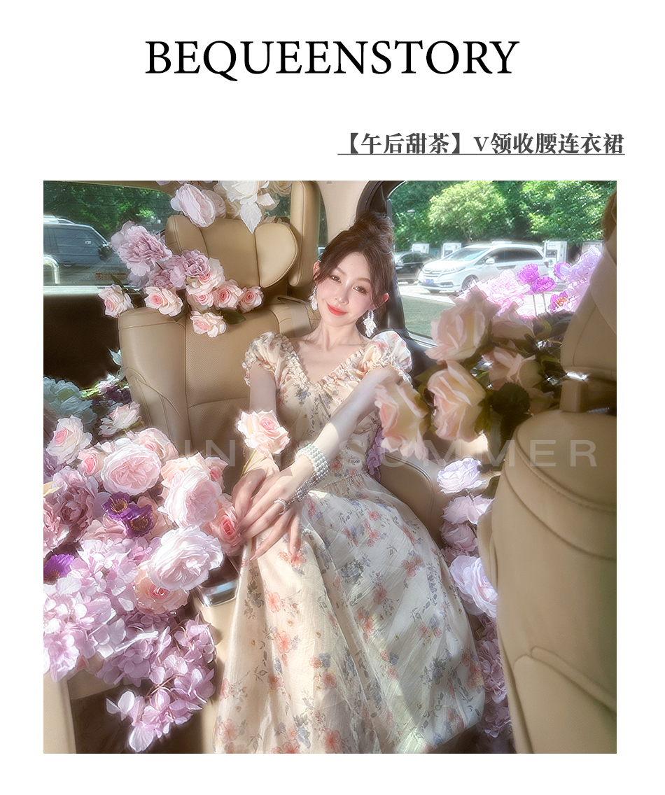 BeQueenStory【午后甜茶】甜美高贵V领短袖收腰长款连衣裙2023女