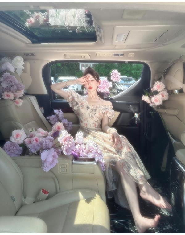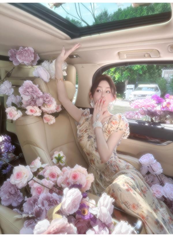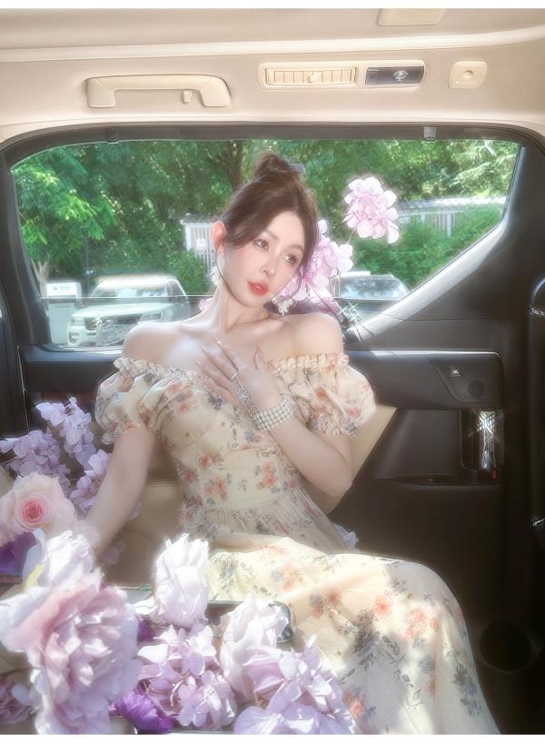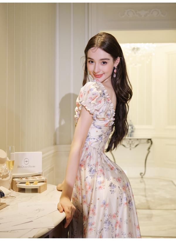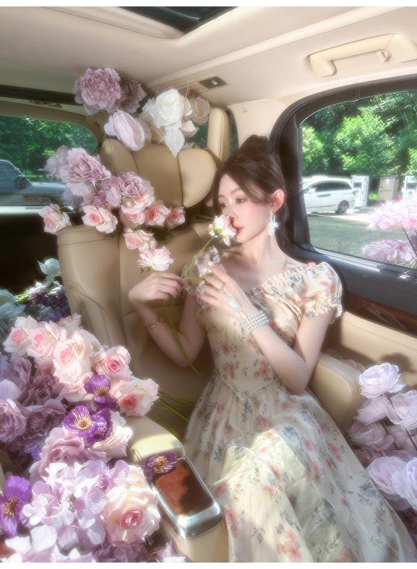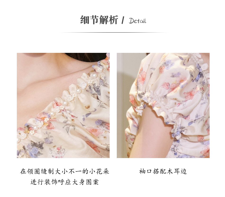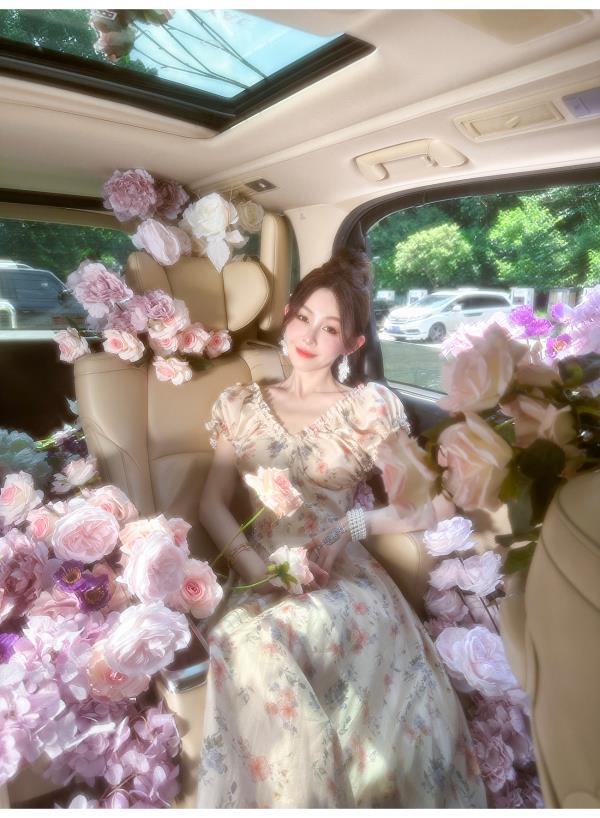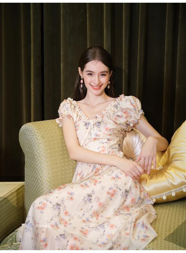 BeQueenStory【午后甜茶】甜美高贵V领短袖收腰长款连衣裙2023女