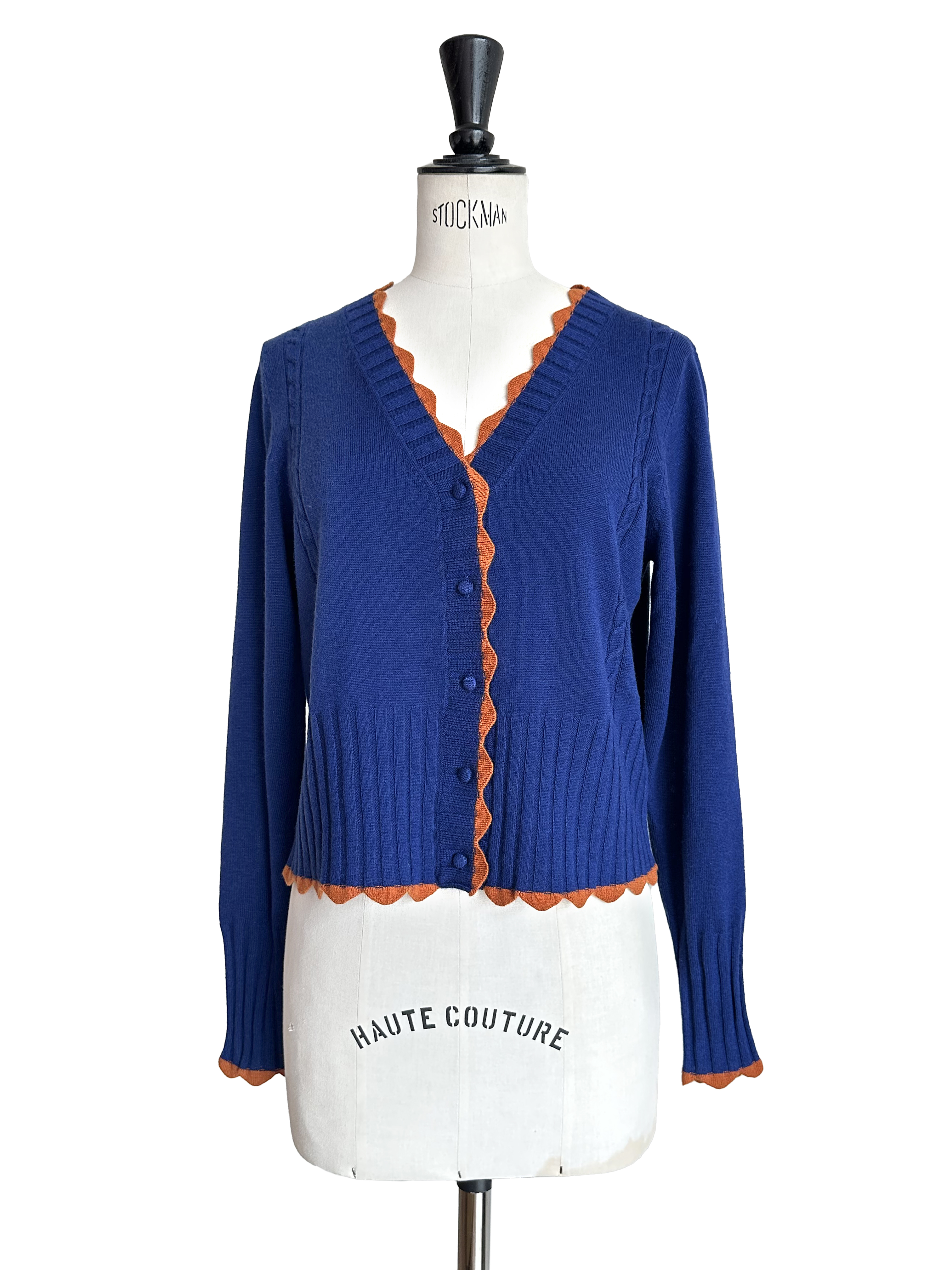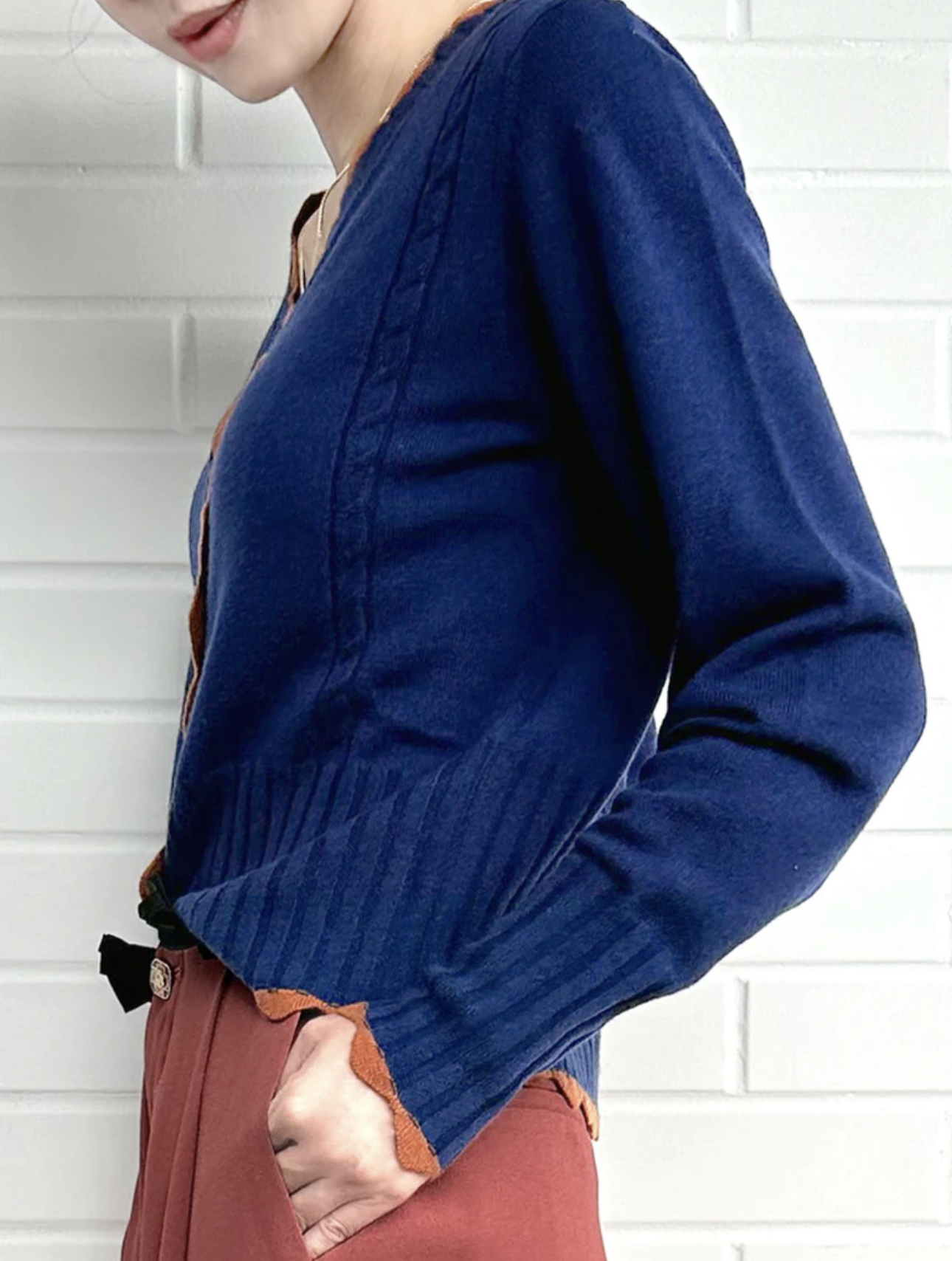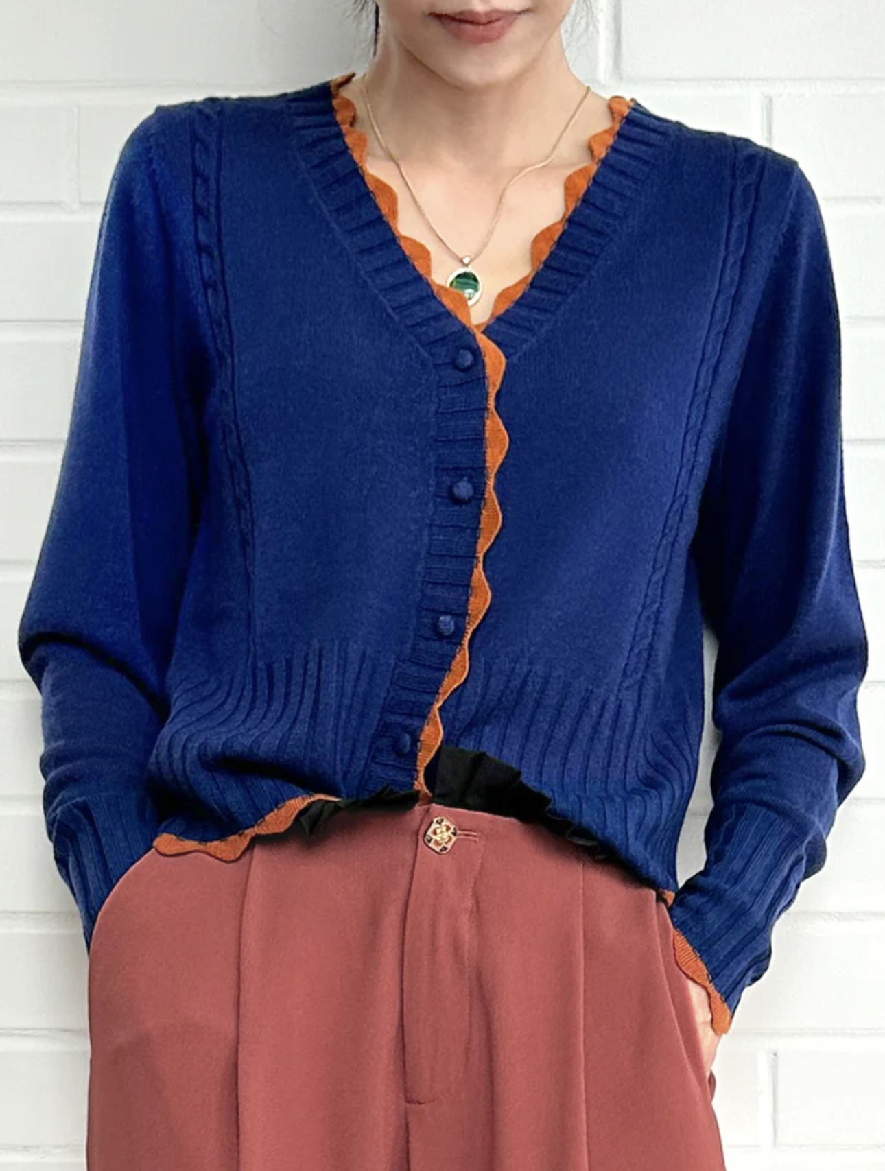 TYNVIE 波浪纹饰边撞色羊绒开衫-蓝色