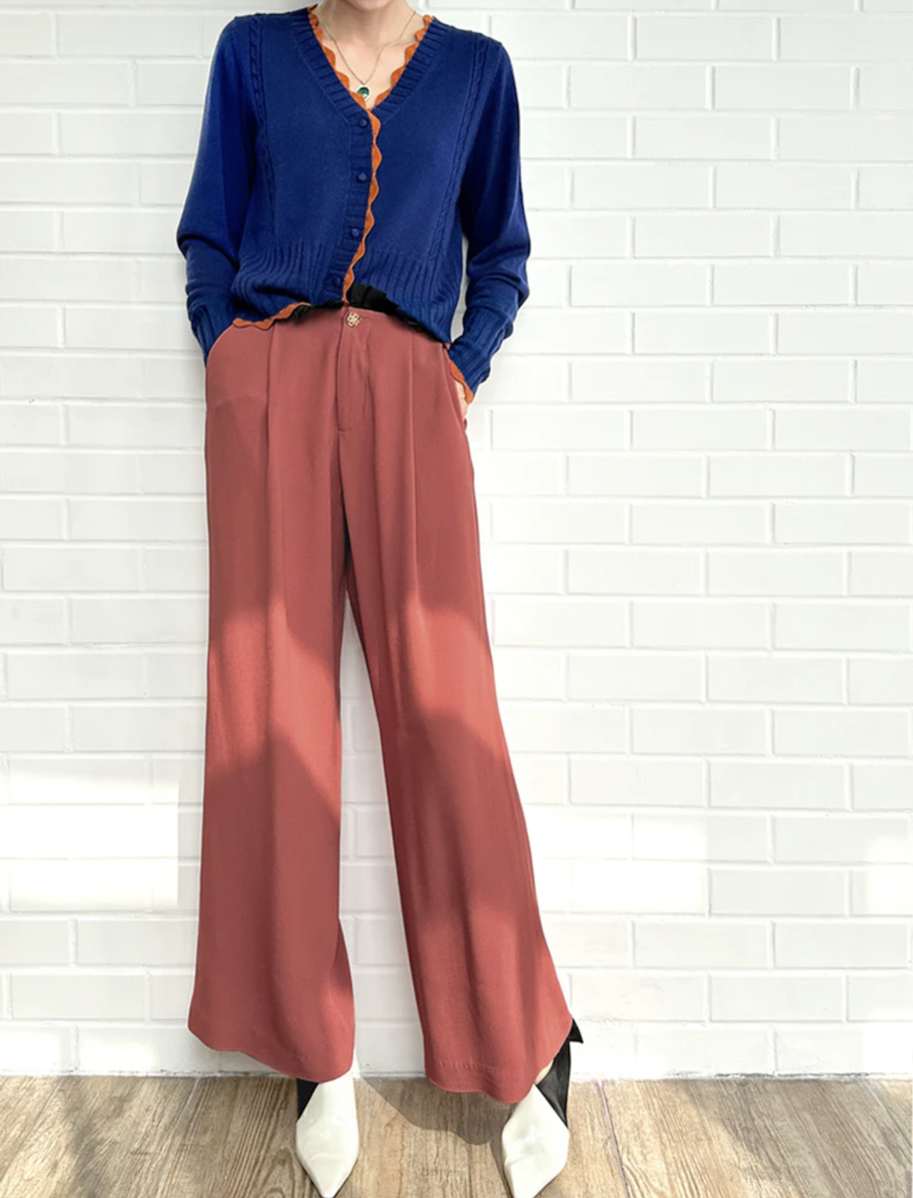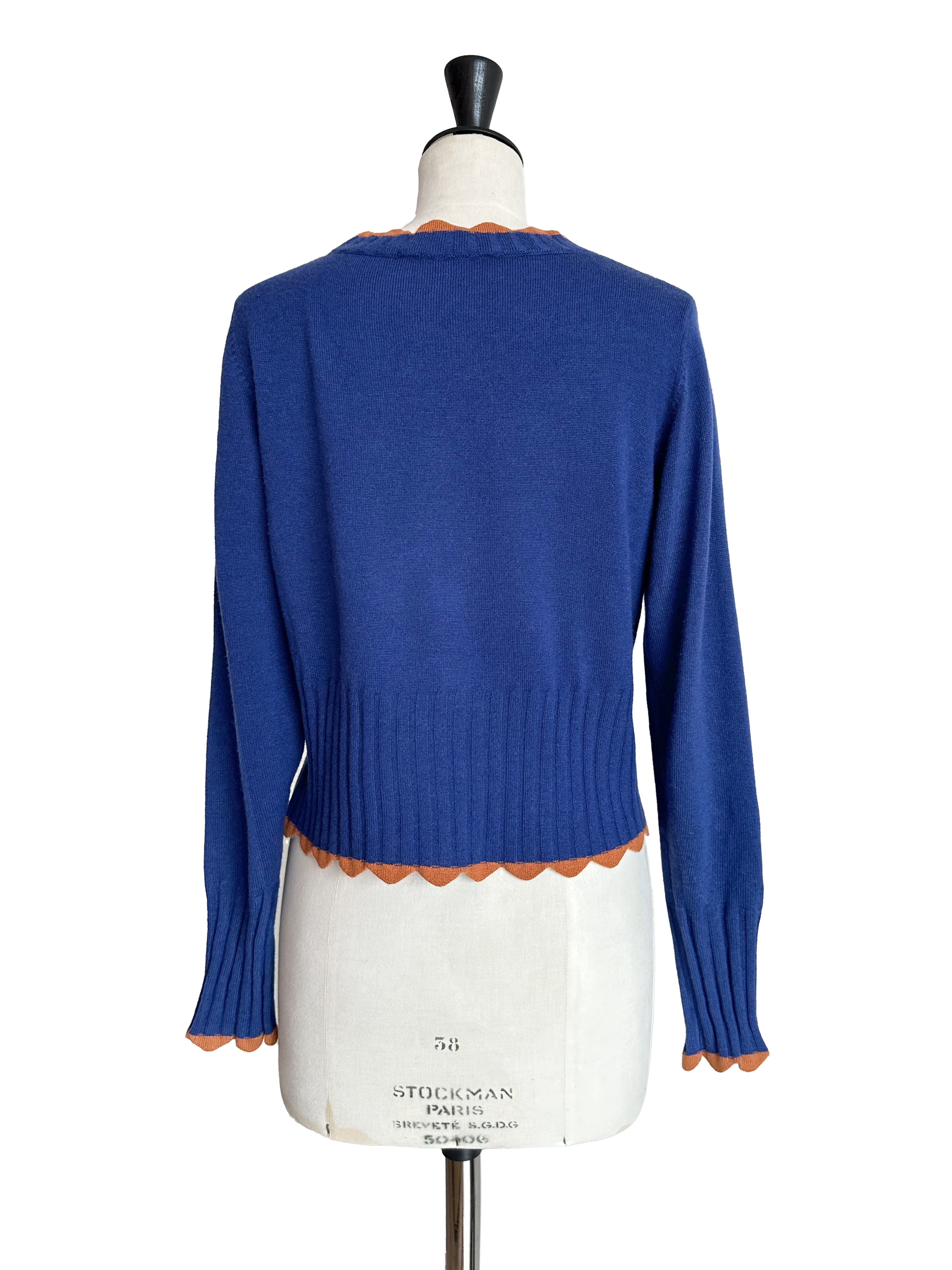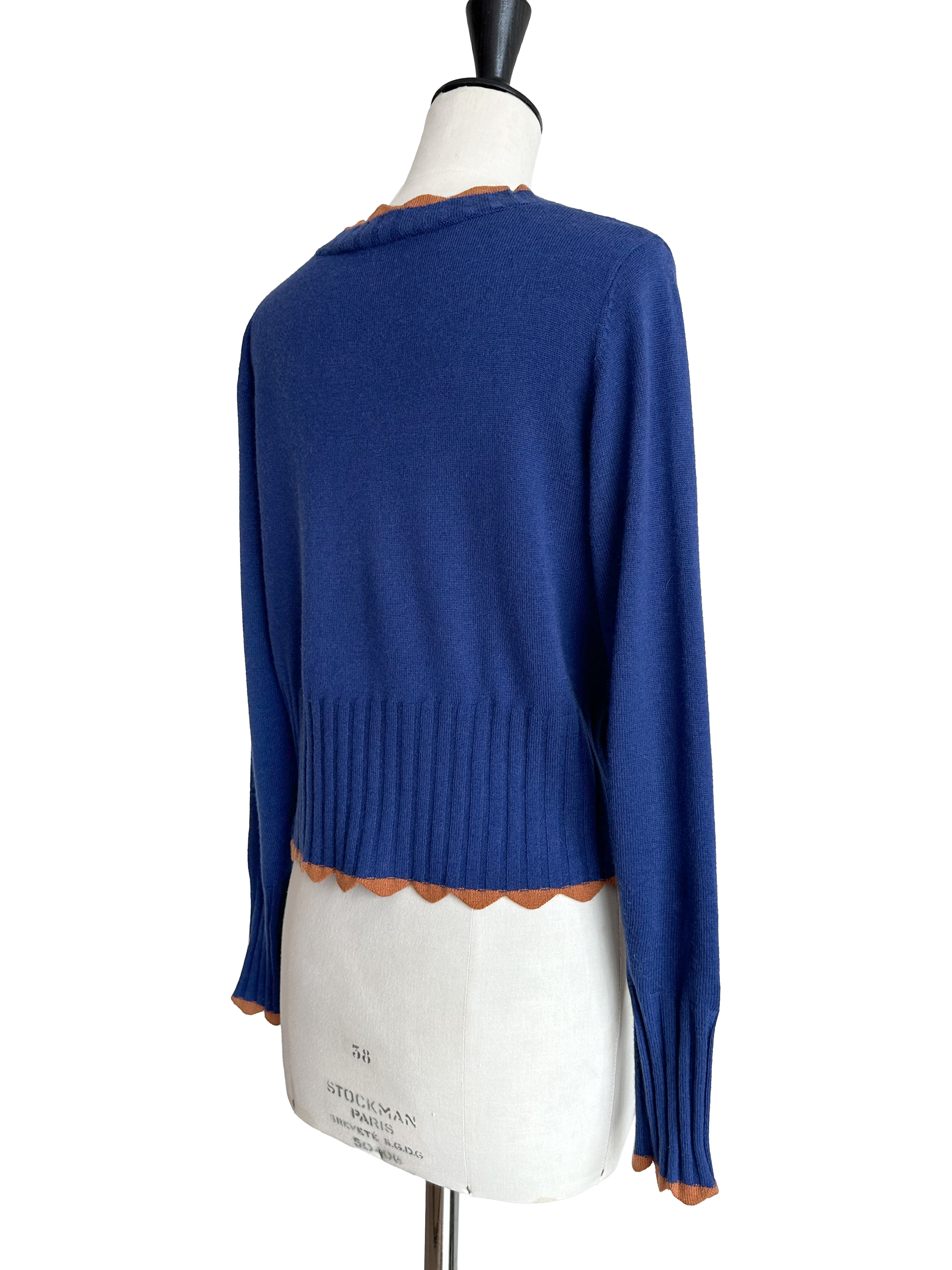 TYNVIE 波浪纹饰边撞色羊绒开衫-蓝色