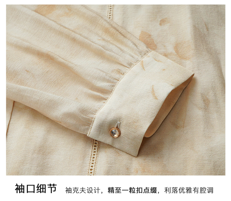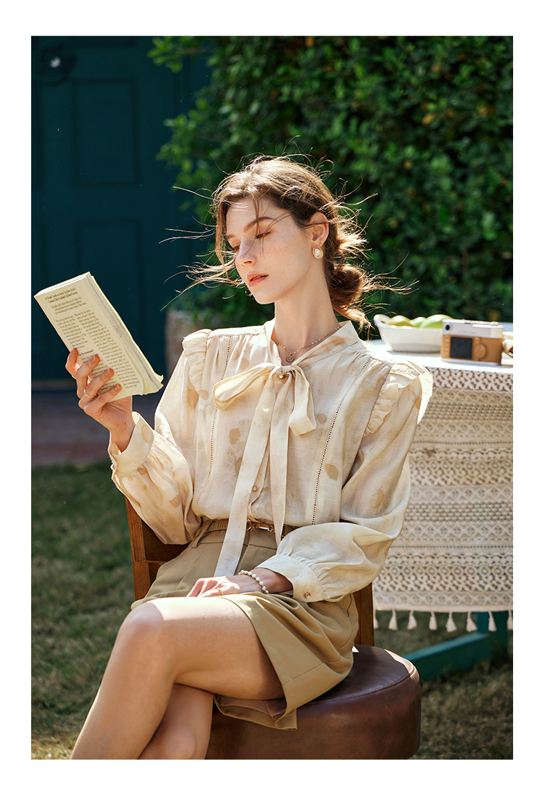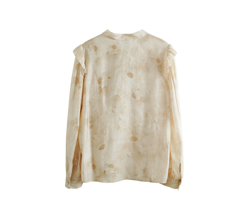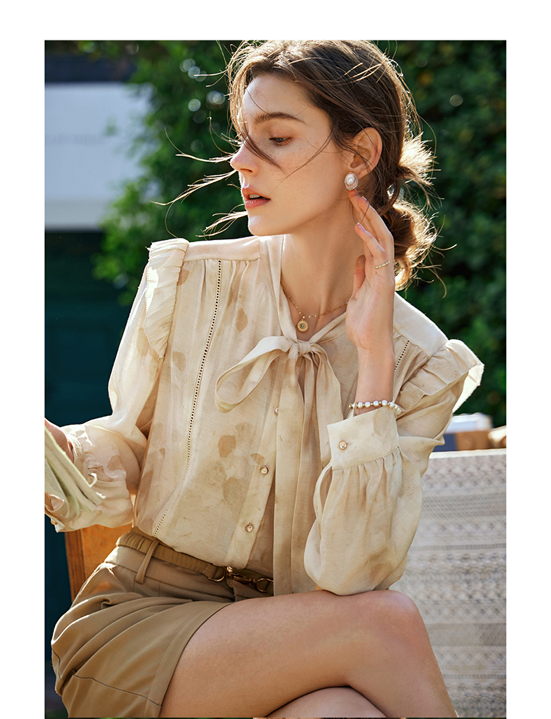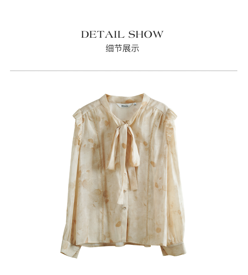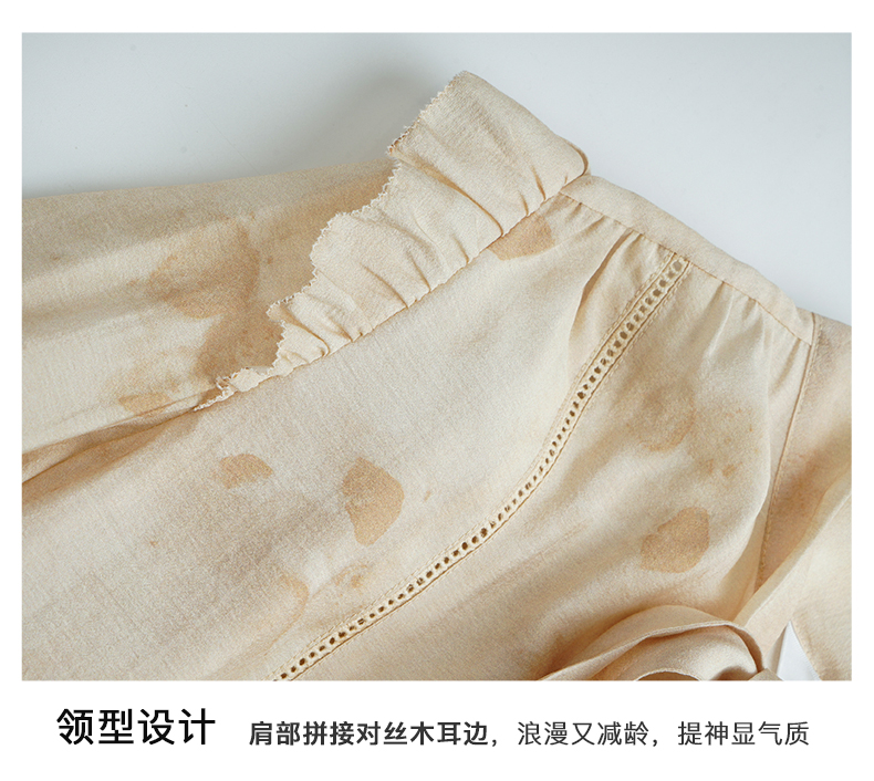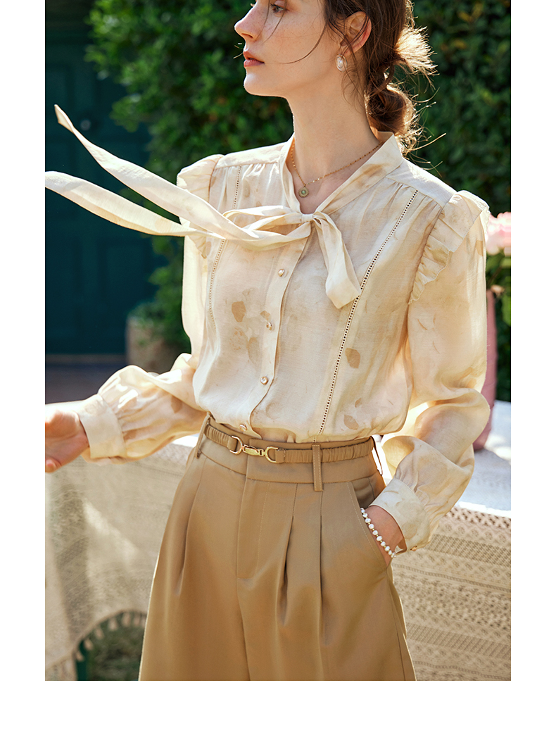 OLrain欧芮儿法式印花衬衫女早春2024年新款别致拼接木耳边上衣