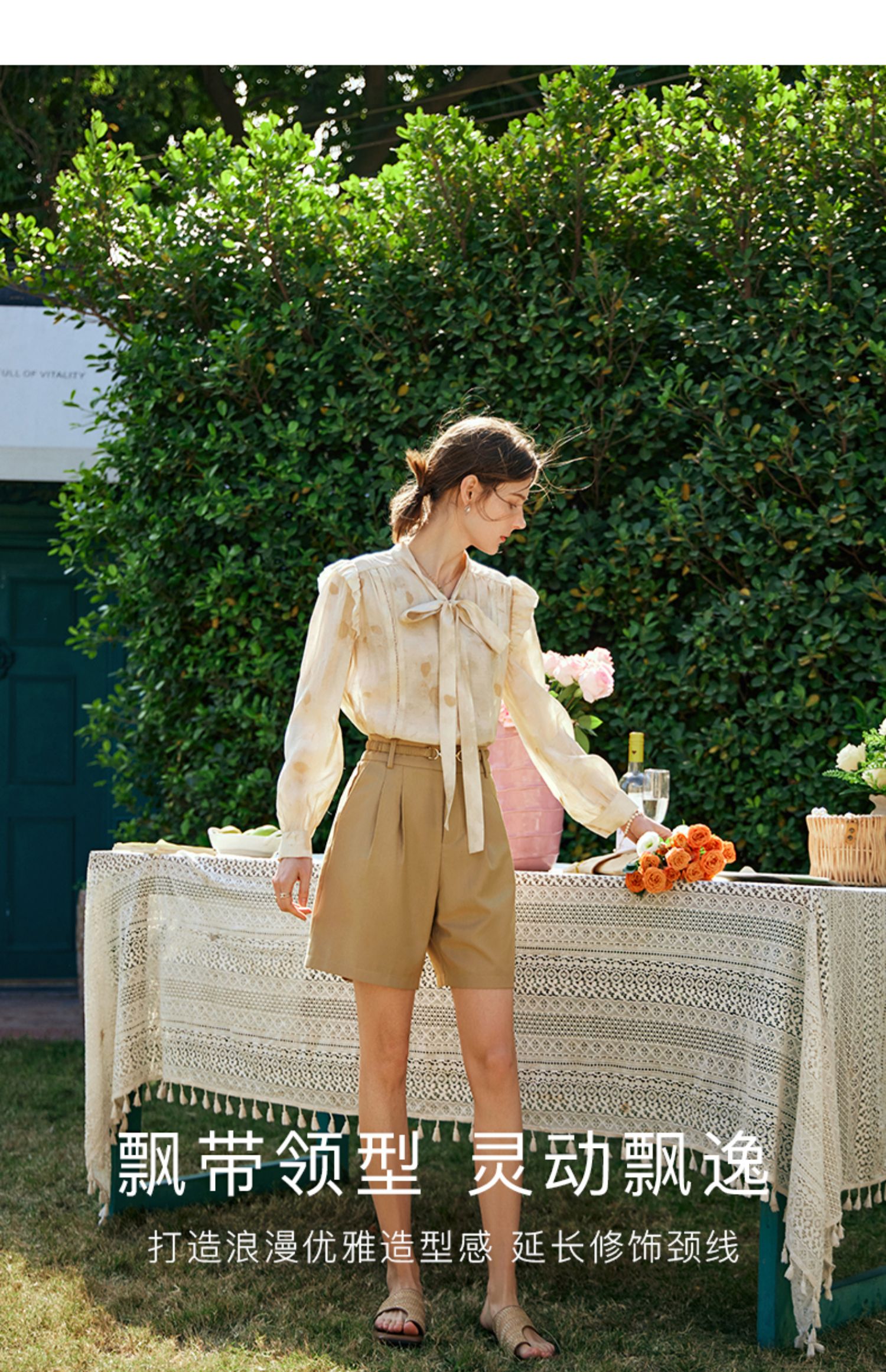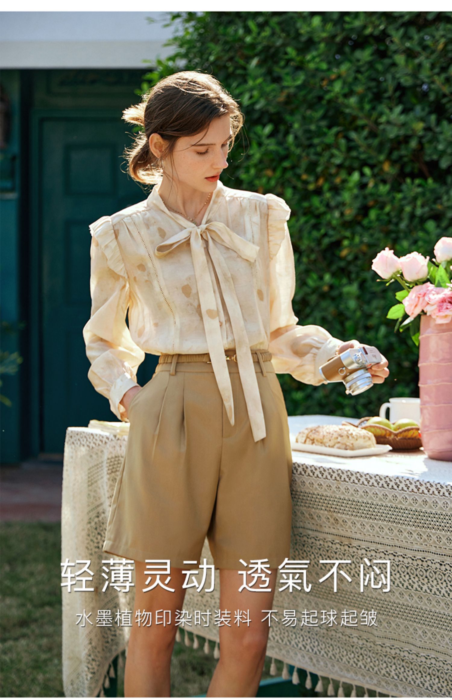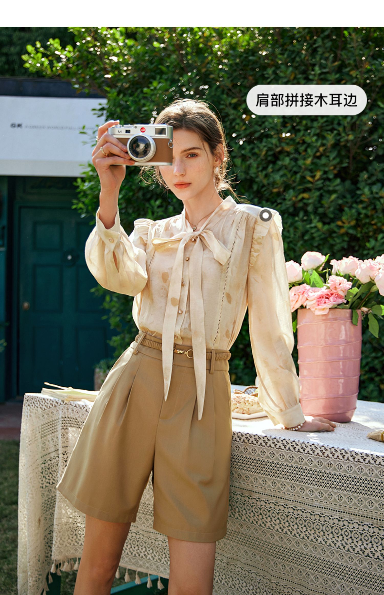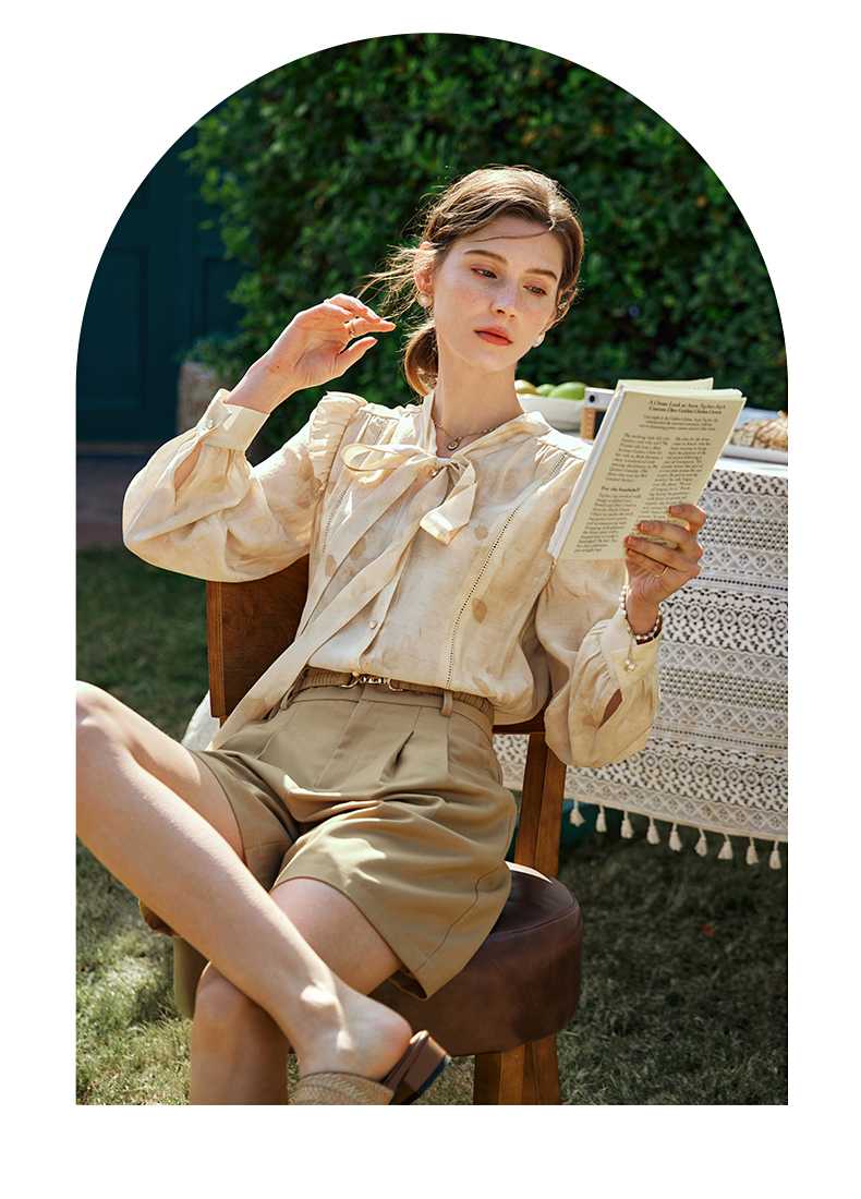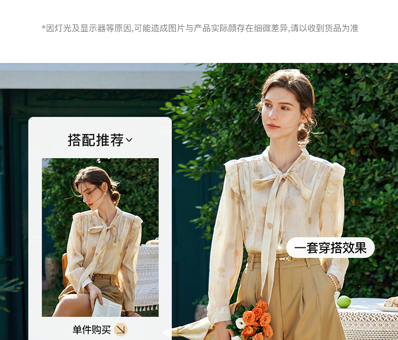 OLrain欧芮儿法式印花衬衫女早春2024年新款别致拼接木耳边上衣