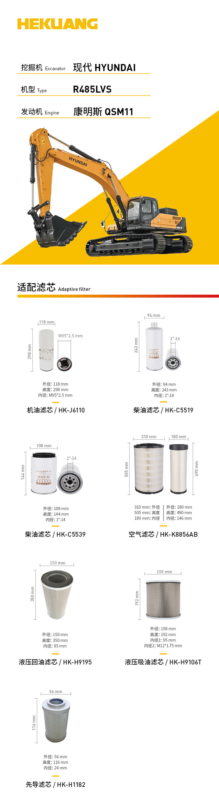 现代R485LVS(康明斯QSM11)挖掘机滤芯 机油柴油空气滤芯 液压油先导滤芯