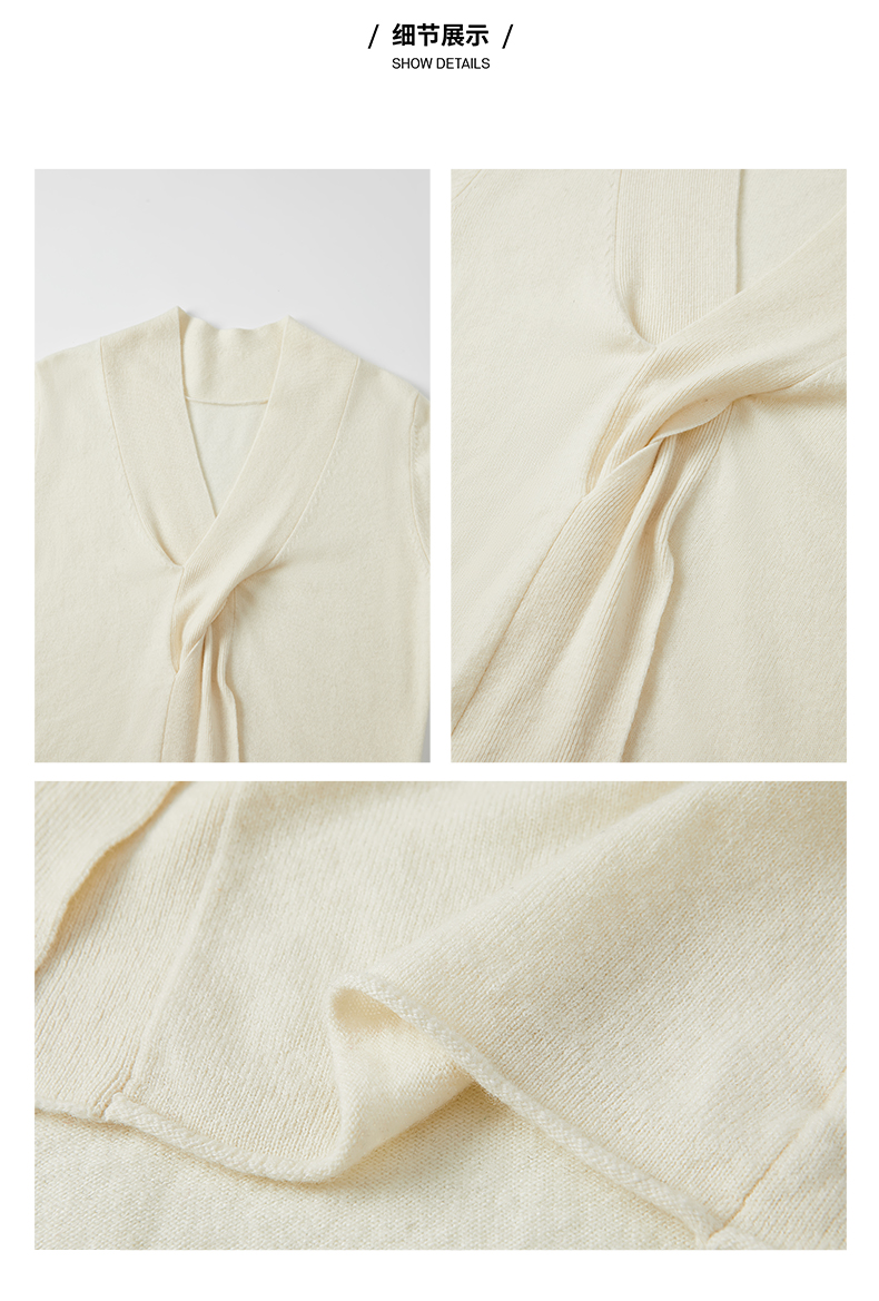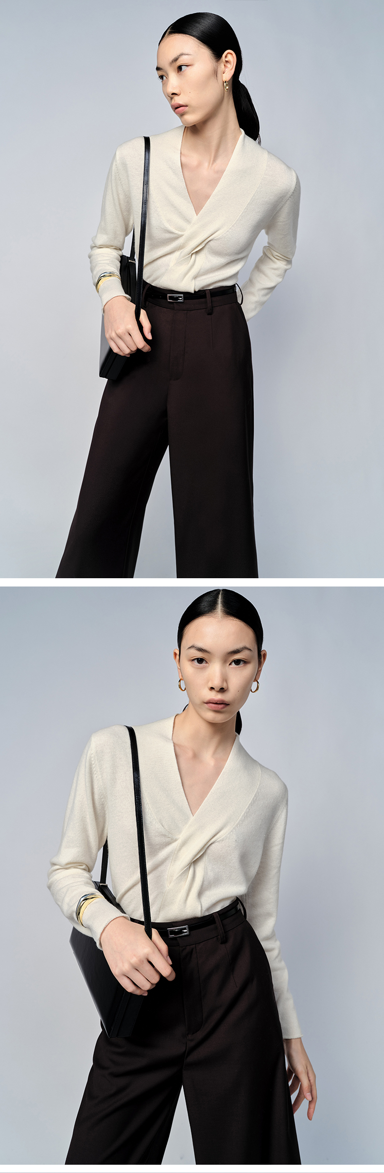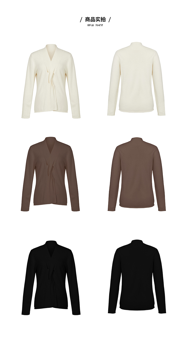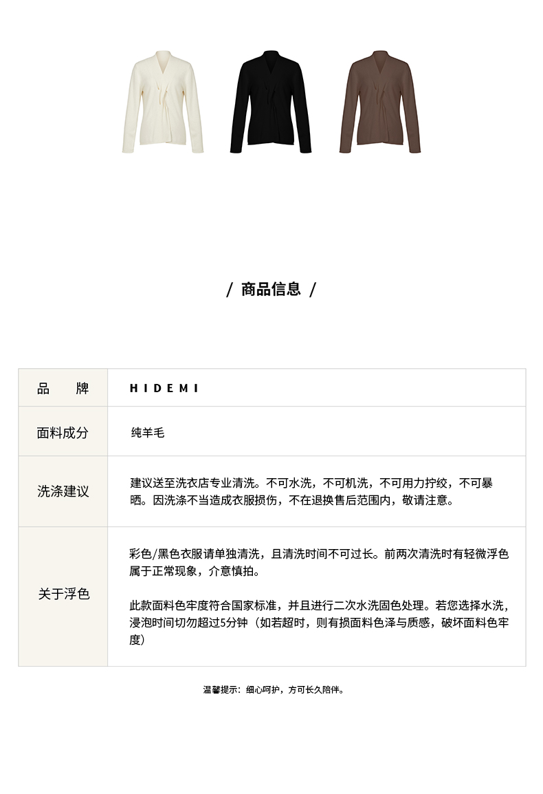 HIDEMI 美利奴超细羊毛立体交叉打结款V领修身毛衣 原白色/深摩卡/黑色