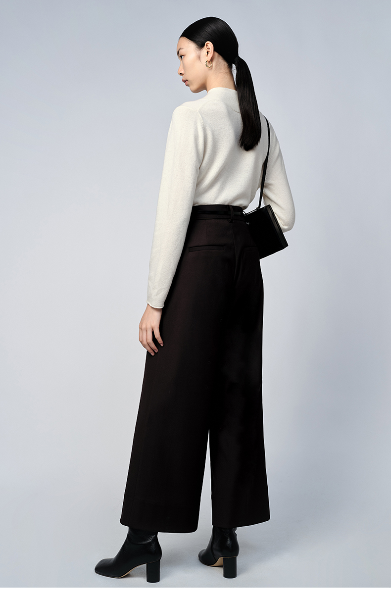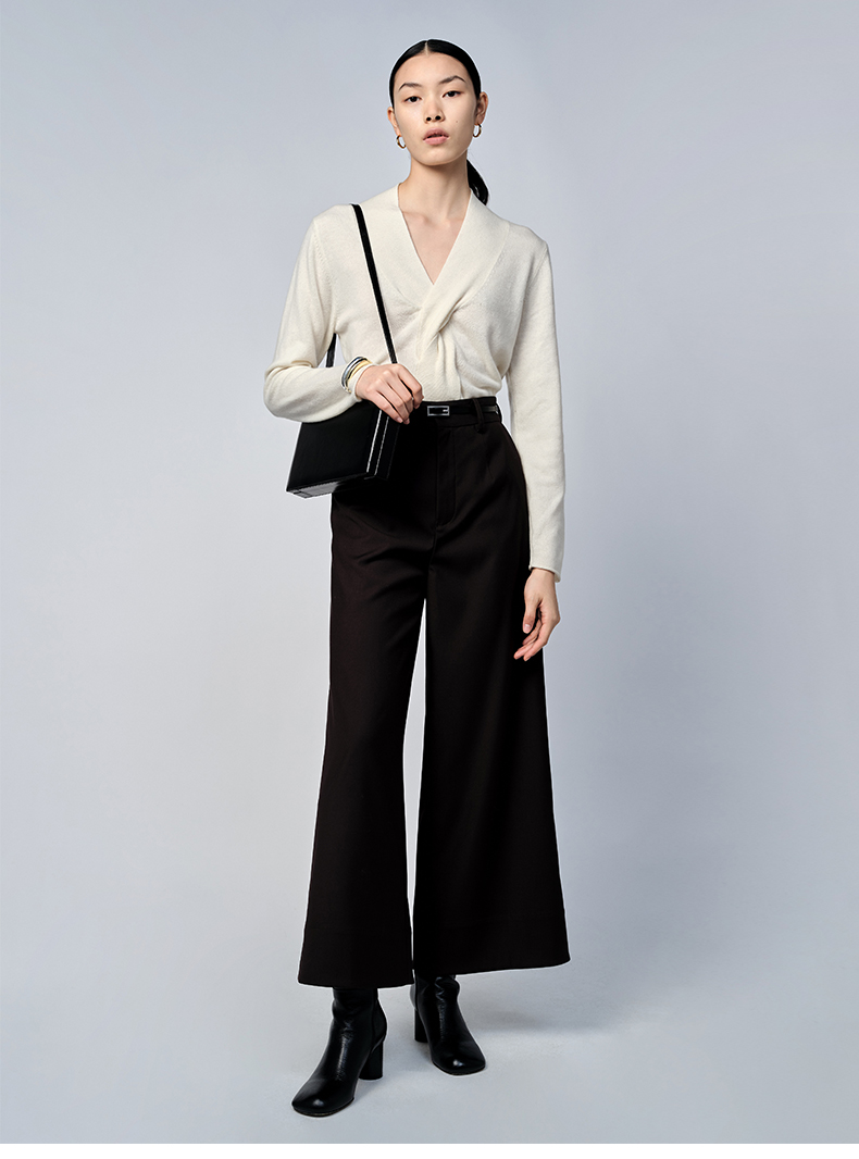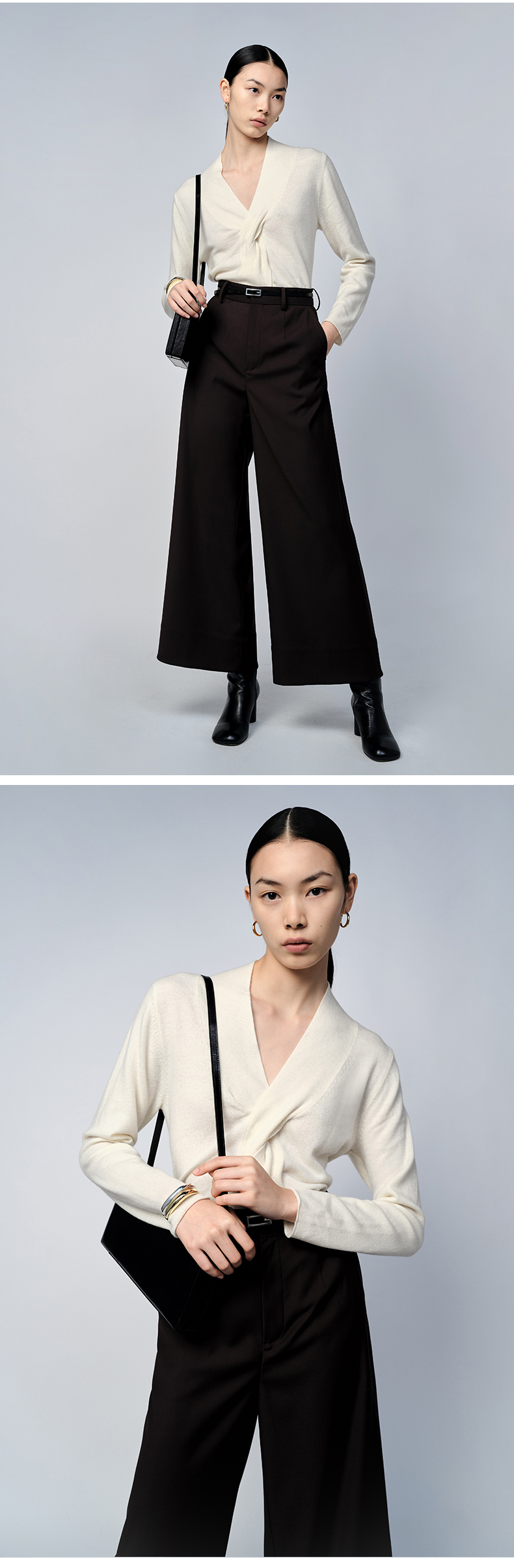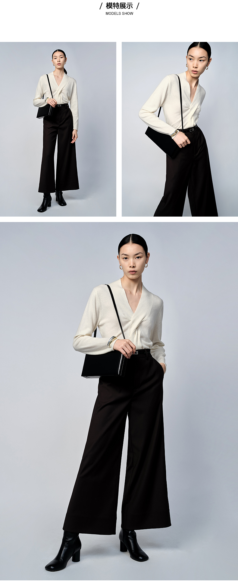 HIDEMI 美利奴超细羊毛立体交叉打结款V领修身毛衣 原白色/深摩卡/黑色