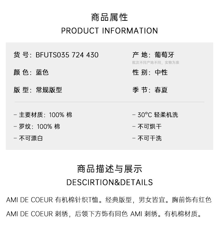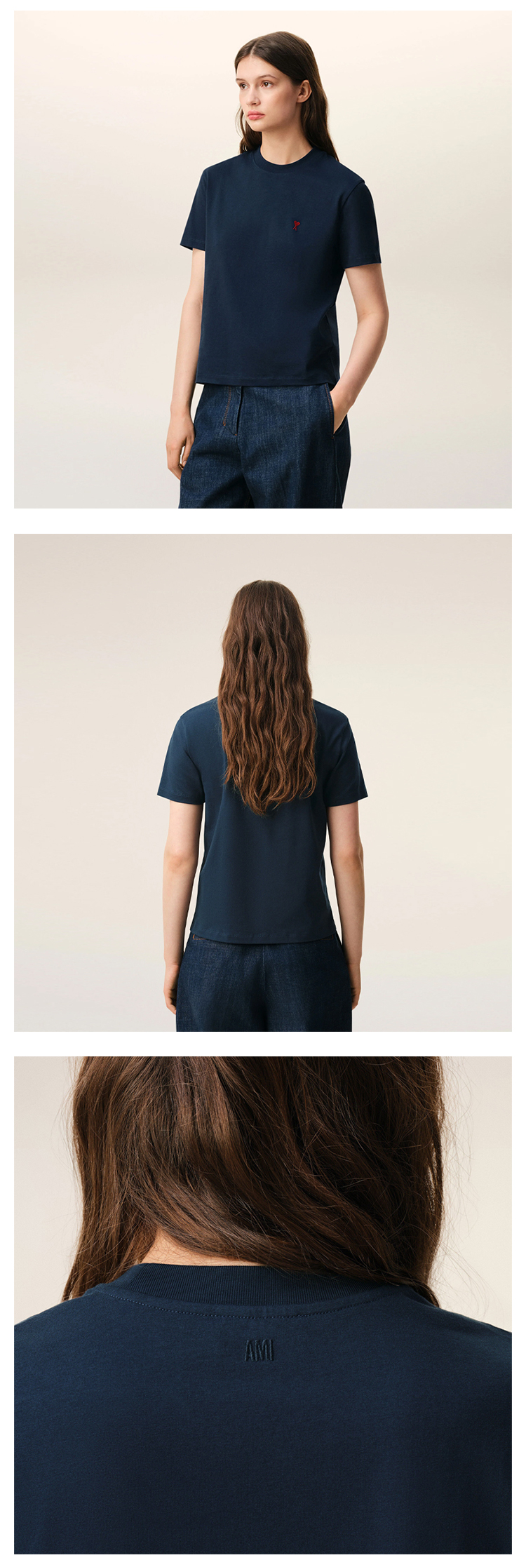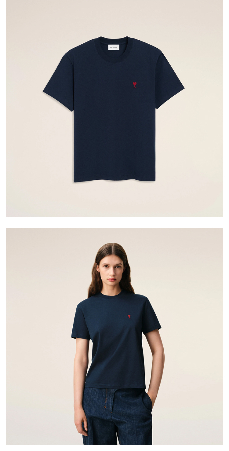 AMI PARIS 中性心形徽标刺绣棉质圆领短袖T恤 蓝色 BFUTS035 724 430