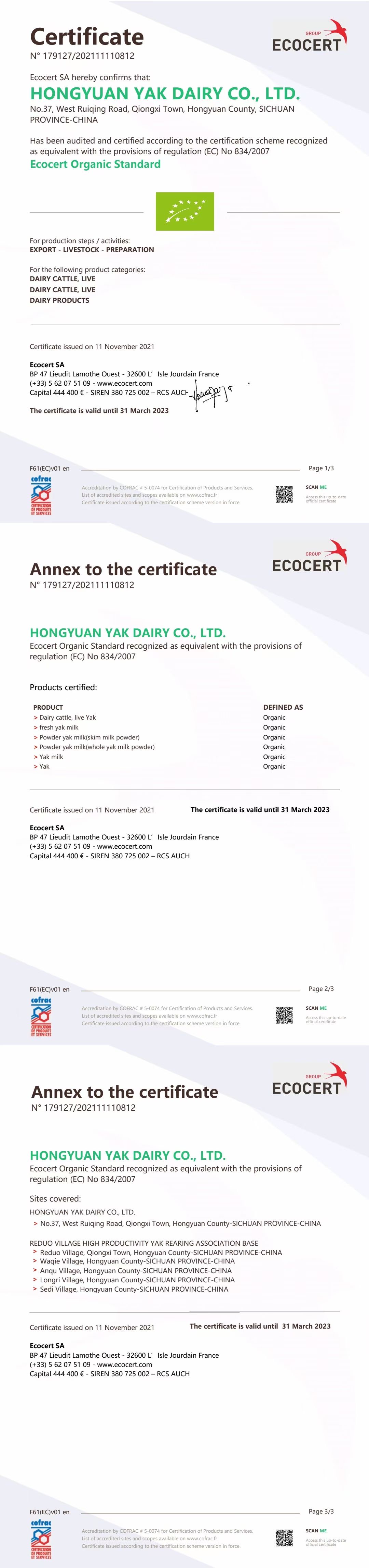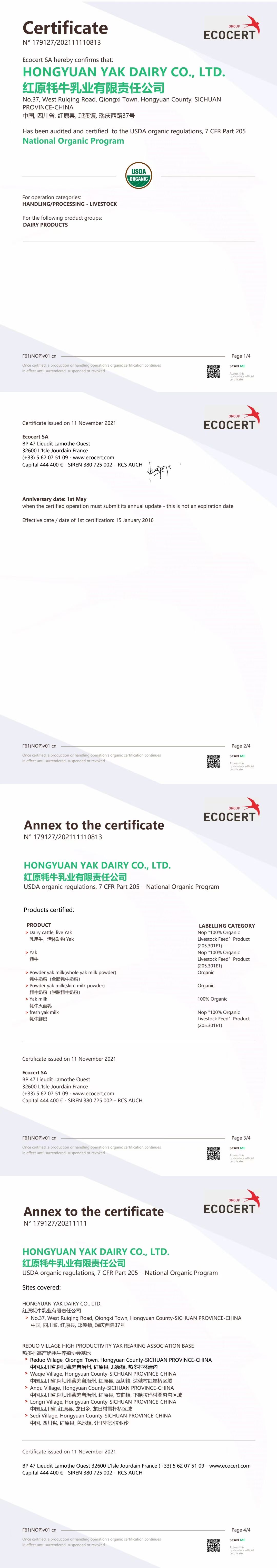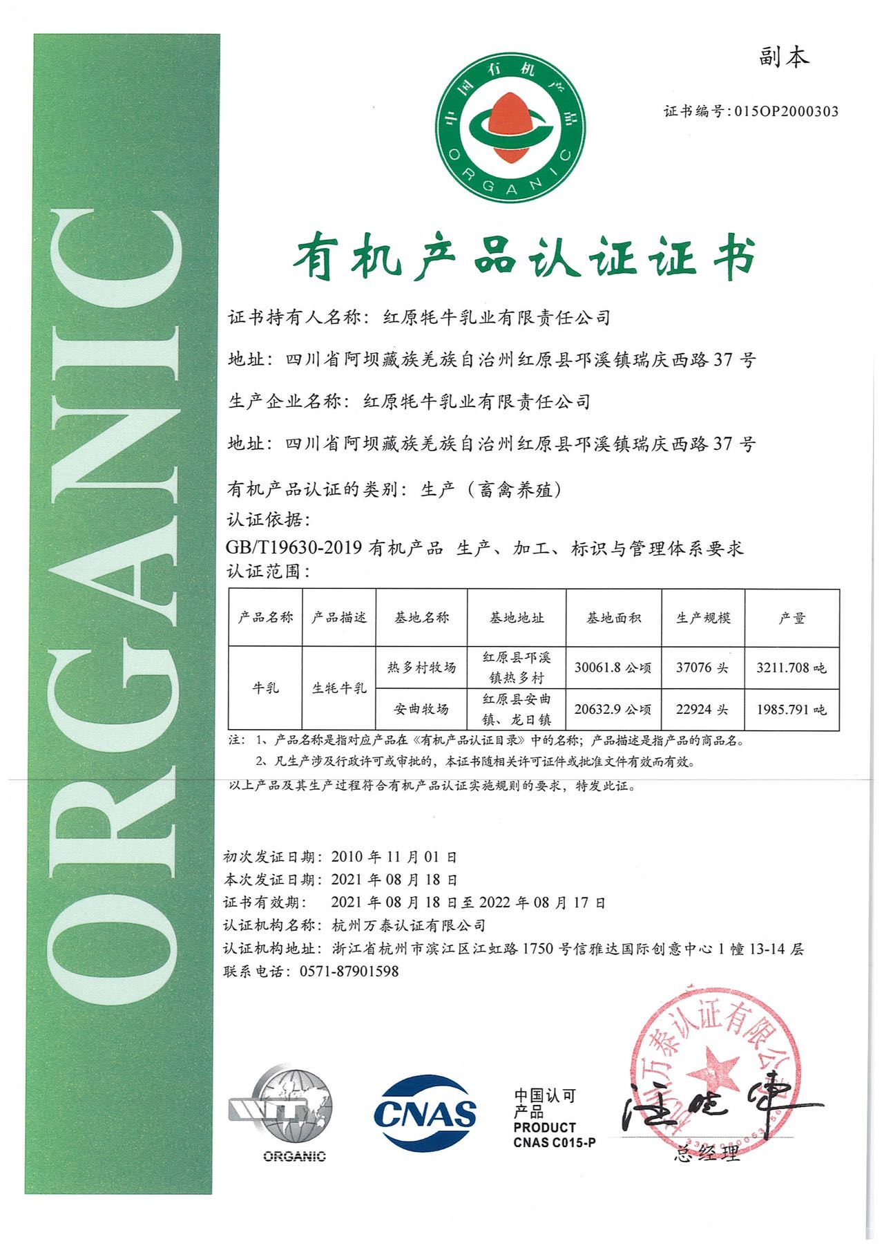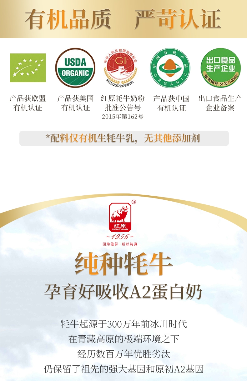 红原有机牦牛乳是中国唯一获得中国、欧盟、美国全程有机食品认证乳品。