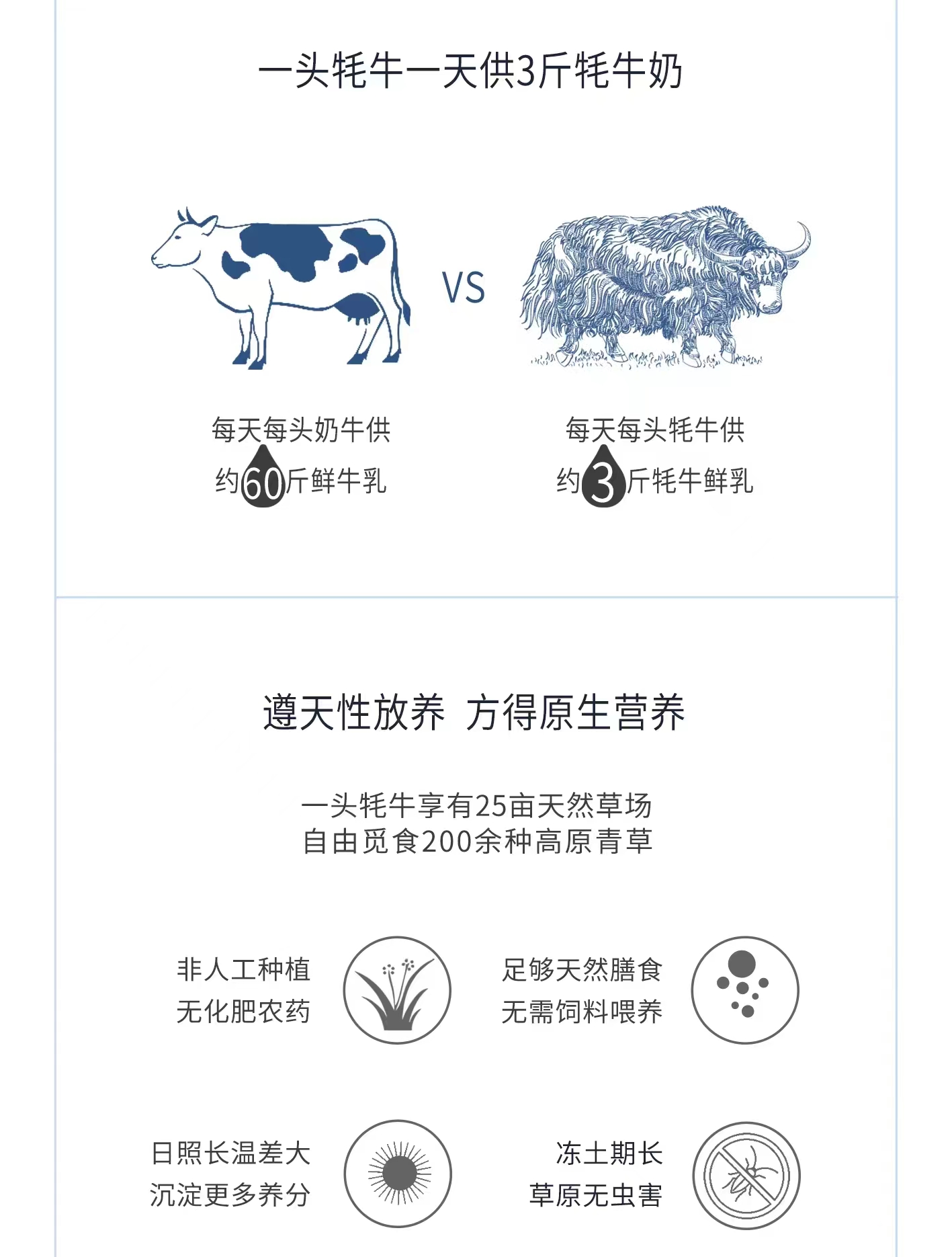 牦牛逐草而居,一生只吃天然牧草,产奶量和奶中营养物质含量遵循大自然的规矩,无任何人工干预。