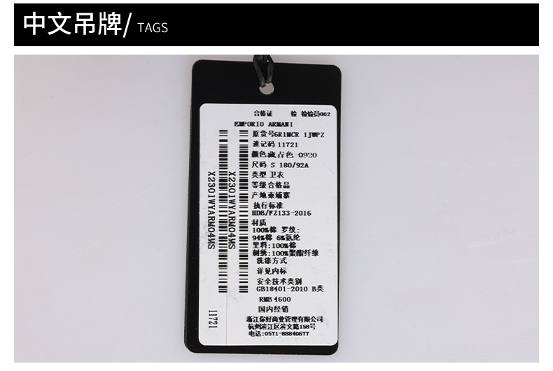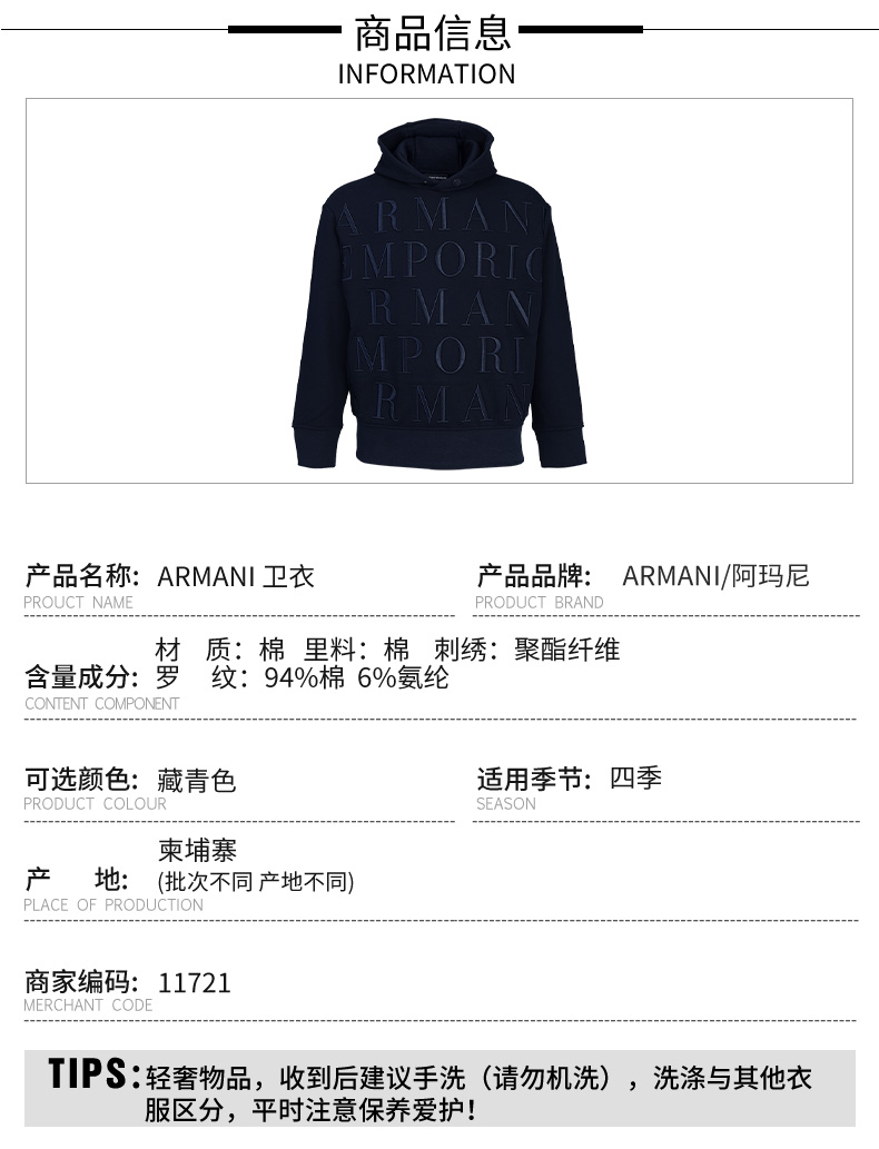Emporio Armani 阿玛尼 男士立体刺绣全棉连帽卫衣外套 11721