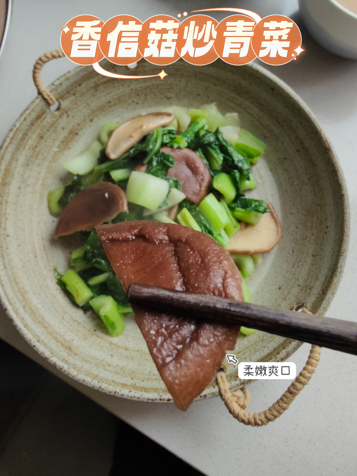 青菜的清香与菇香交织,香信菇吃起来柔嫩爽口,菇香浓郁,强烈大家来尝哈!