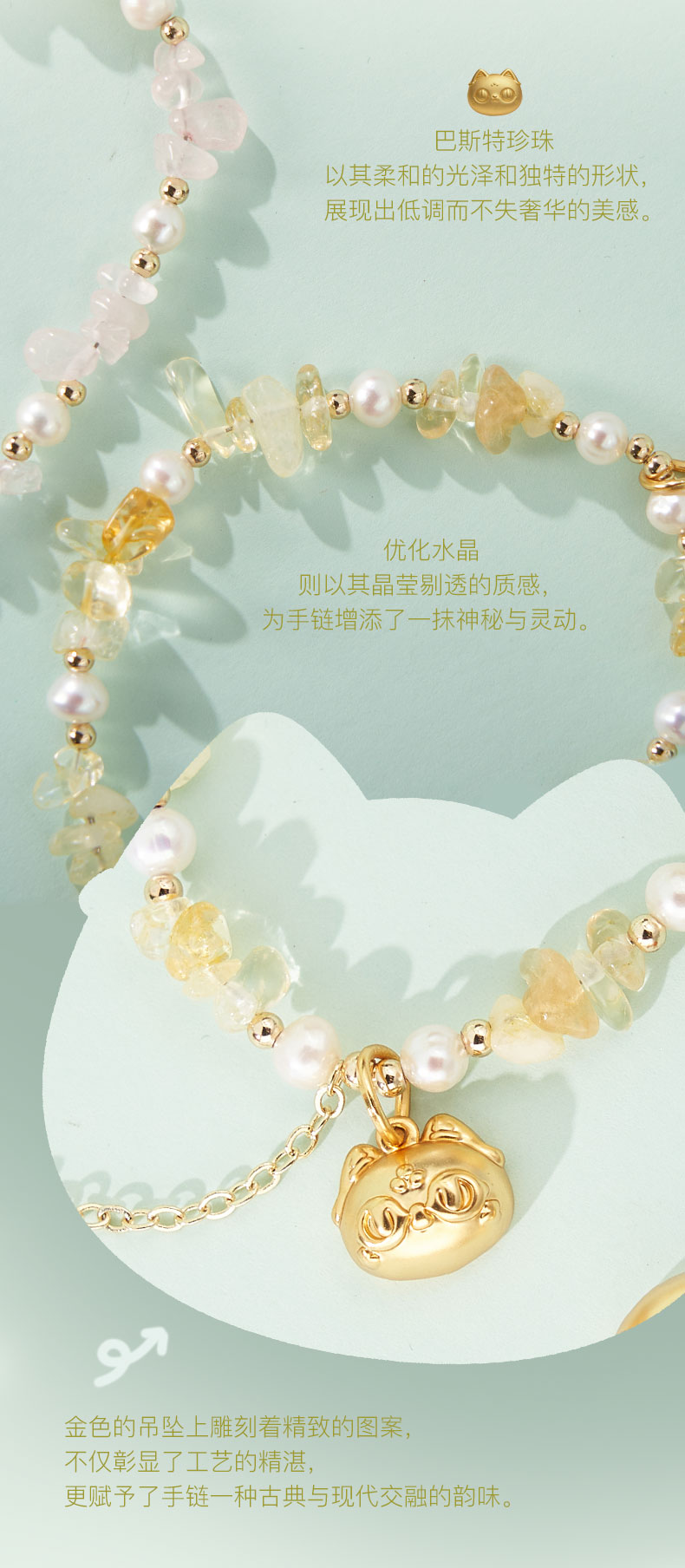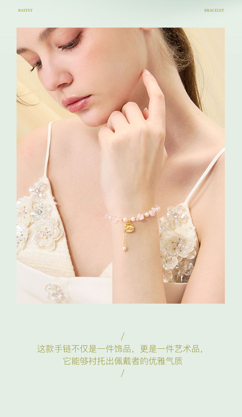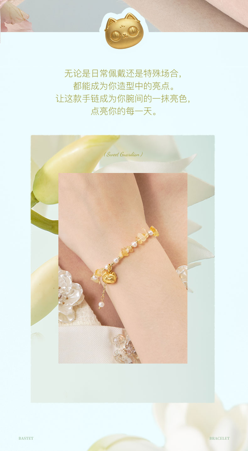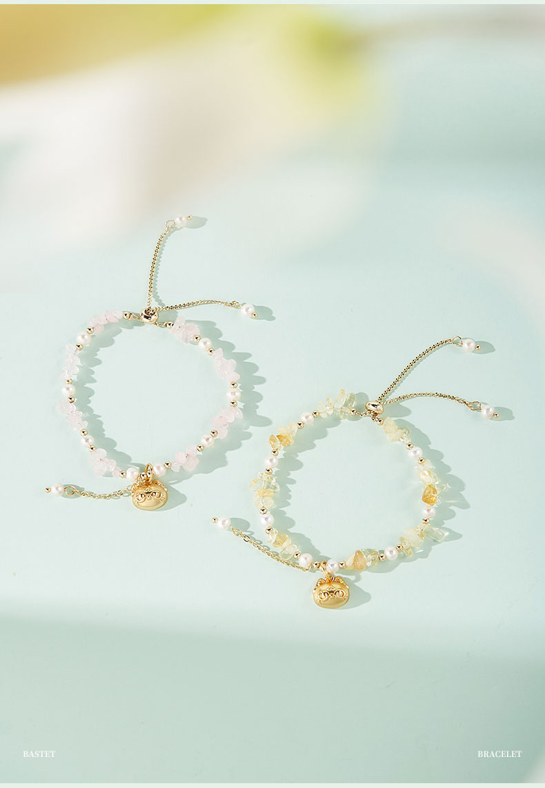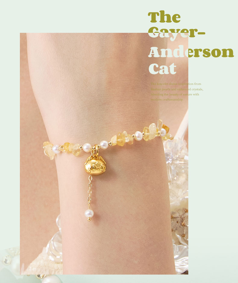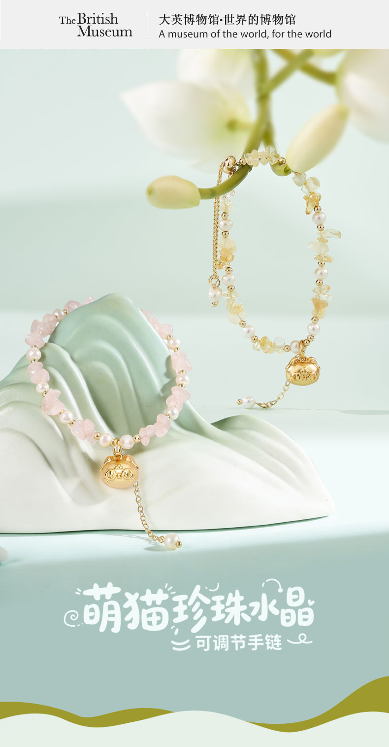 大英博物馆 盖亚·巴斯特系列 萌猫珍珠水晶可调节手链 黄色 粉色